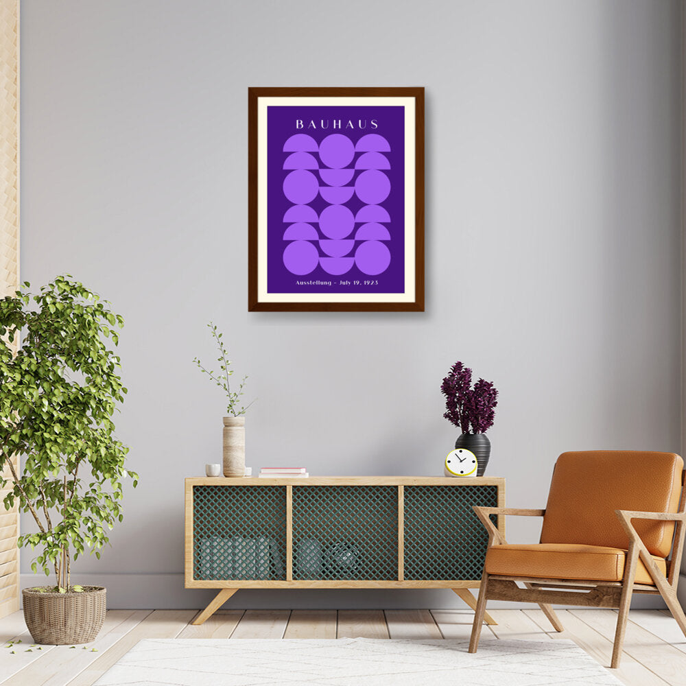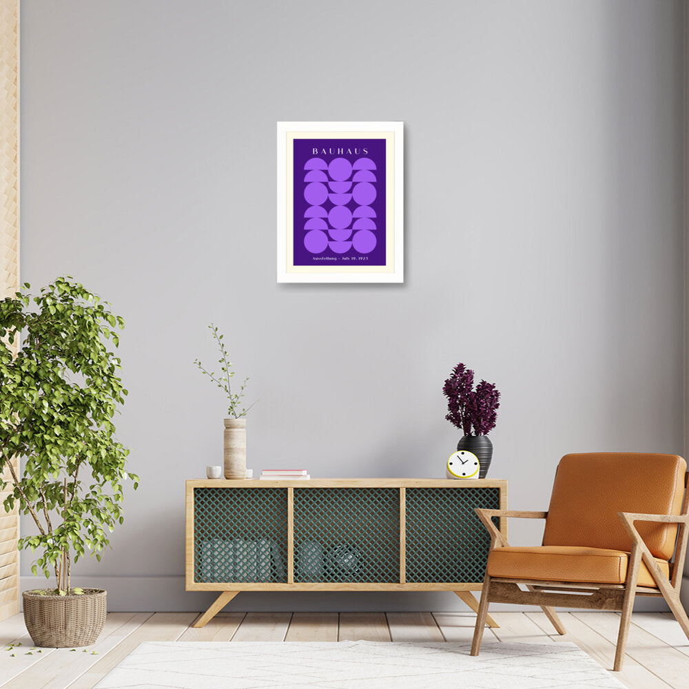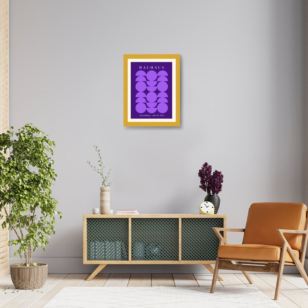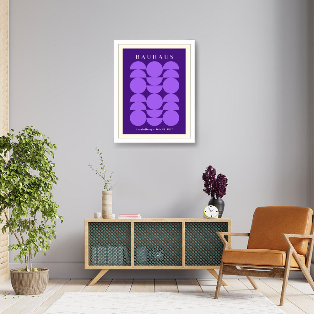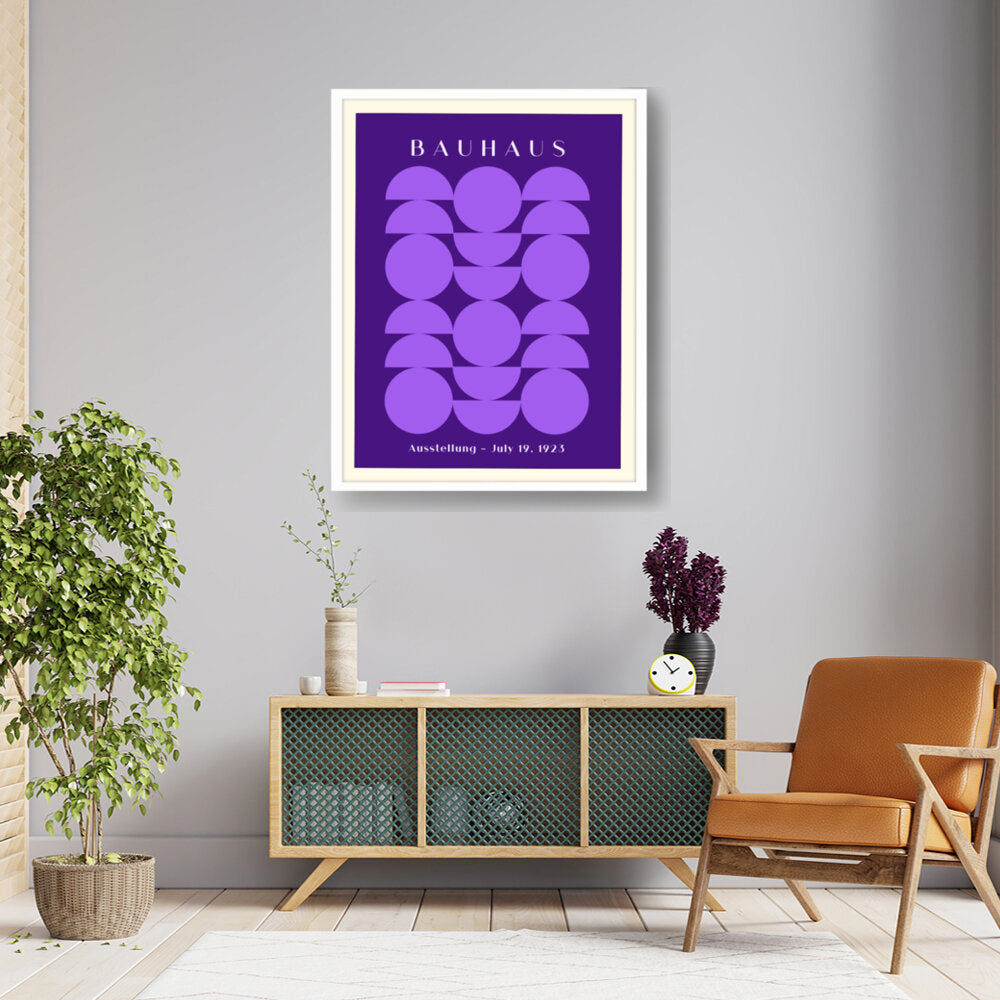 This Bauhaus exhibition poster features bold geometric shapes in vibrant purple, encapsulating the essence of modern design. The artwork reflects the pioneering spirit of the Bauhaus movement, making it a striking addition to any contemporary space.