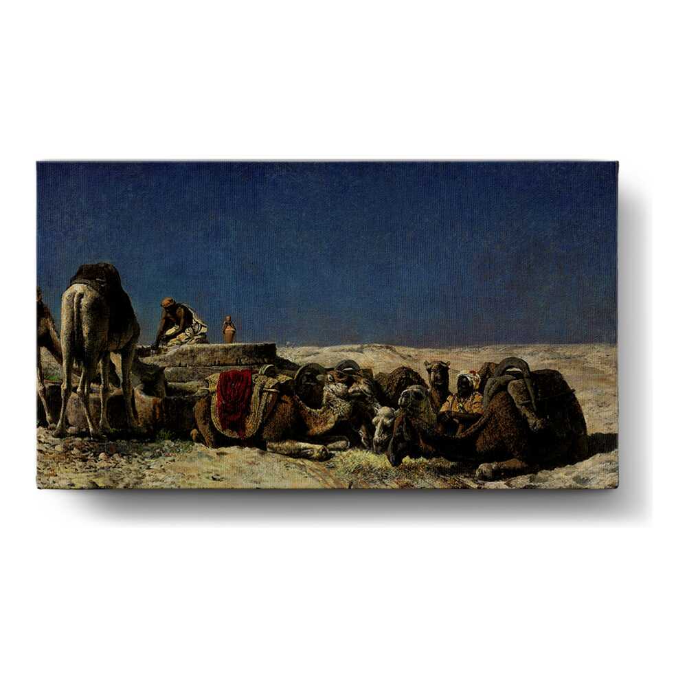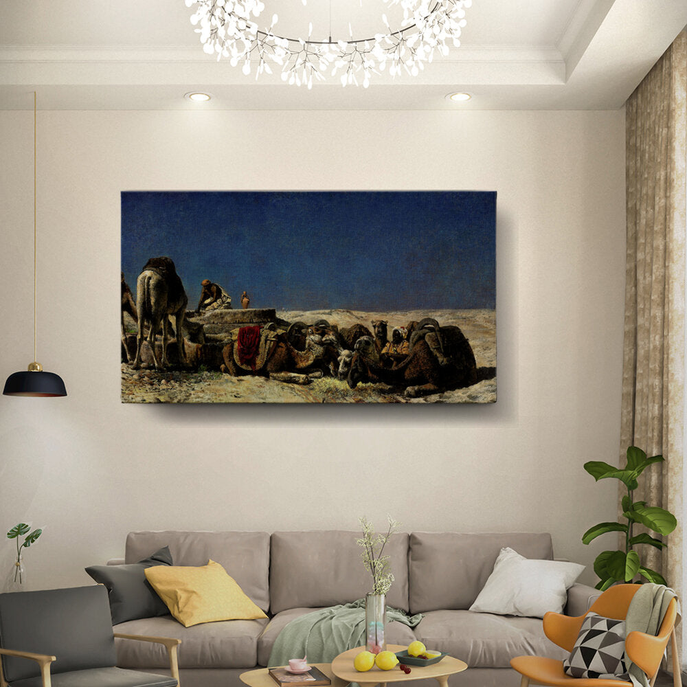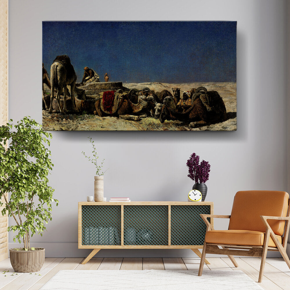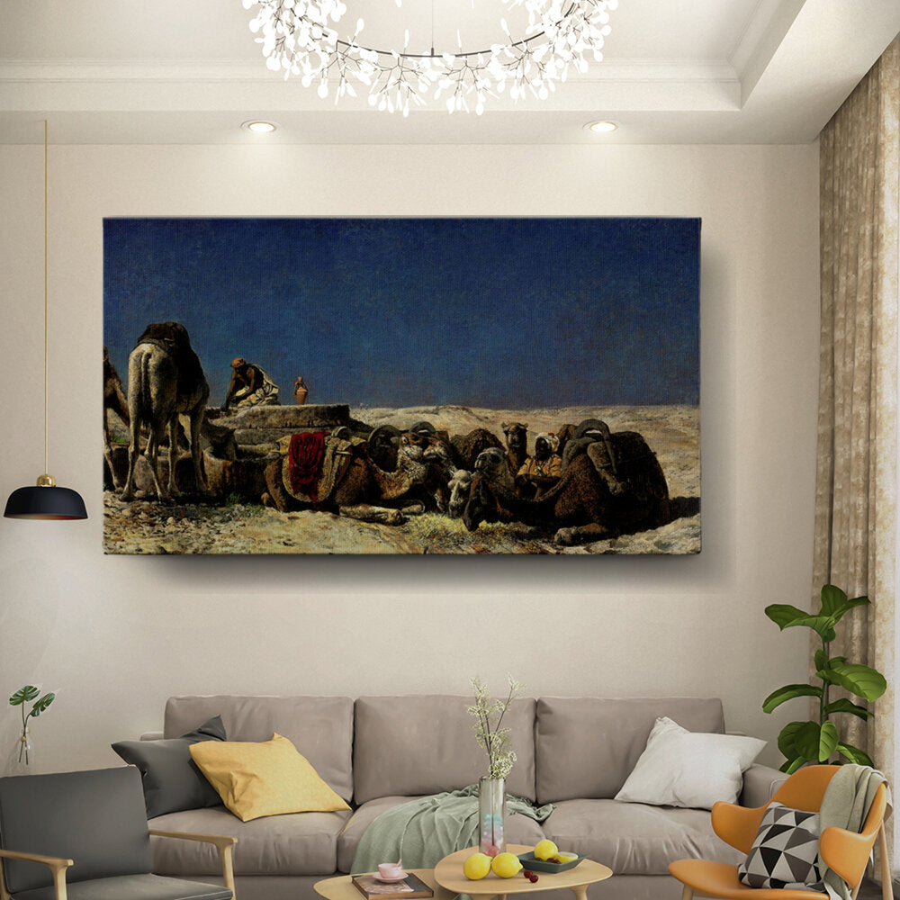 This captivating oil painting depicts a serene moment in a desert landscape, where a camel caravan takes a break. The rich details of the camels and the human figures offer a glimpse into the life of nomadic travelers. The vast sky adds to the sense of open space and tranquility.