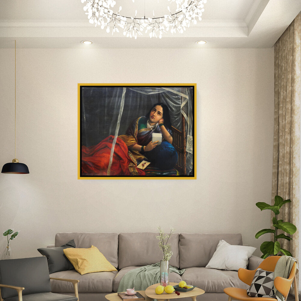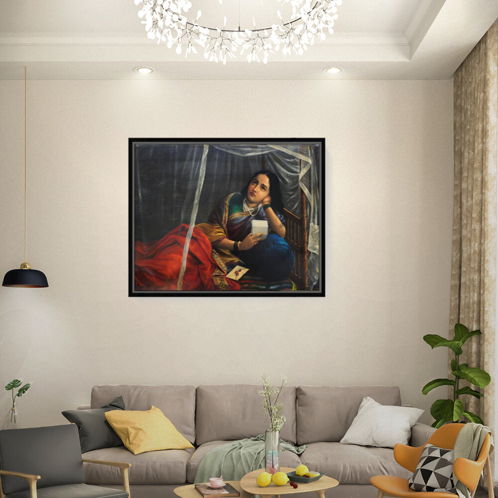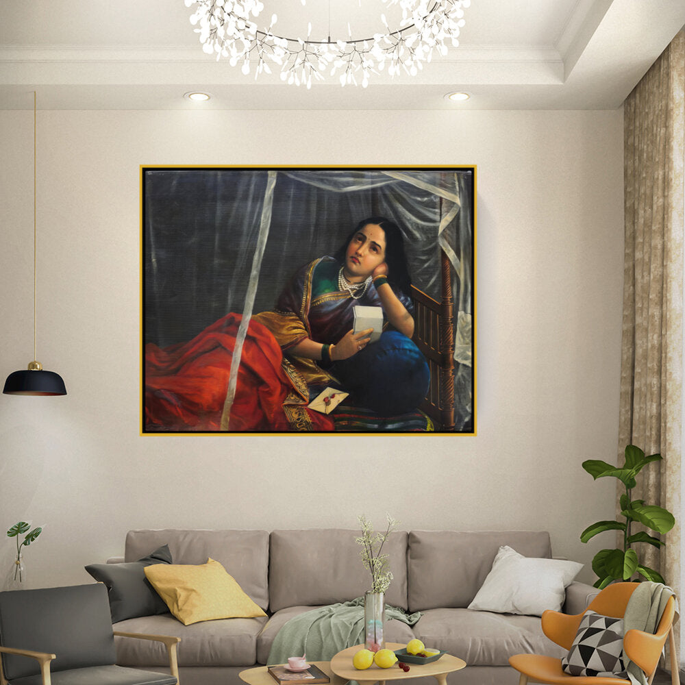 This artwork beautifully depicts a contemplative woman in traditional Indian attire, capturing her emotions and the cultural essence of India. The use of rich colors and detailed textures enhances the sense of realism, making it a perfect centerpiece for any modern or traditional home.