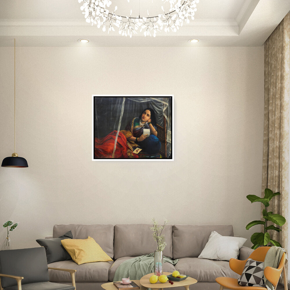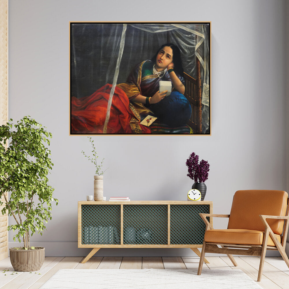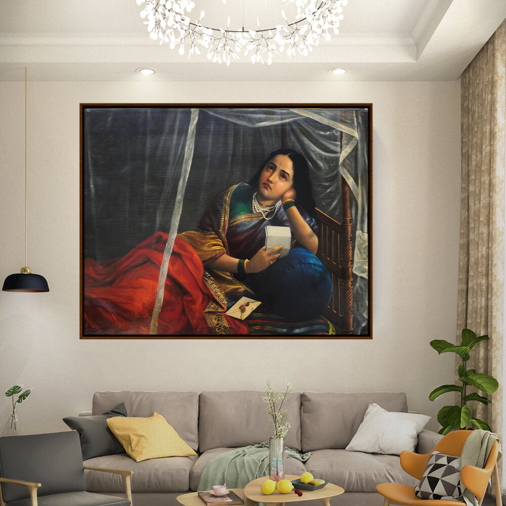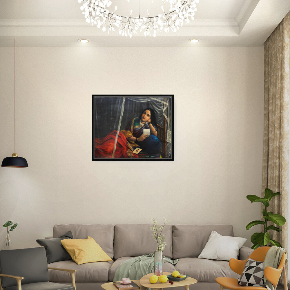 This artwork beautifully depicts a contemplative woman in traditional Indian attire, capturing her emotions and the cultural essence of India. The use of rich colors and detailed textures enhances the sense of realism, making it a perfect centerpiece for any modern or traditional home.