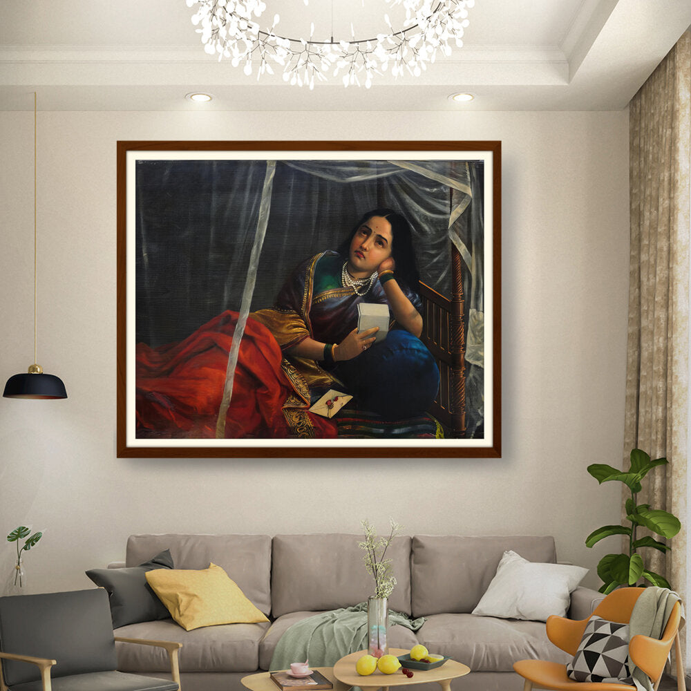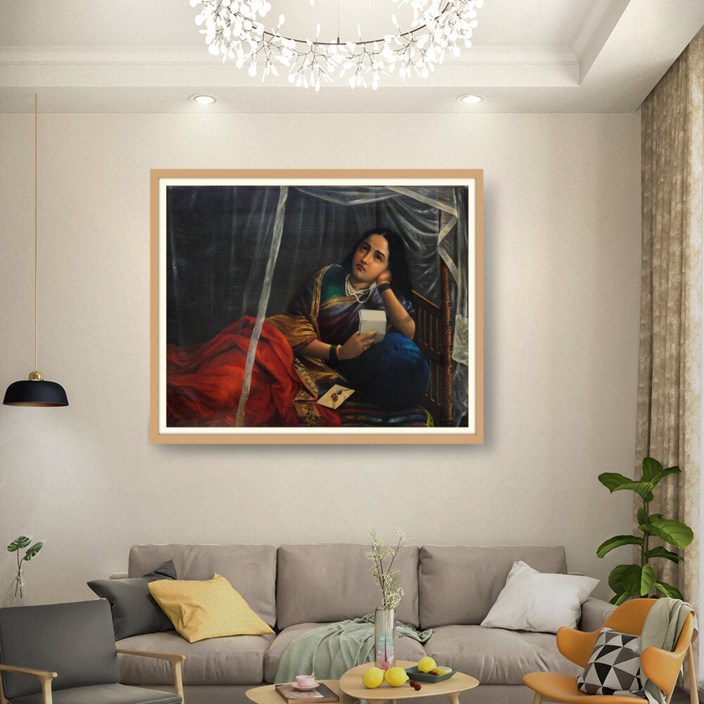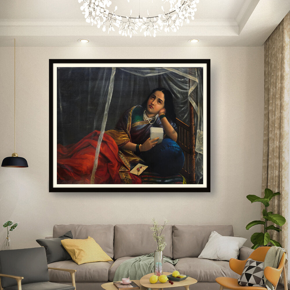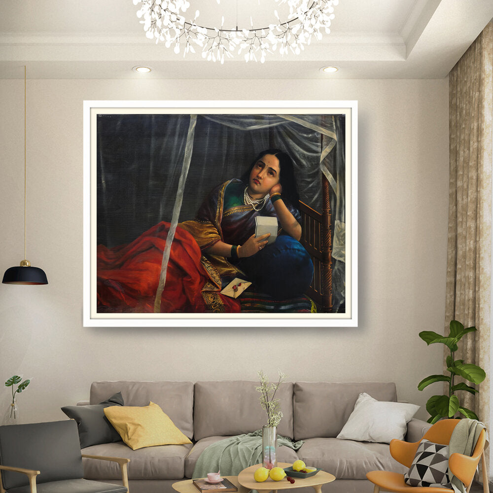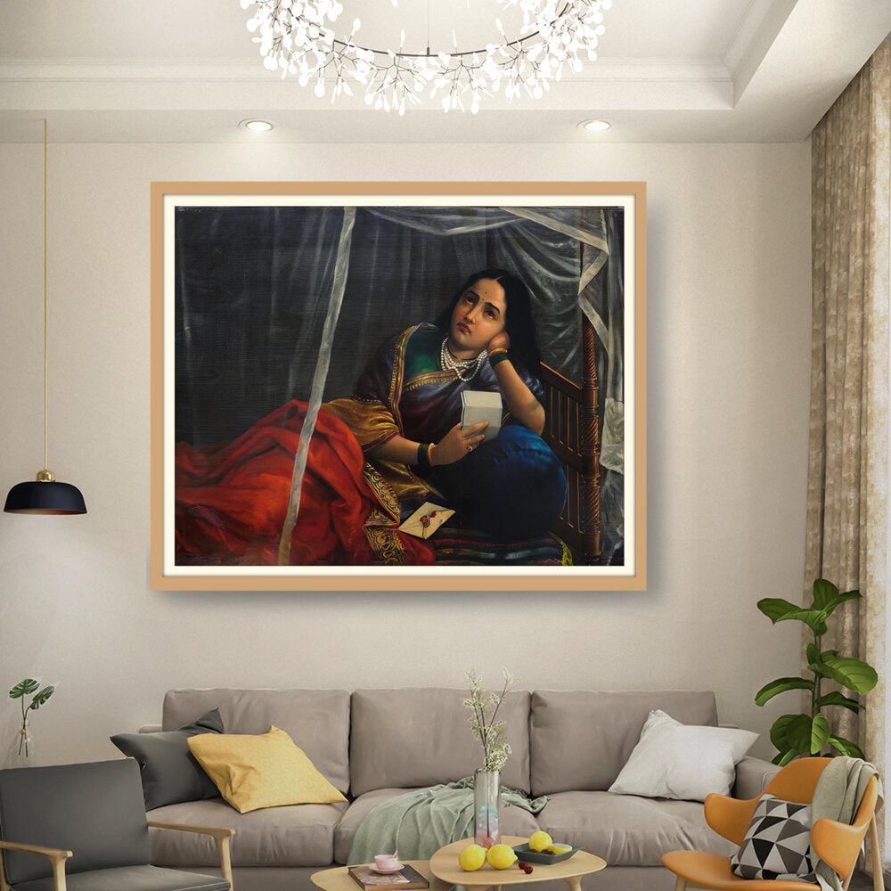 This artwork beautifully depicts a contemplative woman in traditional Indian attire, capturing her emotions and the cultural essence of India. The use of rich colors and detailed textures enhances the sense of realism, making it a perfect centerpiece for any modern or traditional home.