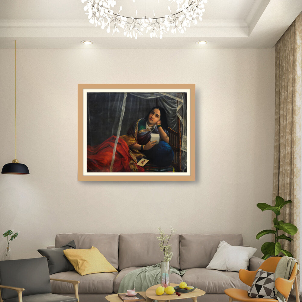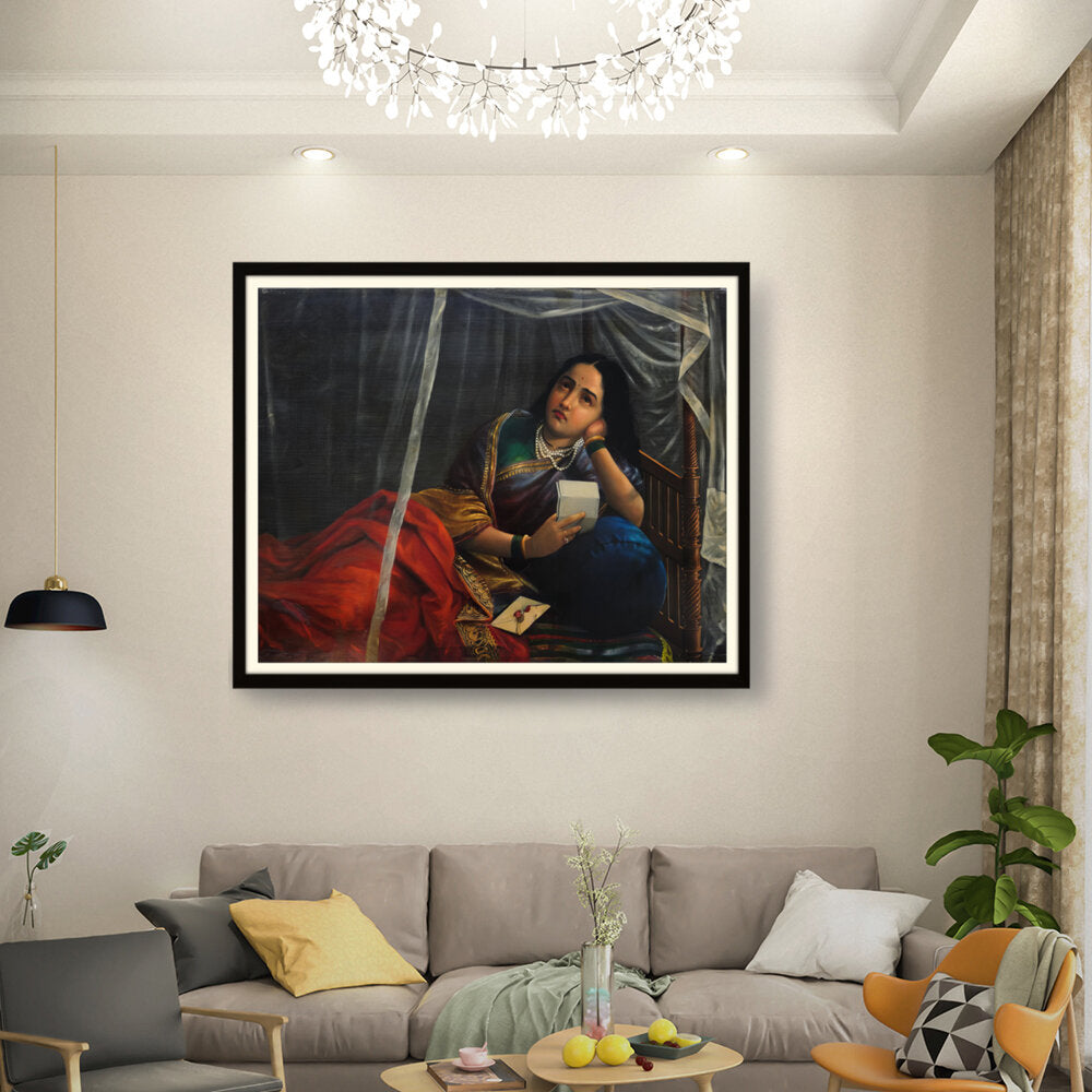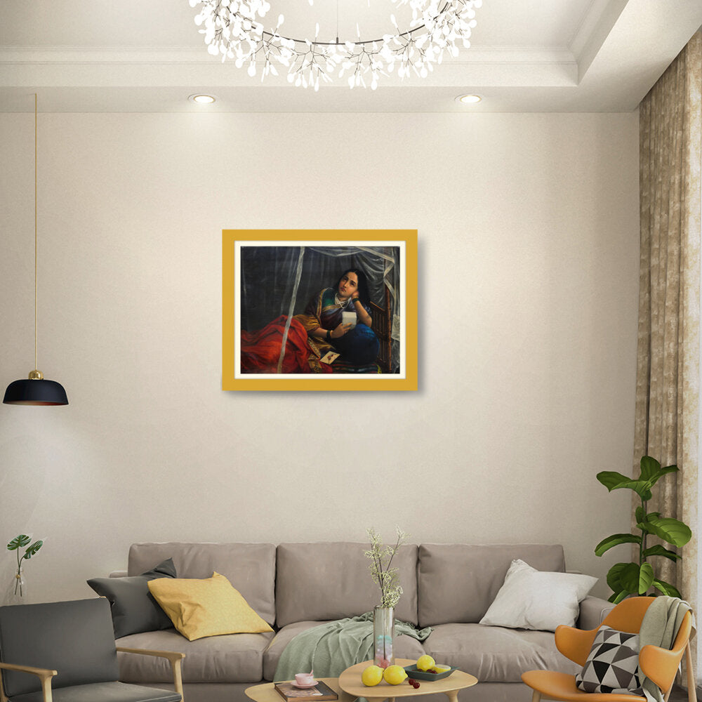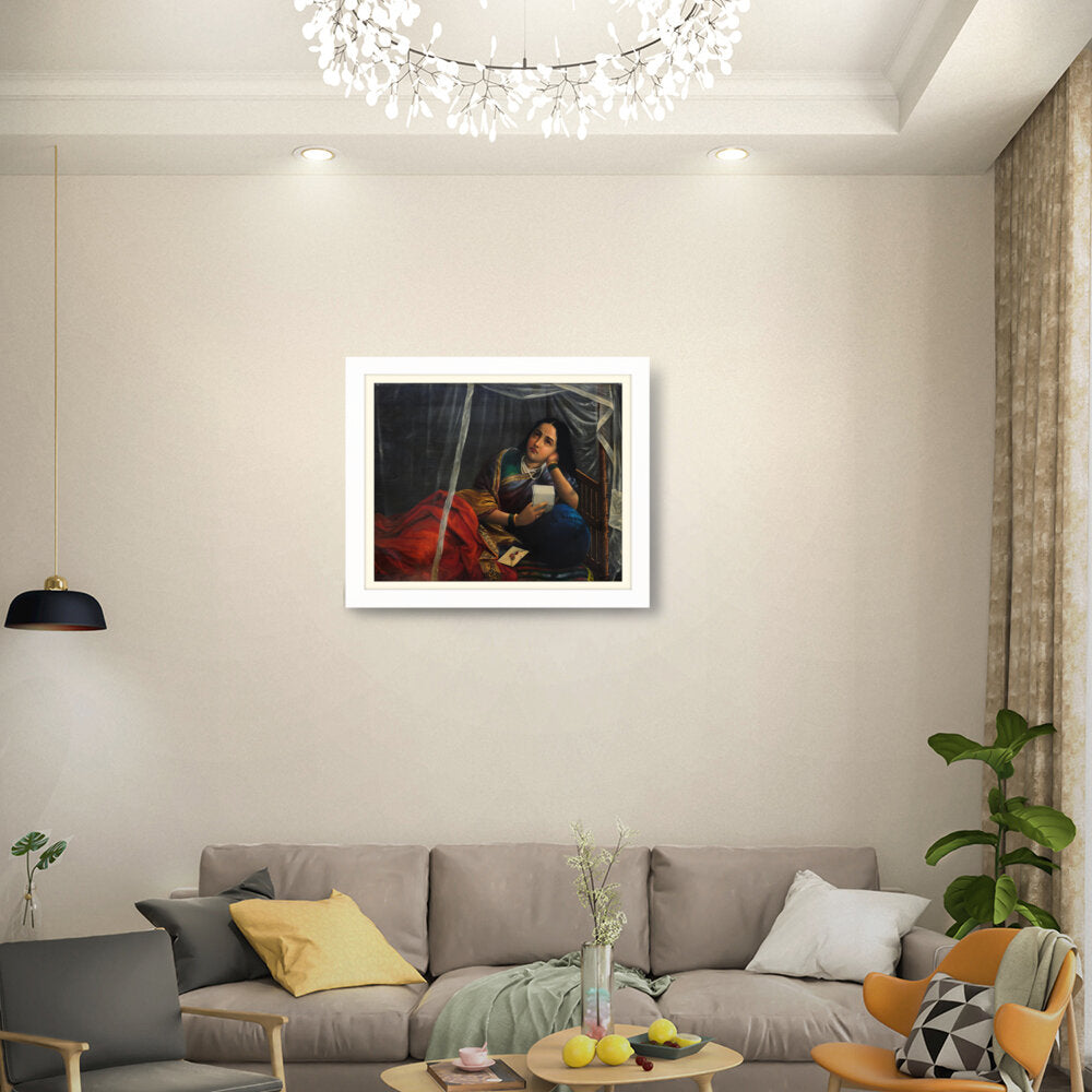 This artwork beautifully depicts a contemplative woman in traditional Indian attire, capturing her emotions and the cultural essence of India. The use of rich colors and detailed textures enhances the sense of realism, making it a perfect centerpiece for any modern or traditional home.