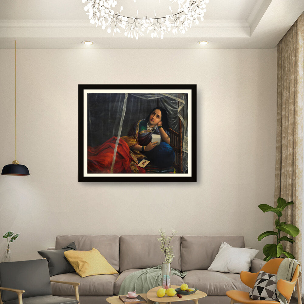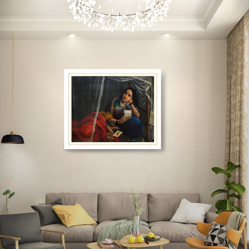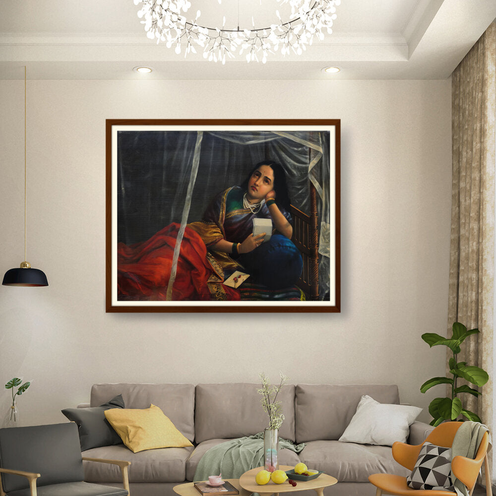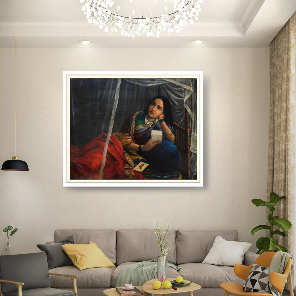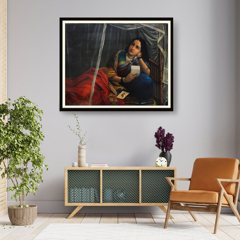 This artwork beautifully depicts a contemplative woman in traditional Indian attire, capturing her emotions and the cultural essence of India. The use of rich colors and detailed textures enhances the sense of realism, making it a perfect centerpiece for any modern or traditional home.