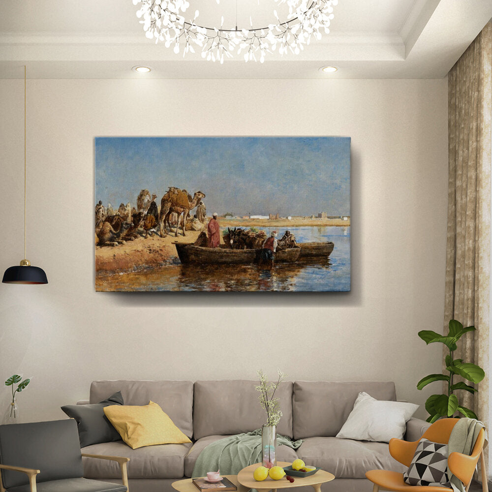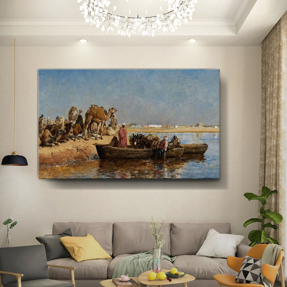 This artwork captures a serene moment of trade and transportation by the river, featuring camels and boats against a vast landscape. The vibrant colors and detailed representation invite viewers to experience the harmony of desert life.