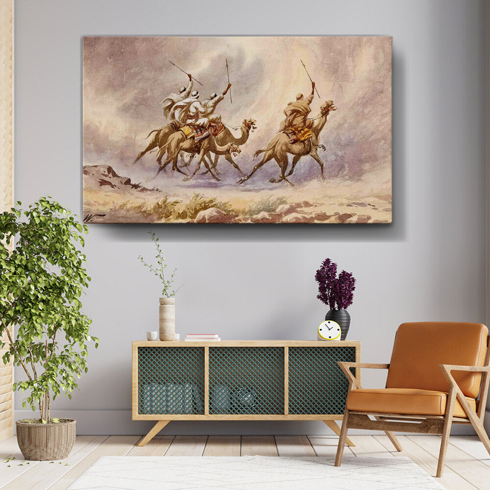 This captivating watercolor painting portrays a group of riders navigating a desert landscape, showcasing the beauty of movement and adventure. The delicate brushwork and soft color palette evoke a sense of freedom and exploration, making it a perfect addition for any living space.