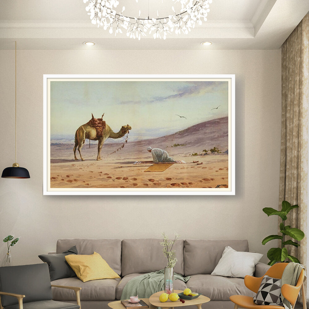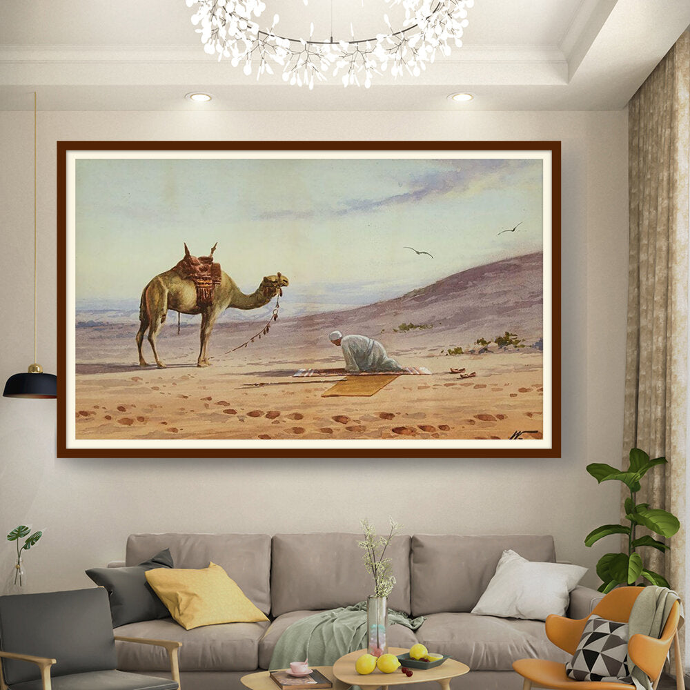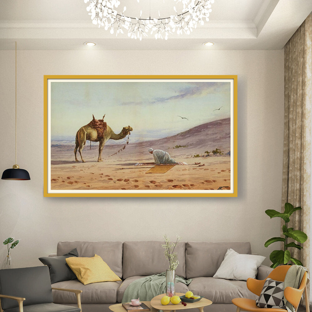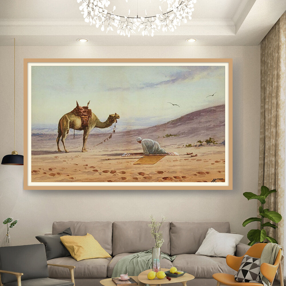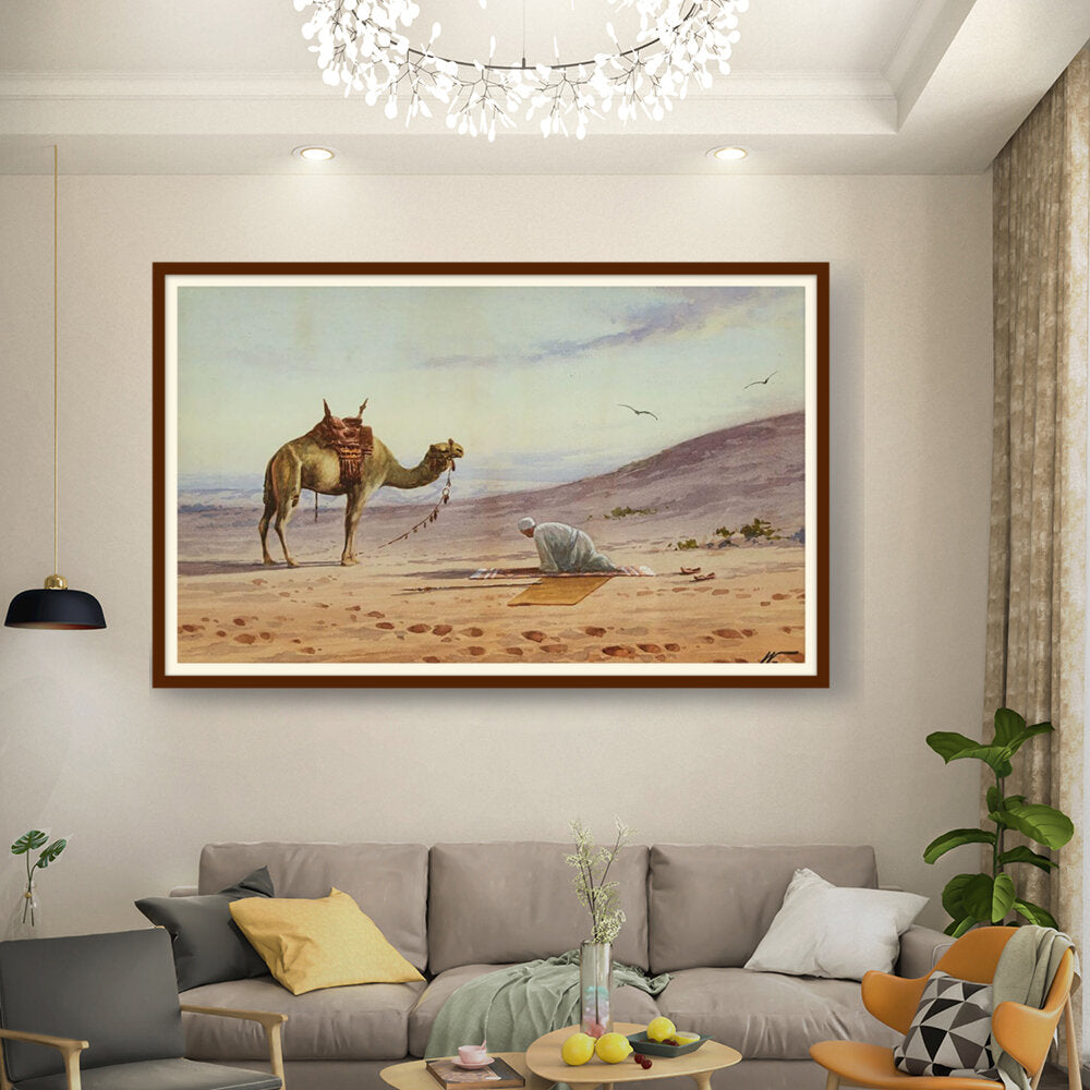 This captivating watercolor portrays a tranquil moment in the desert, featuring a lone figure in prayer alongside a majestic camel. The soft hues and gentle brushwork invite viewers to connect with the serene atmosphere of the arid landscape.