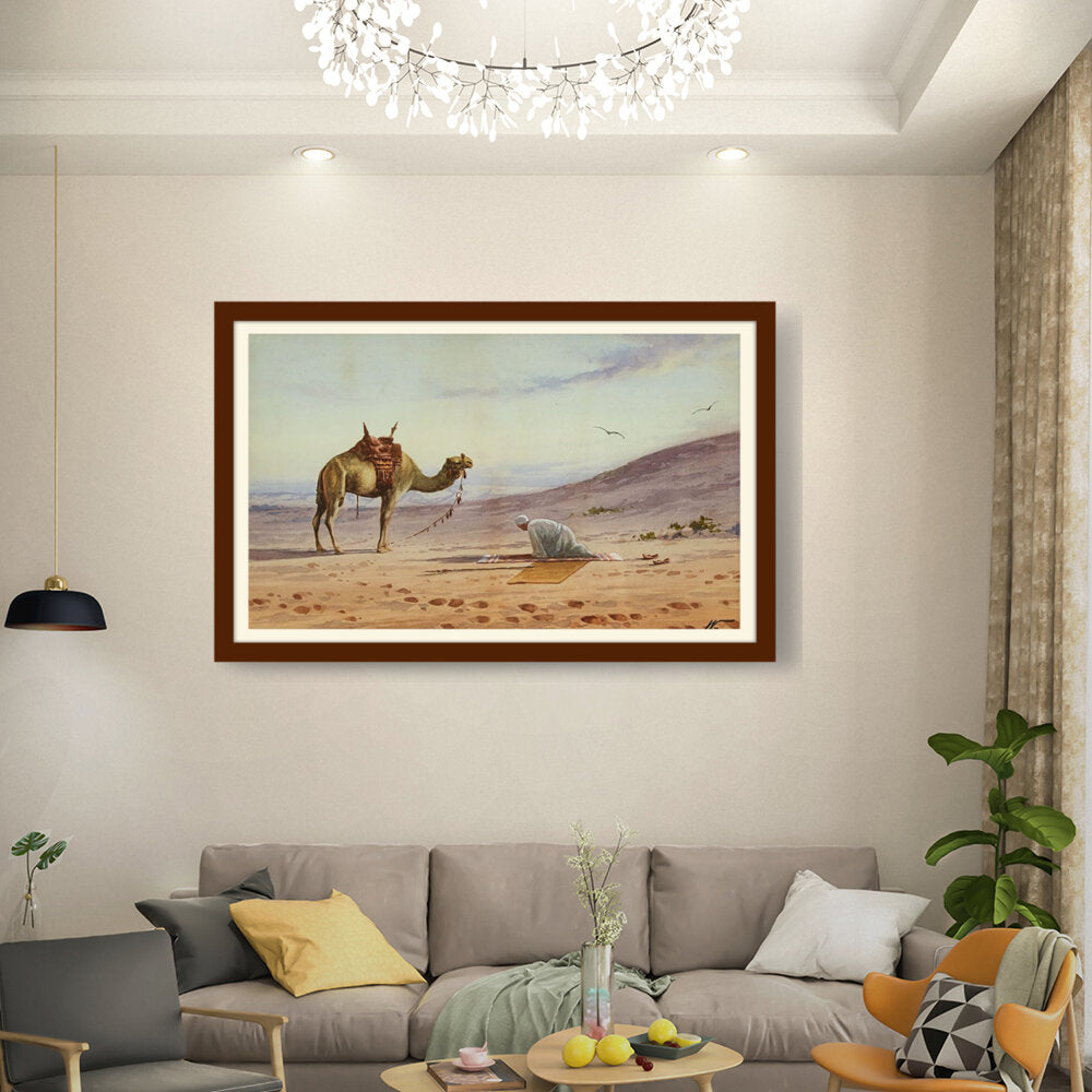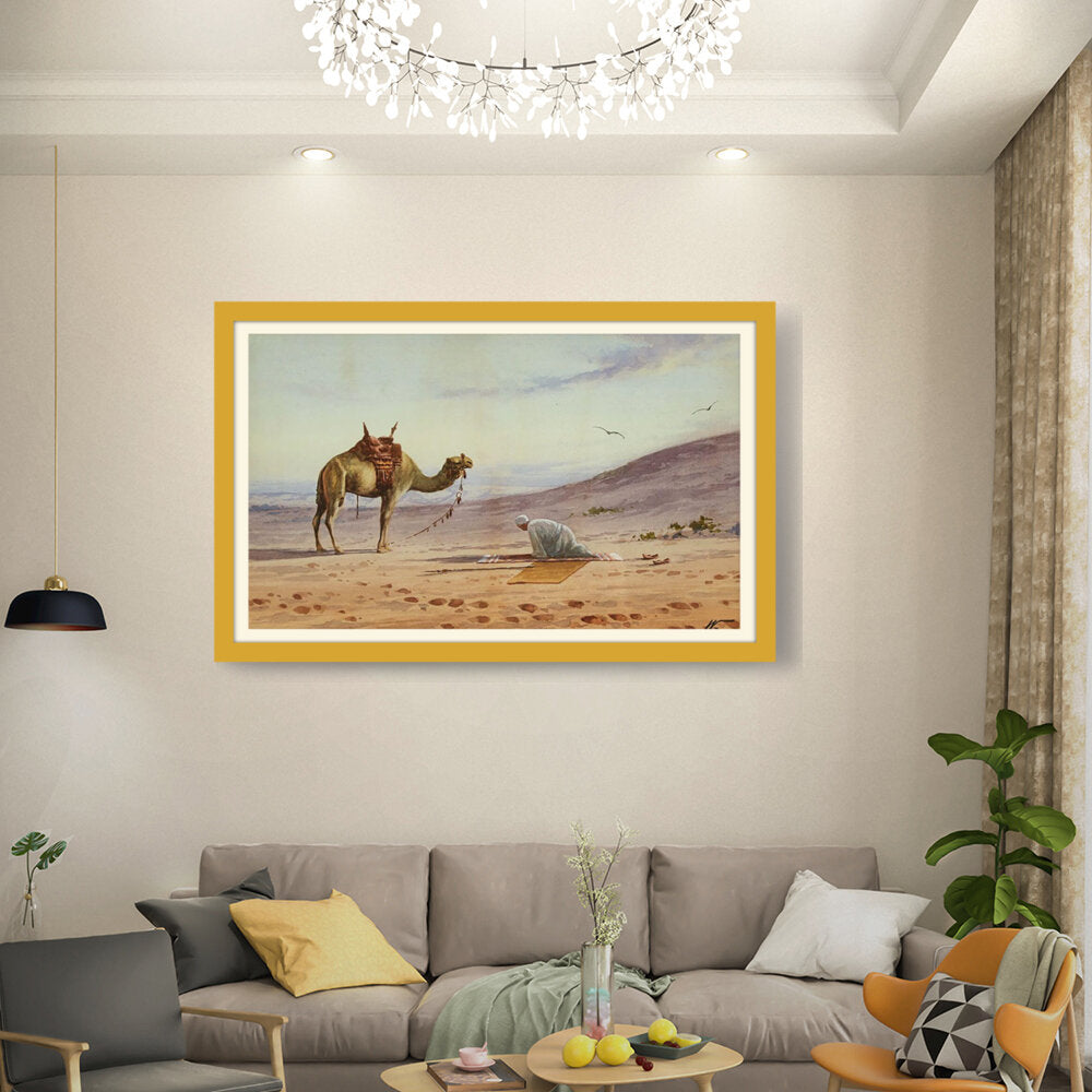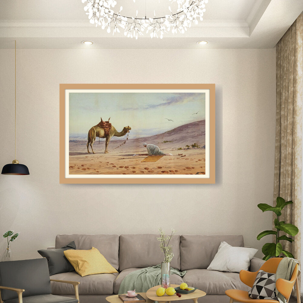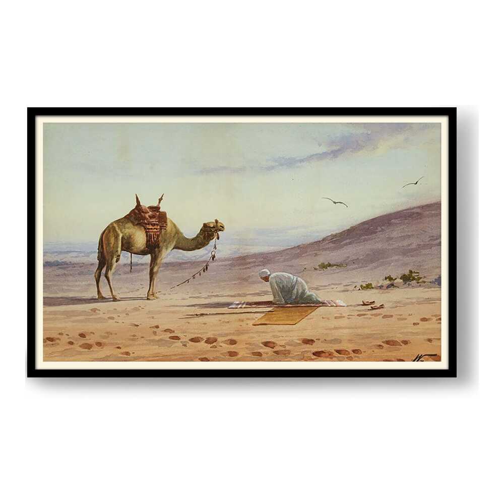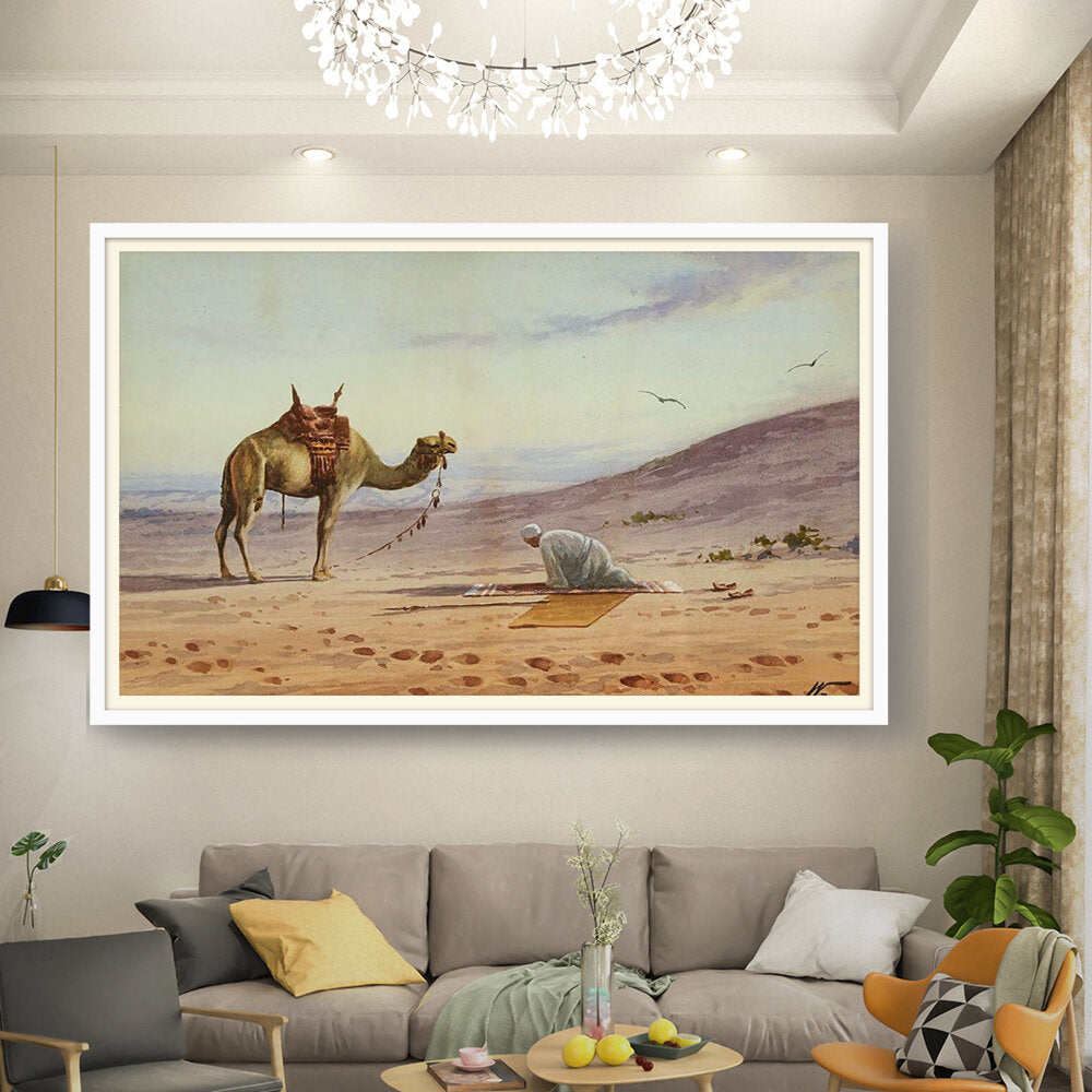 This captivating watercolor portrays a tranquil moment in the desert, featuring a lone figure in prayer alongside a majestic camel. The soft hues and gentle brushwork invite viewers to connect with the serene atmosphere of the arid landscape.