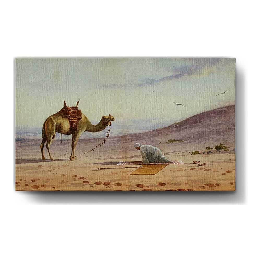 This captivating watercolor portrays a tranquil moment in the desert, featuring a lone figure in prayer alongside a majestic camel. The soft hues and gentle brushwork invite viewers to connect with the serene atmosphere of the arid landscape.