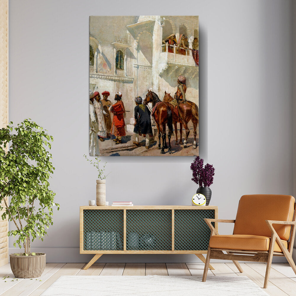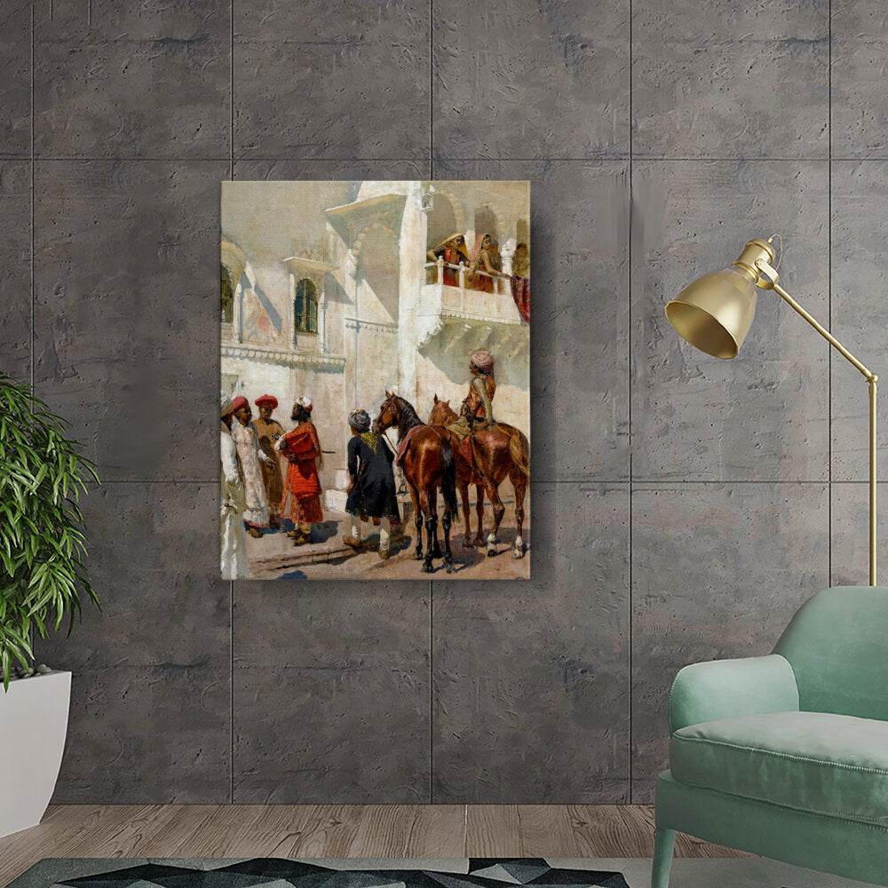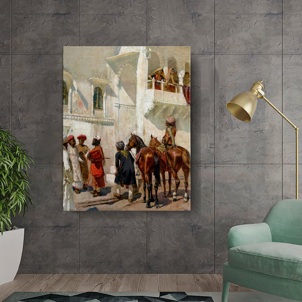 This artwork depicts a vibrant scene of individuals in traditional attire gathered near a palace, showcasing rich cultural elements and historical significance. The intricate details and realistic portrayal make it a captivating piece for art lovers.