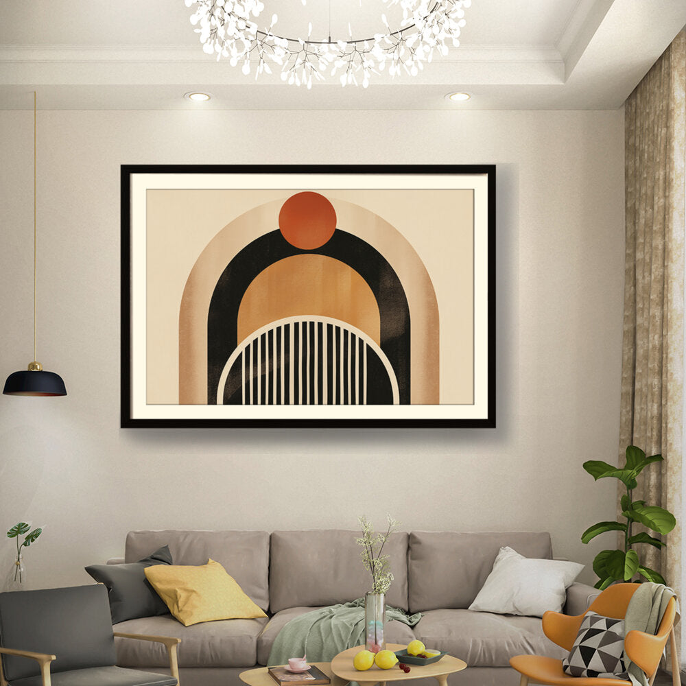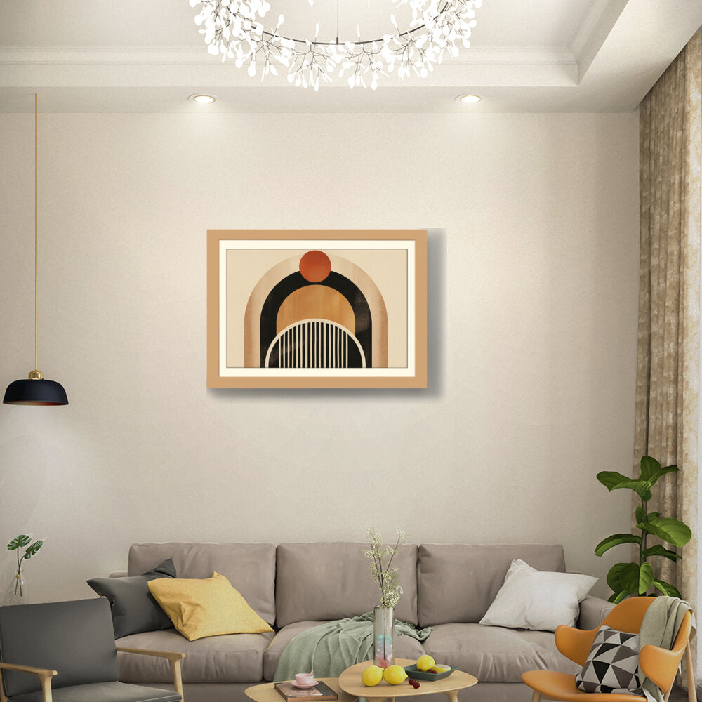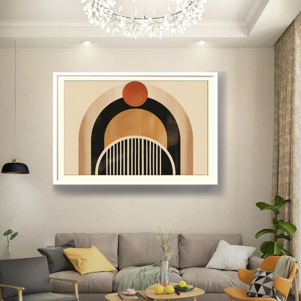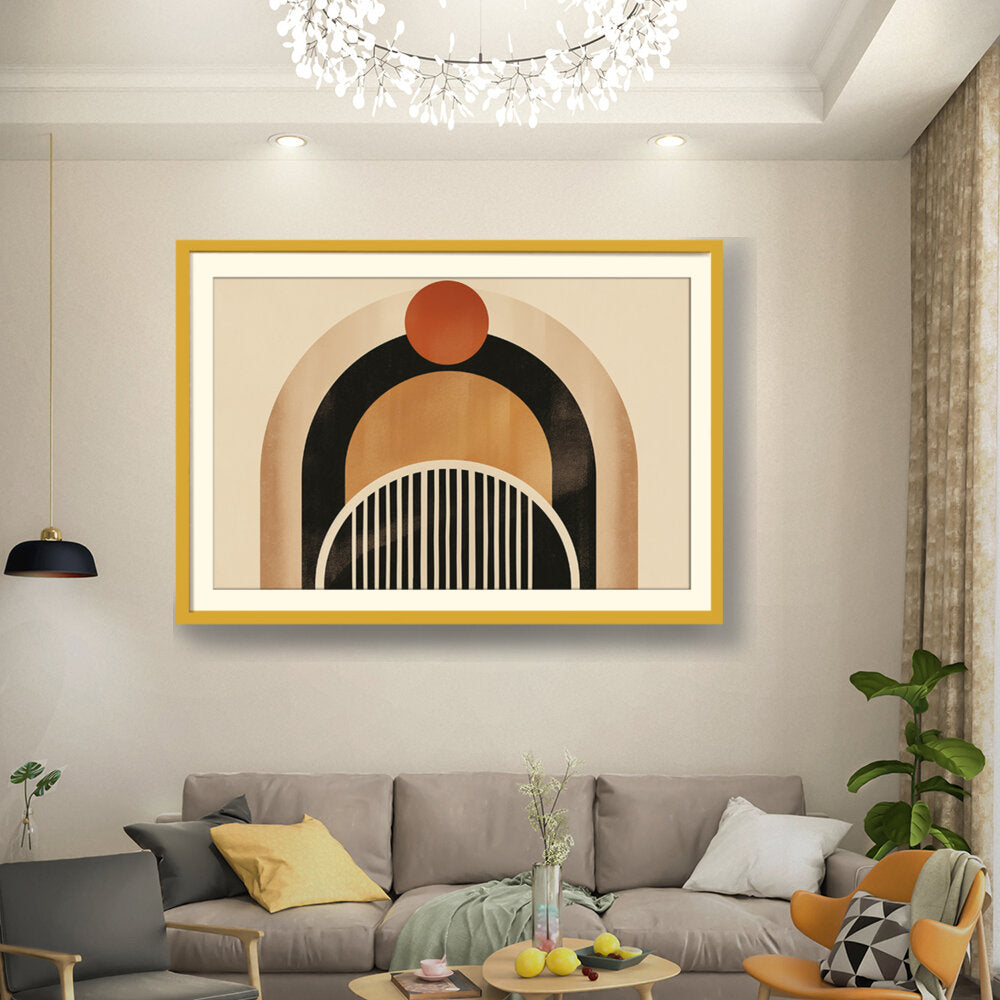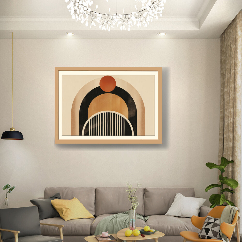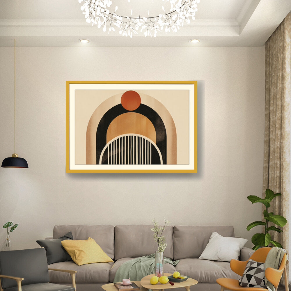 This artwork features a harmonious blend of geometric shapes and warm colors, creating a soothing and modern aesthetic. Perfect for enhancing the ambiance of any contemporary space. The arch and circle designs draw the eye, making it a focal point in your room.