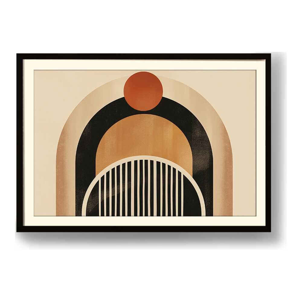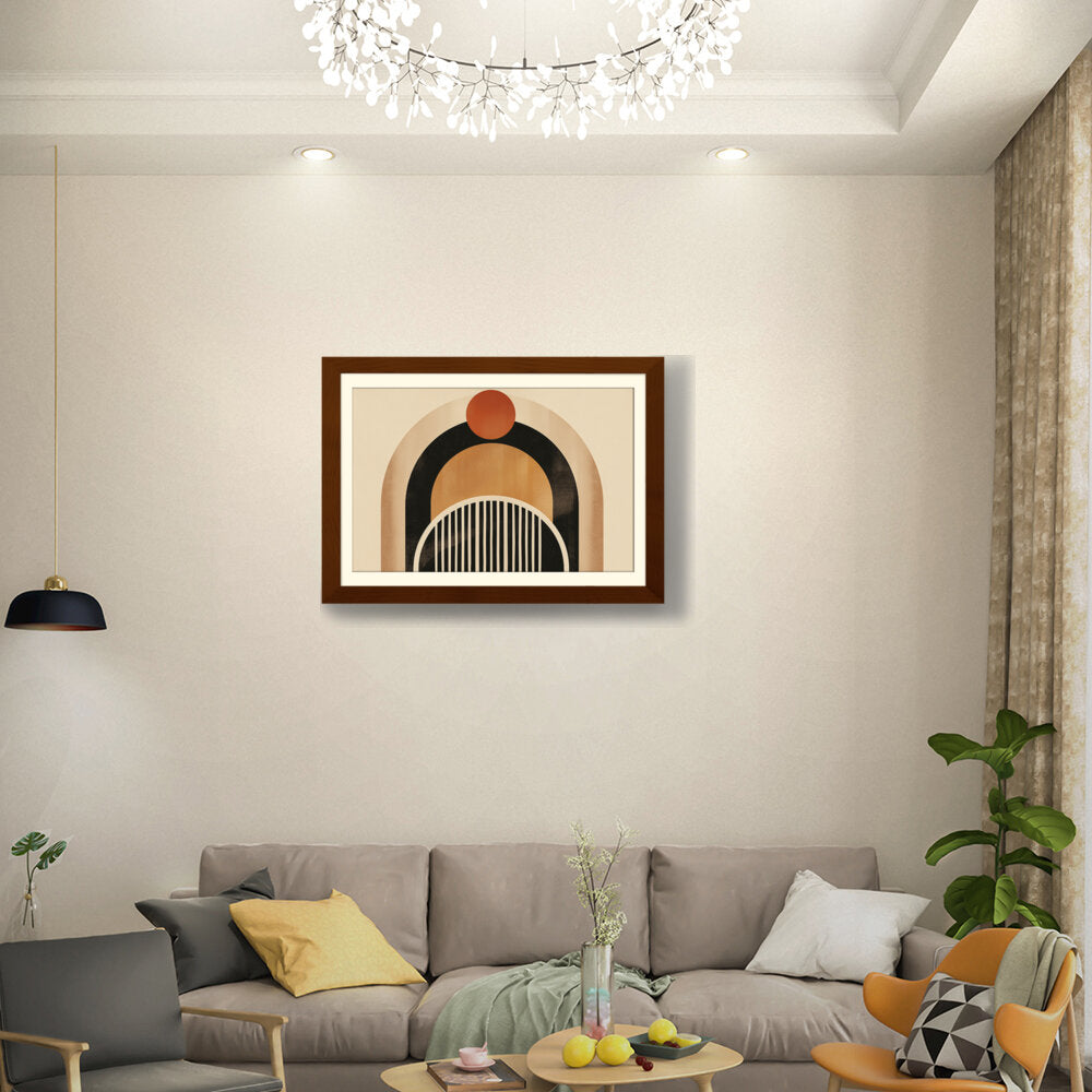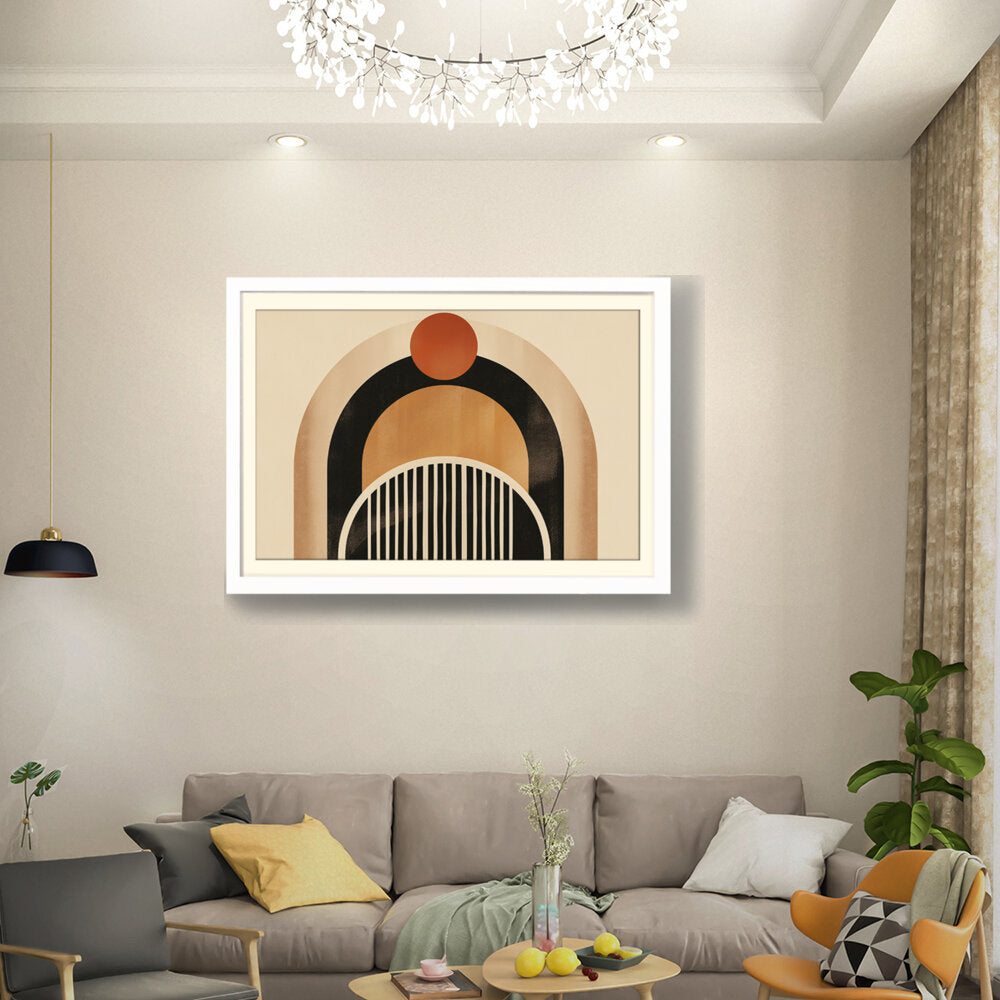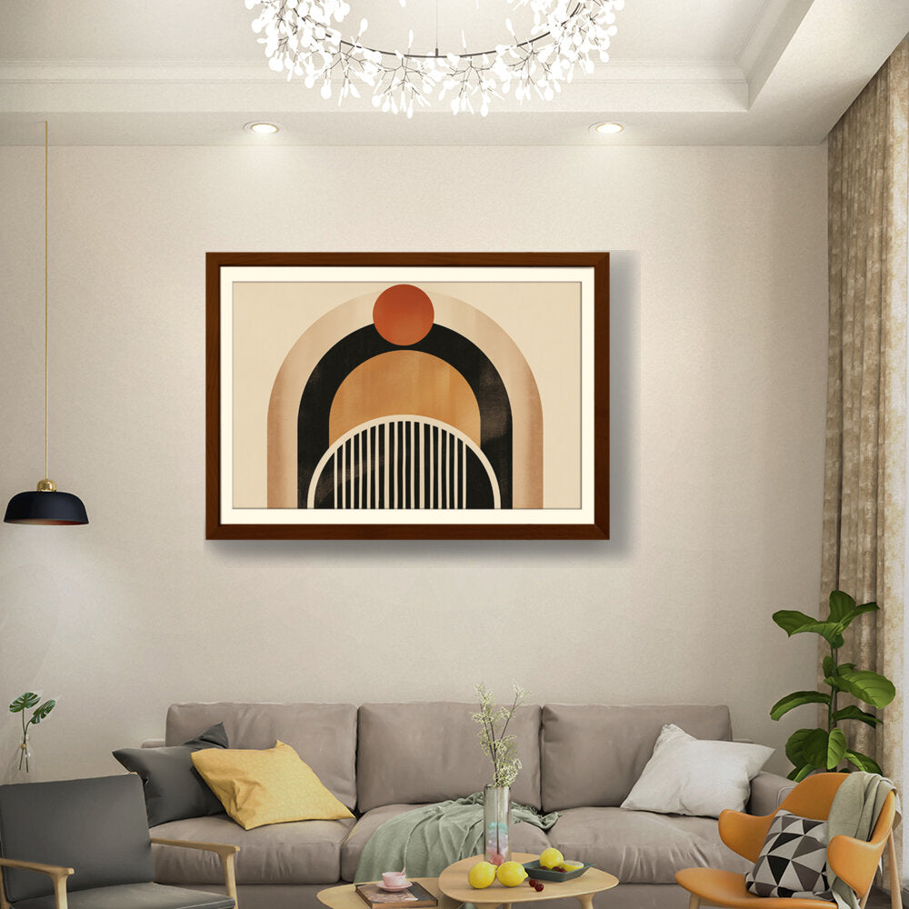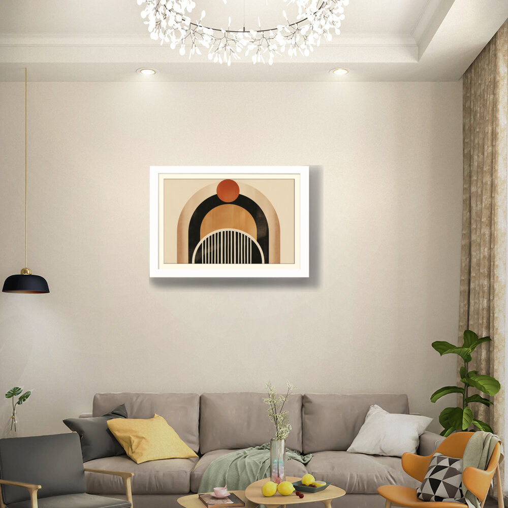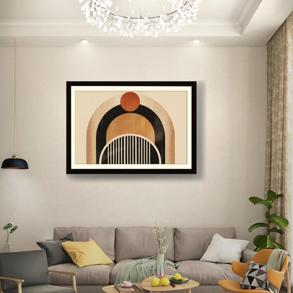 This artwork features a harmonious blend of geometric shapes and warm colors, creating a soothing and modern aesthetic. Perfect for enhancing the ambiance of any contemporary space. The arch and circle designs draw the eye, making it a focal point in your room.