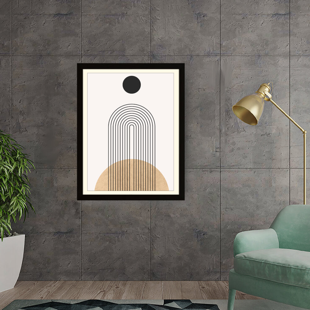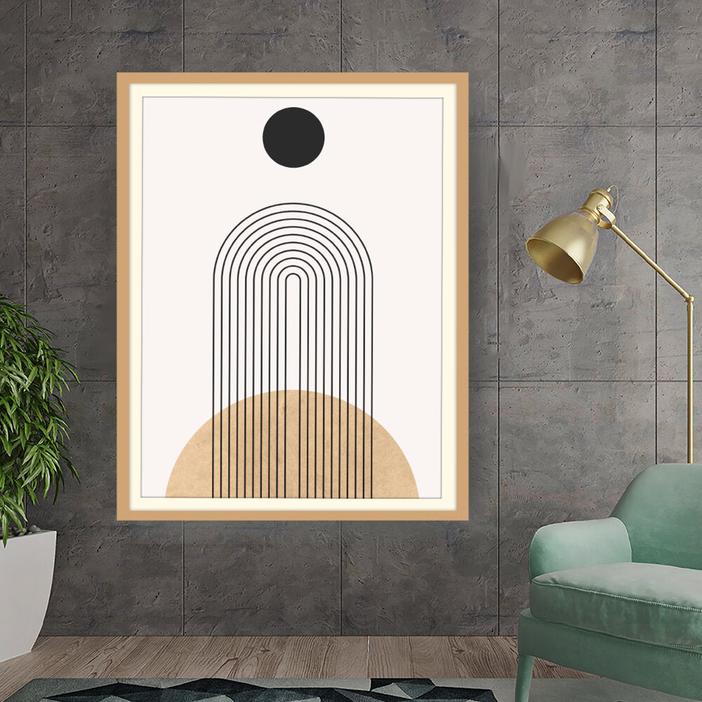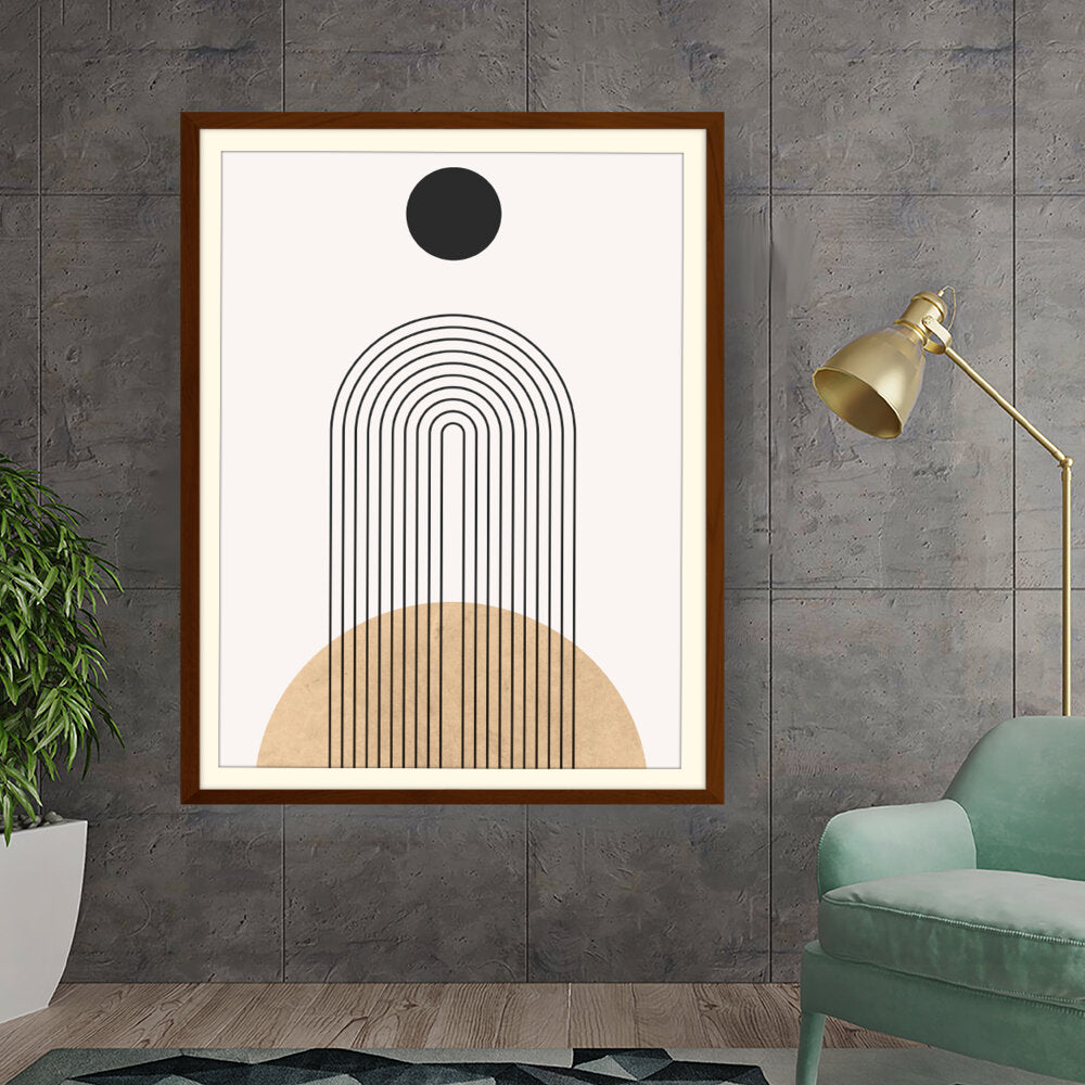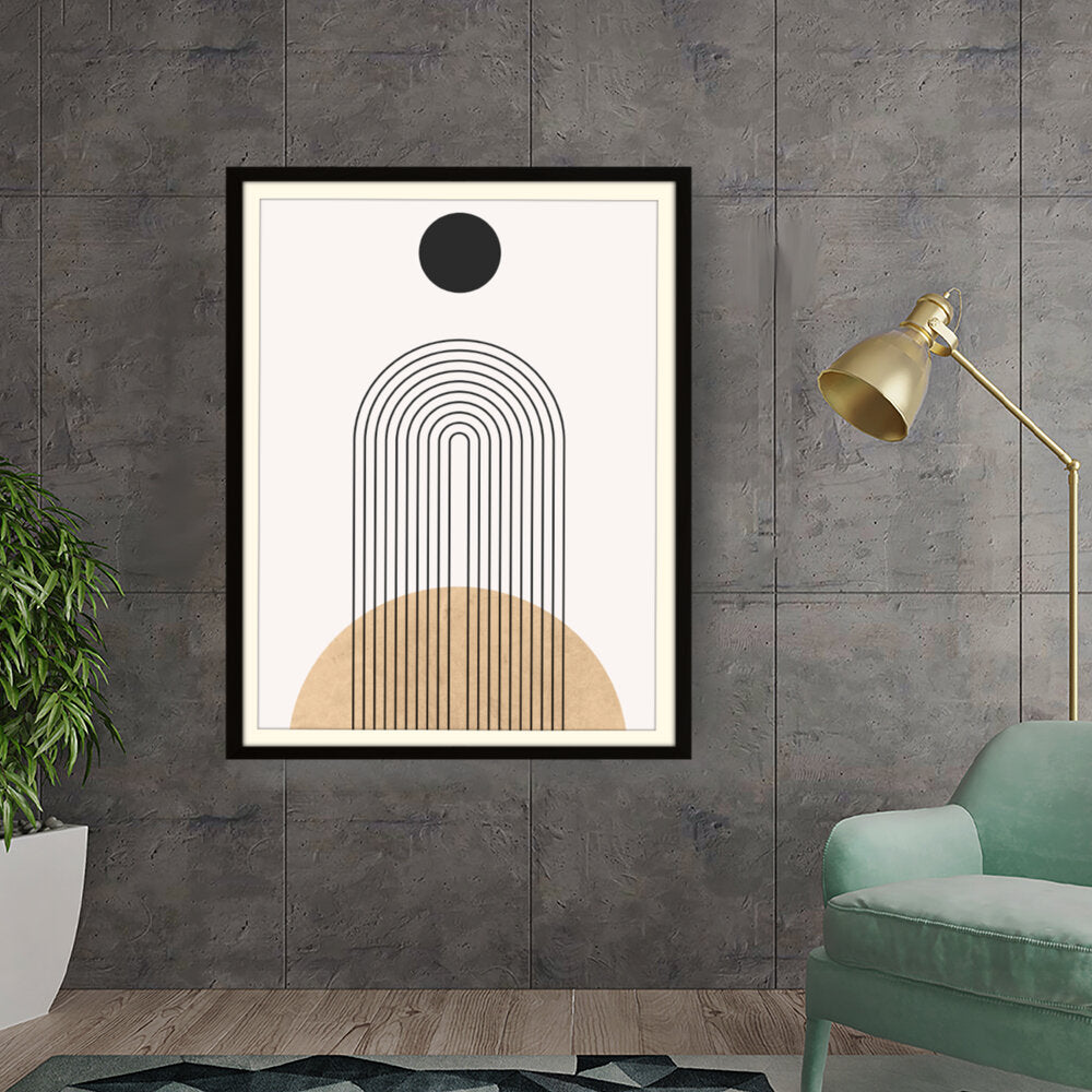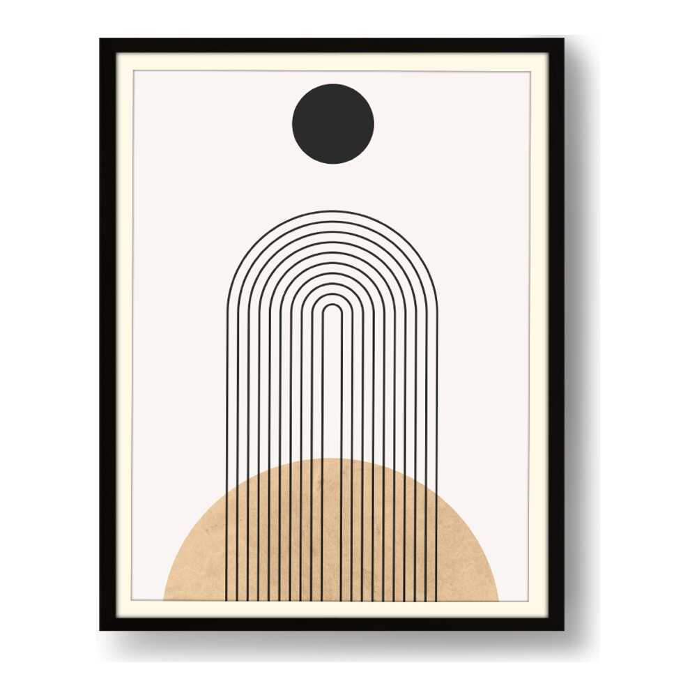 This minimalist artwork features a harmonious blend of geometric shapes, showcasing a black circle and a series of arcs in a warm, earthy tone. Perfect for modern spaces, it invites a sense of calm and balance, making it an ideal piece for contemporary interiors.