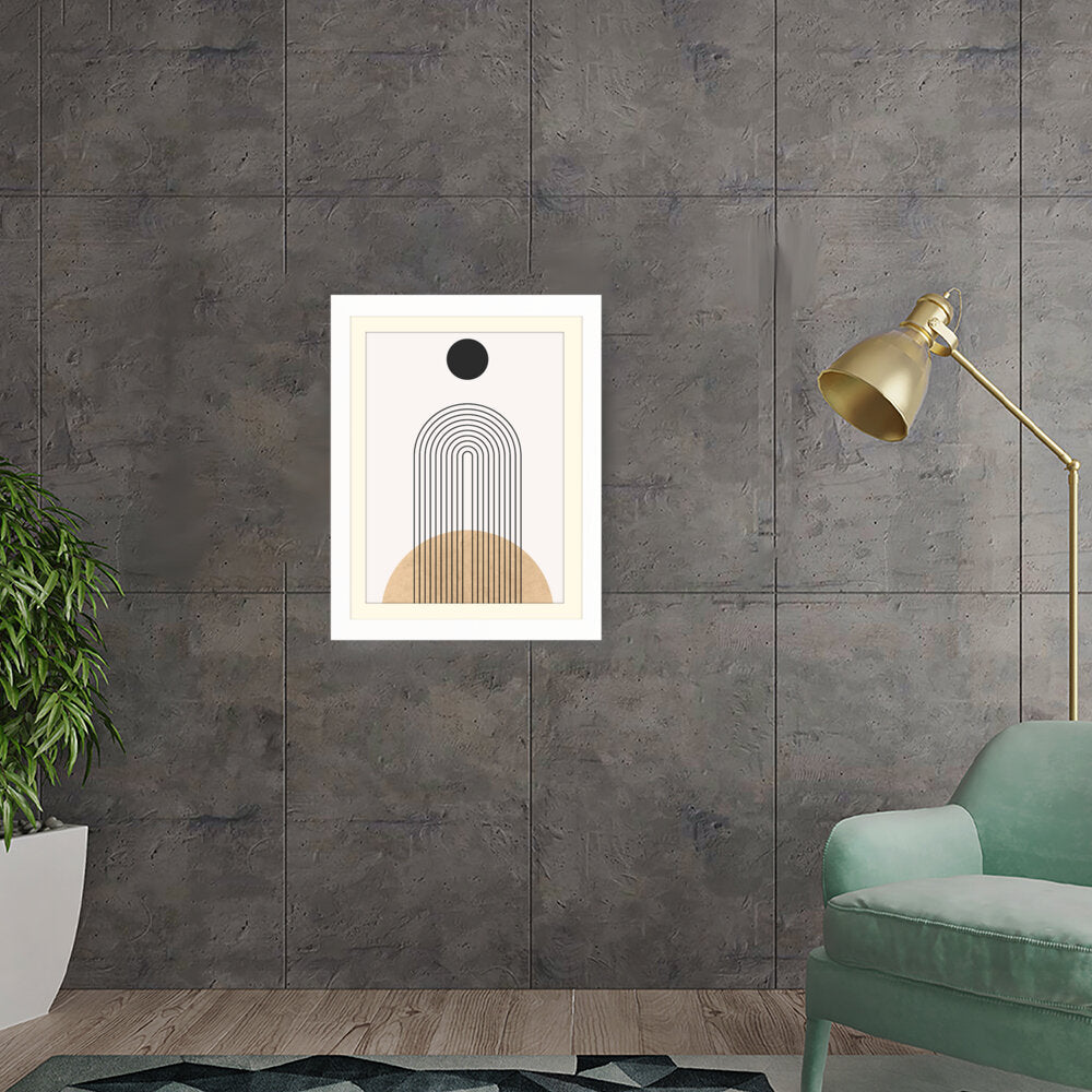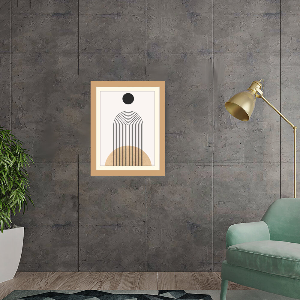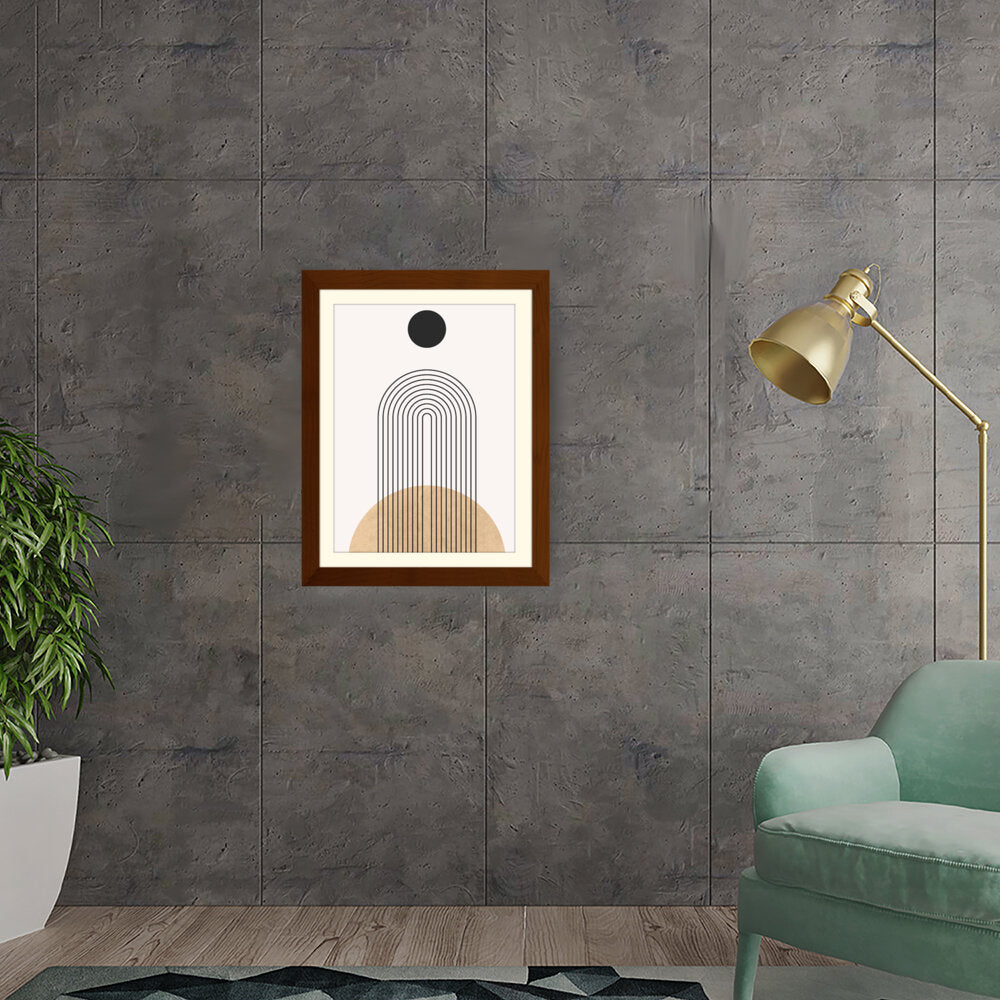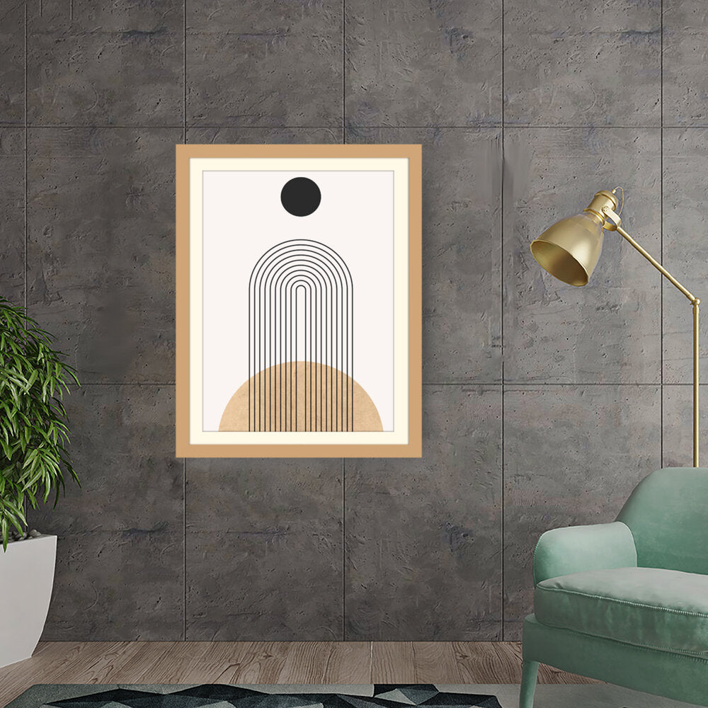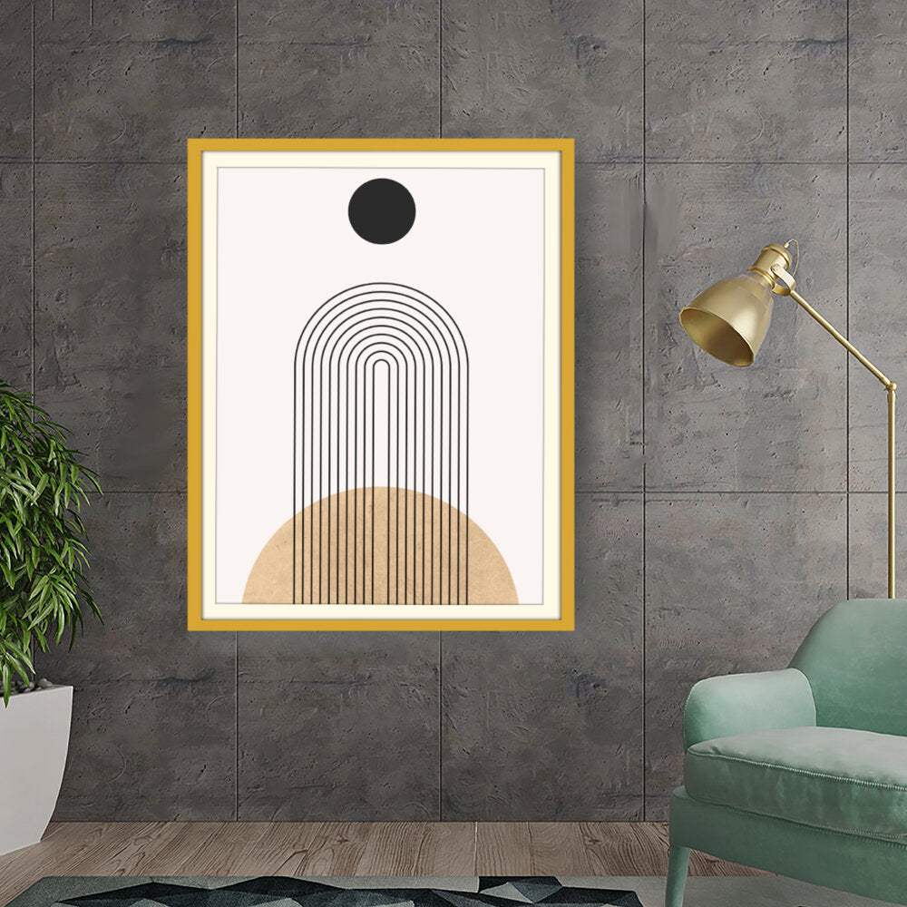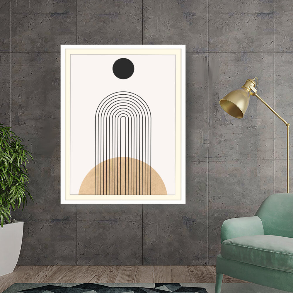 This minimalist artwork features a harmonious blend of geometric shapes, showcasing a black circle and a series of arcs in a warm, earthy tone. Perfect for modern spaces, it invites a sense of calm and balance, making it an ideal piece for contemporary interiors.