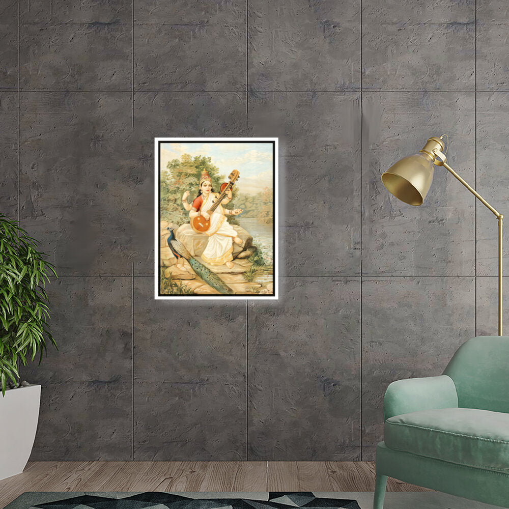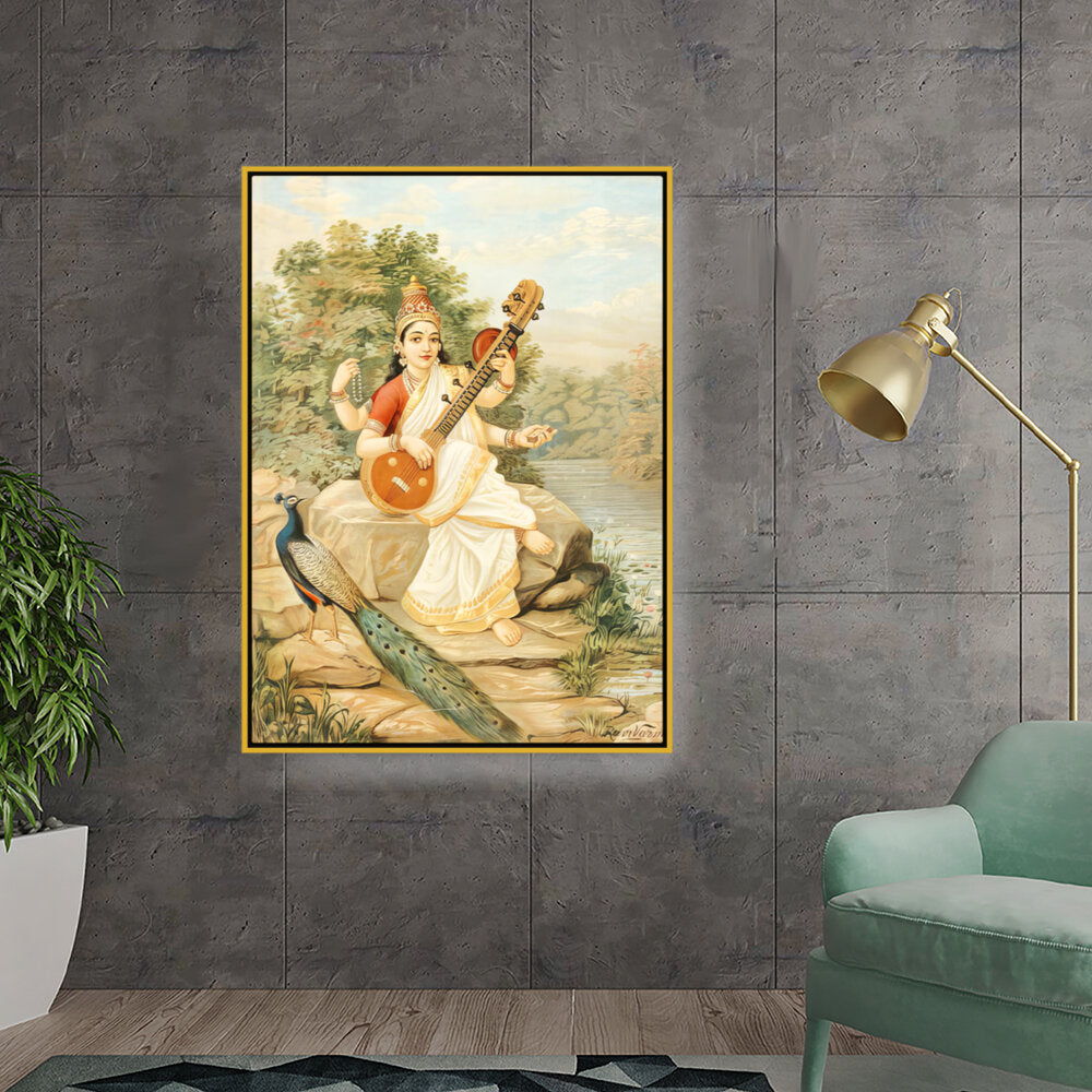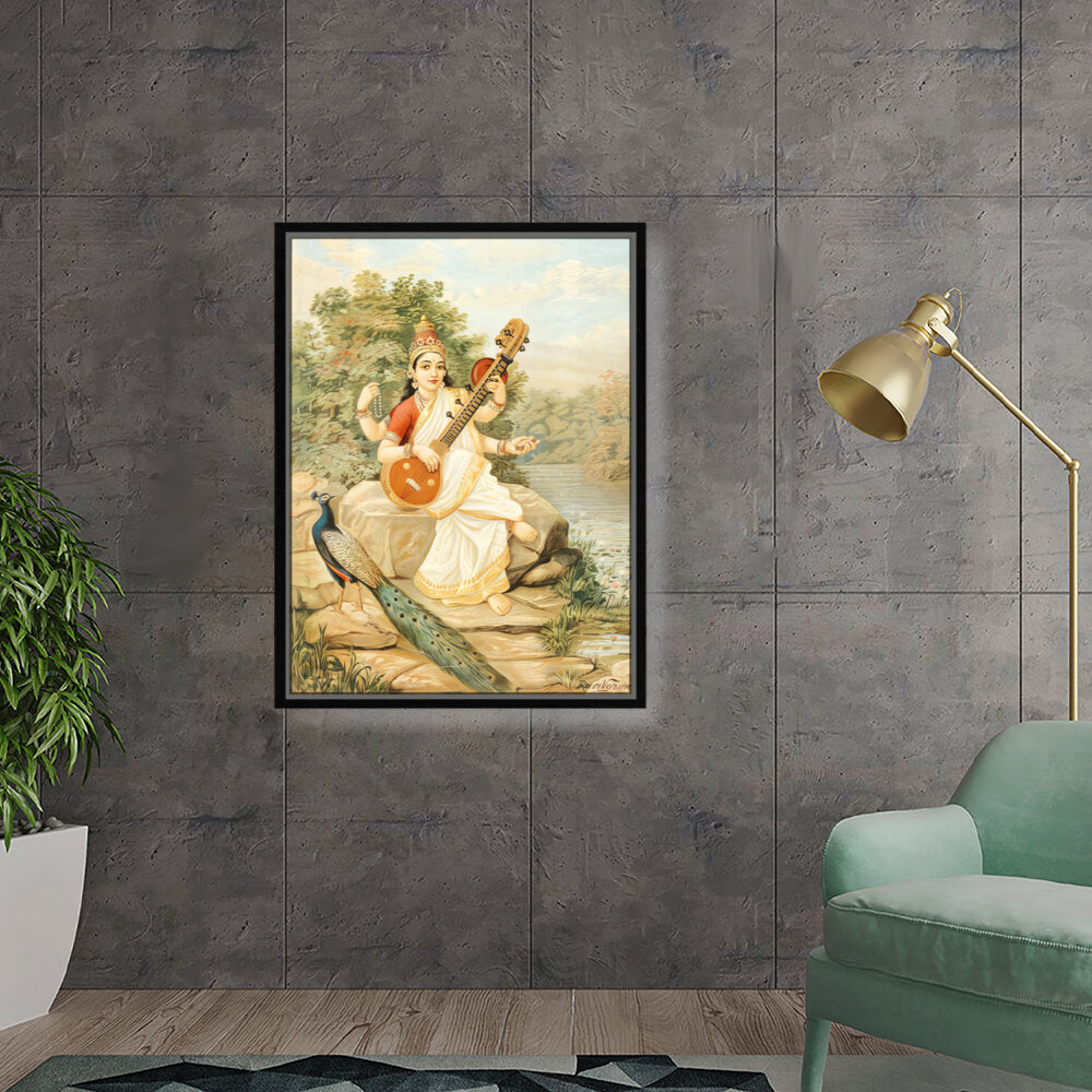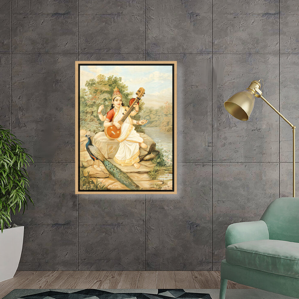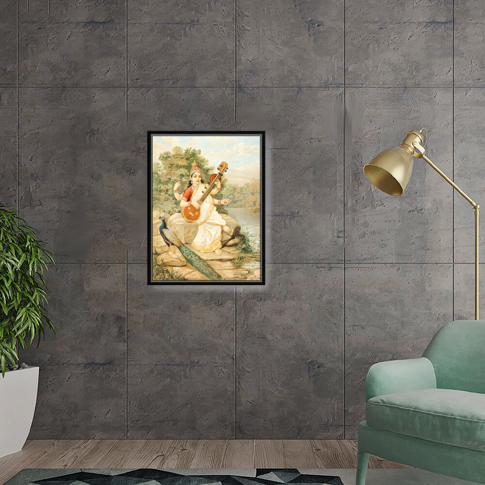 This beautiful lithograph depicts a goddess seated gracefully with a veena, symbolizing music and arts. Surrounded by nature and vibrant colors, it brings a serene and cultural essence to any space.