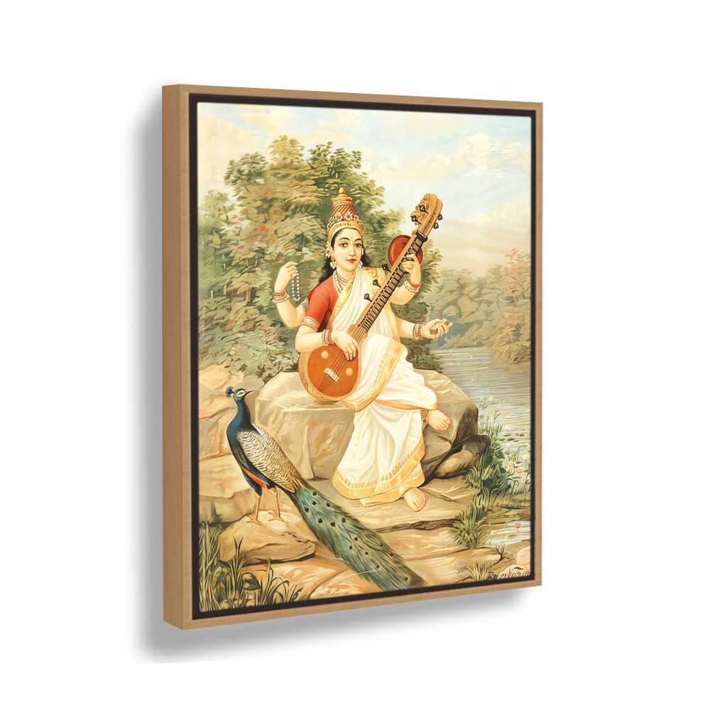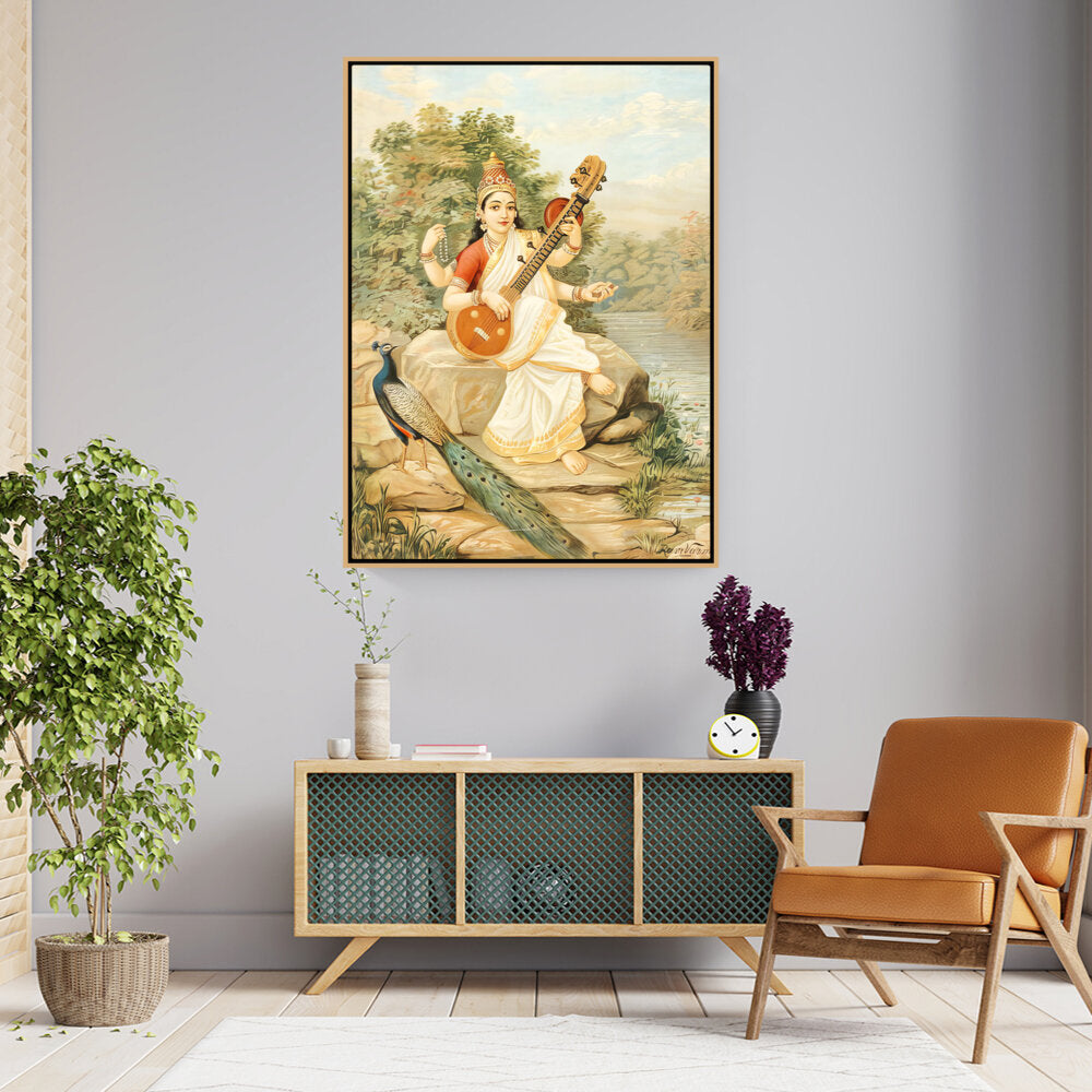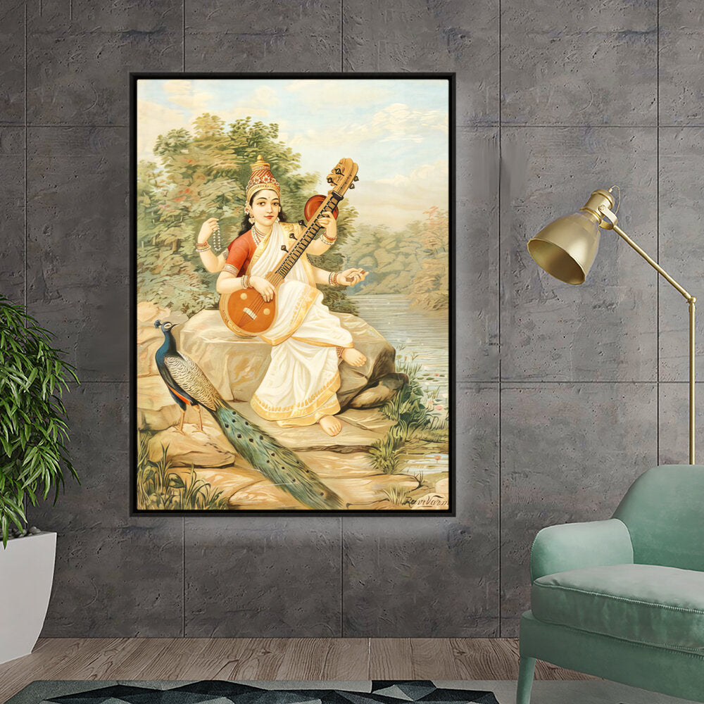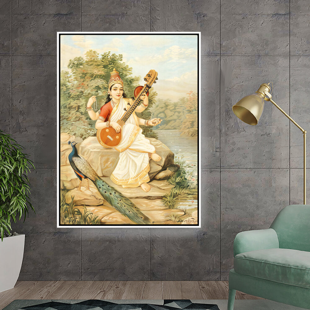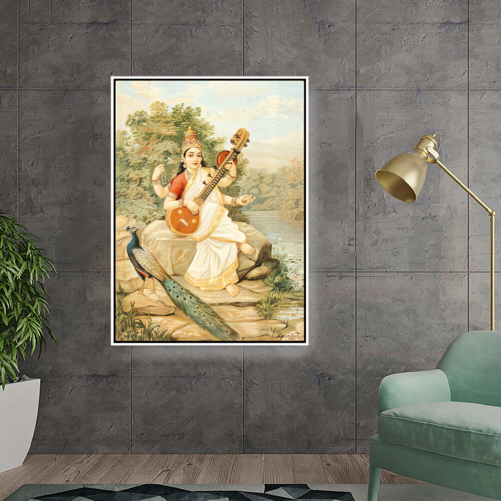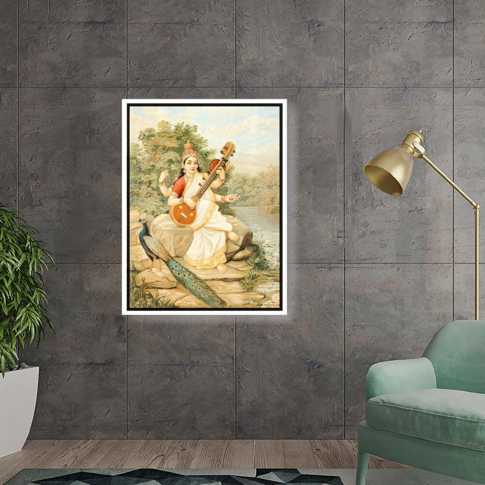 This beautiful lithograph depicts a goddess seated gracefully with a veena, symbolizing music and arts. Surrounded by nature and vibrant colors, it brings a serene and cultural essence to any space.