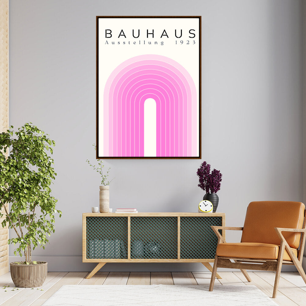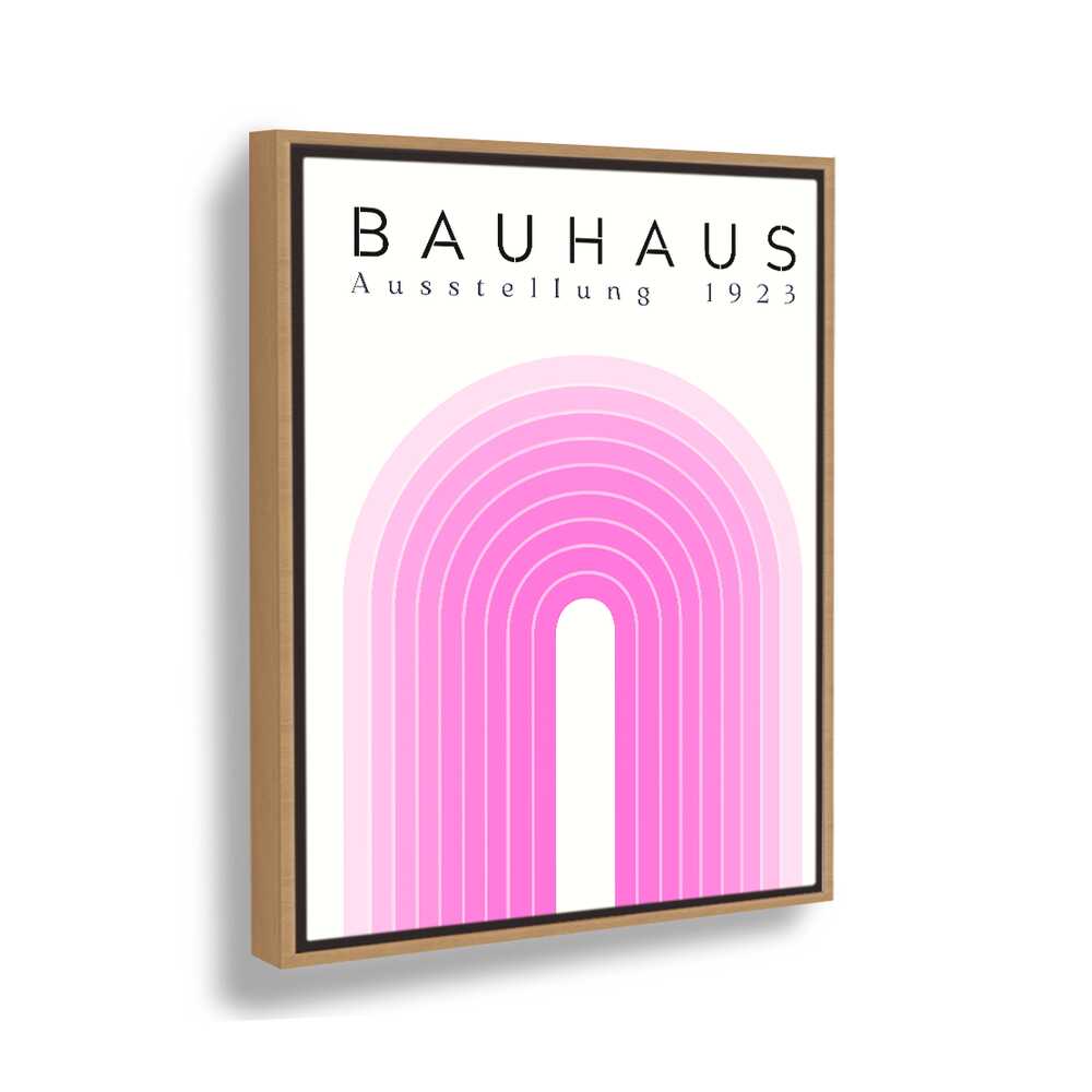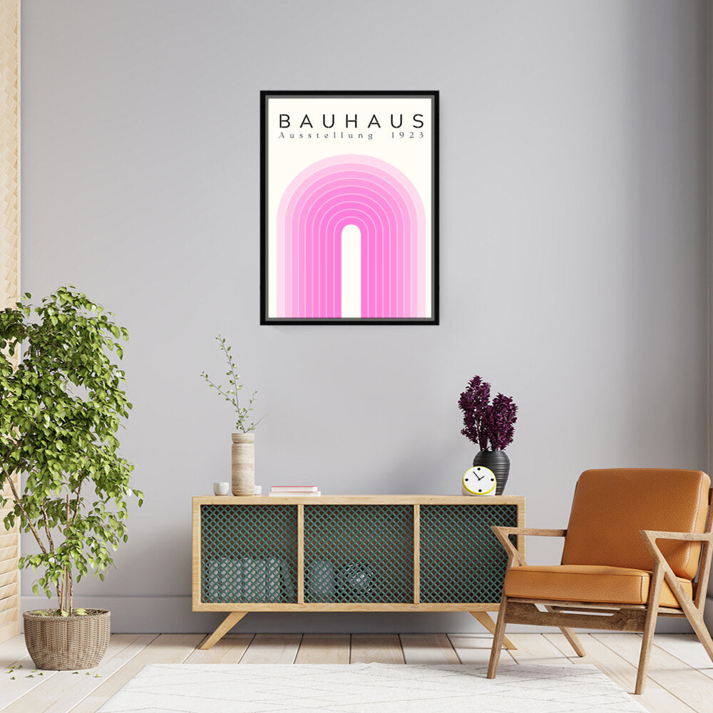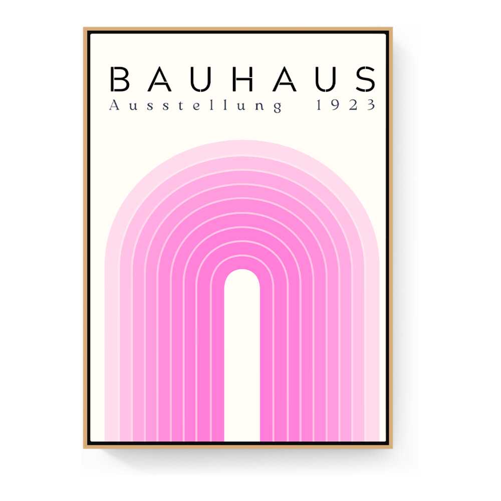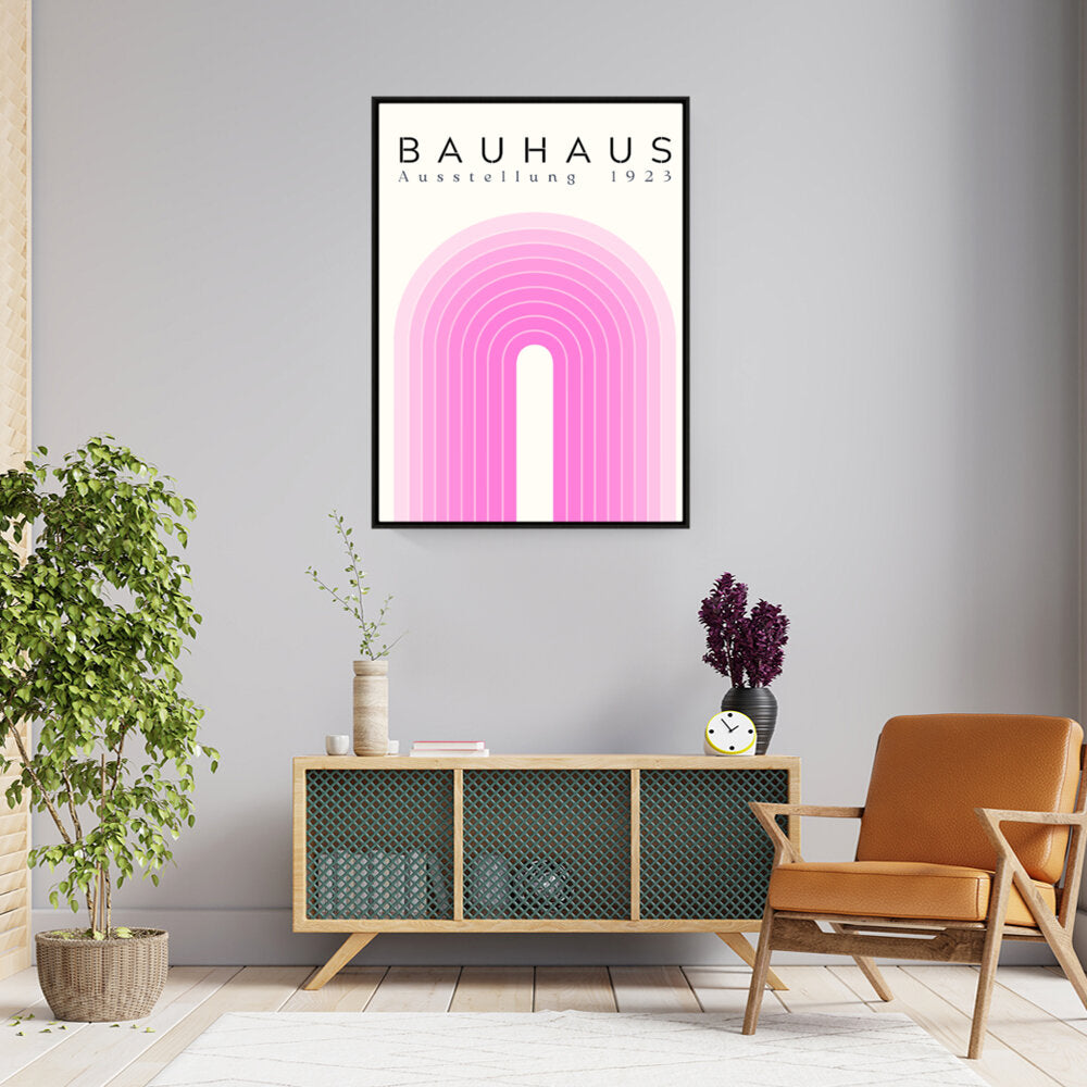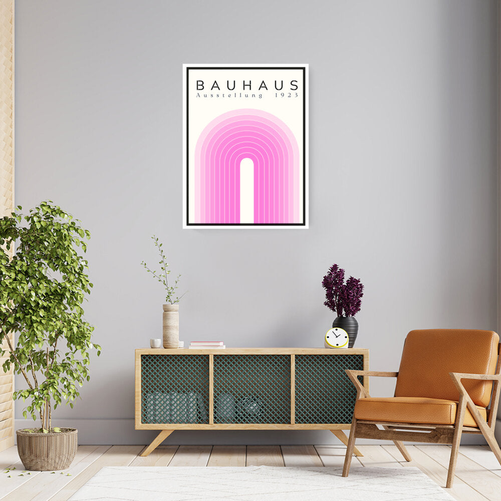 This artwork is a tribute to the iconic Bauhaus exhibition of 1923, featuring a harmonious blend of geometric shapes and a modern typeface. The soft pink gradient and minimal design evoke a sense of sophistication and creativity, making it an excellent addition to any contemporary space.