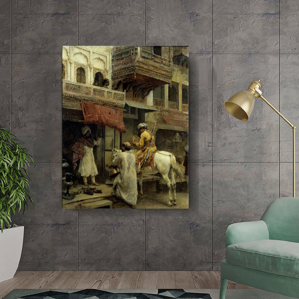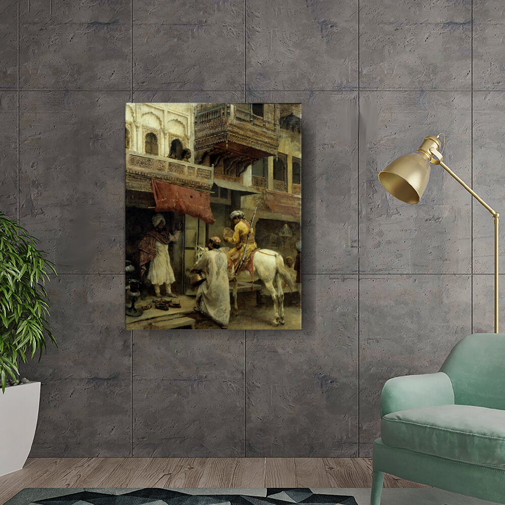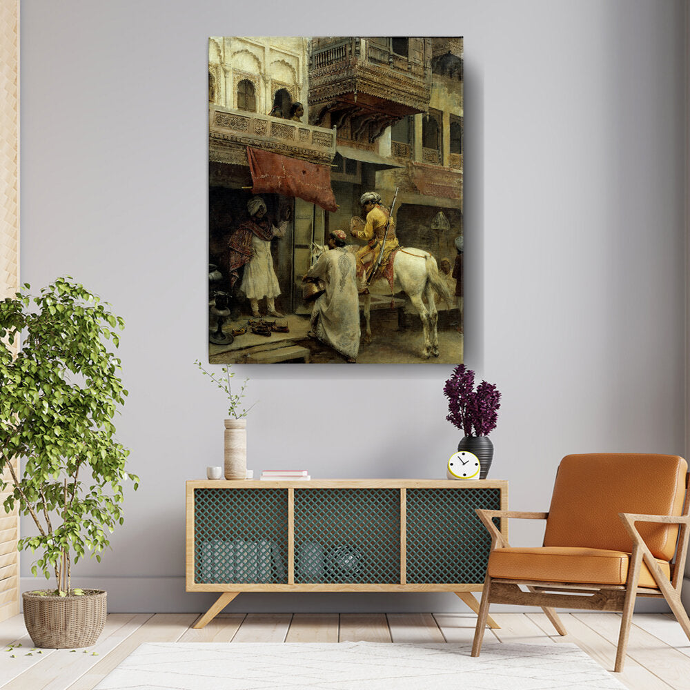 This exquisite painting captures a vibrant market scene in India, showcasing traditional attire and architecture. It evokes a sense of cultural richness and historical depth, making it an ideal piece for any art lover.