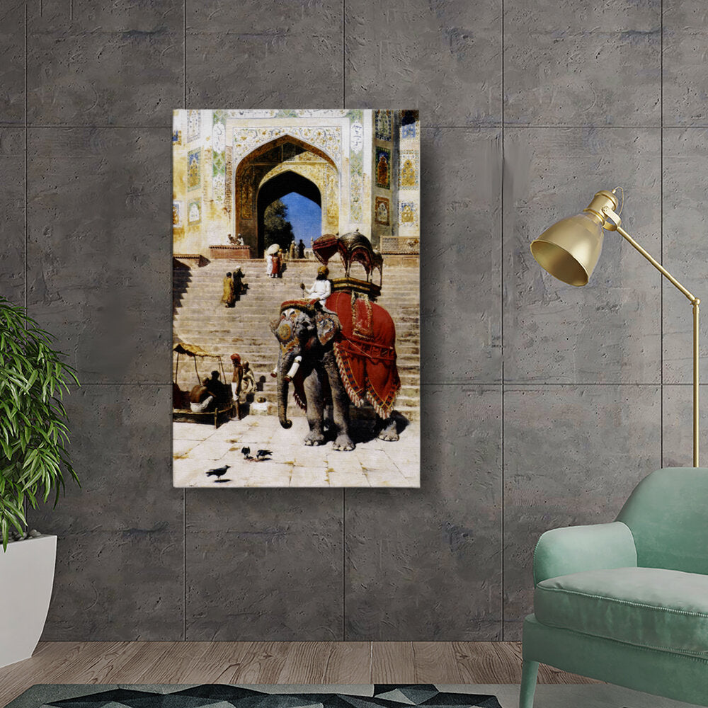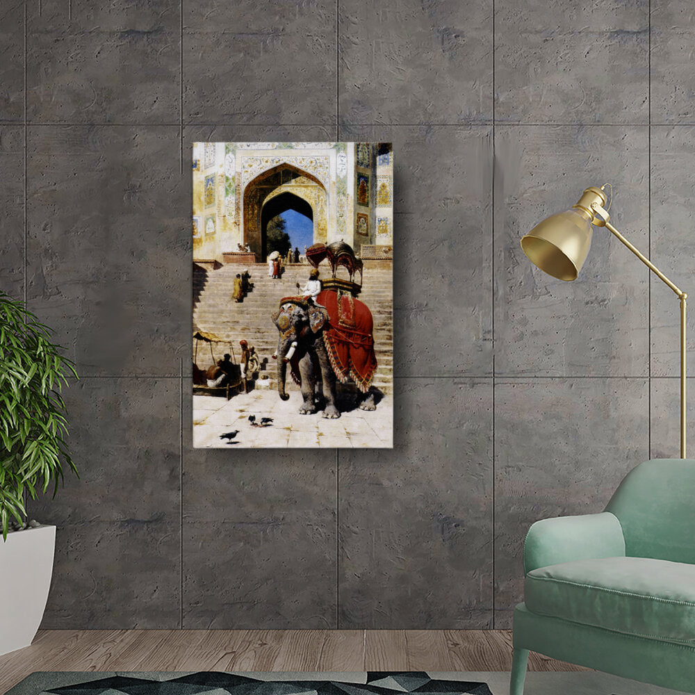 This captivating artwork depicts a beautifully adorned elephant standing at the steps of a grand gateway, showcasing Indian cultural heritage. The intricate details of the architecture and the vibrant colors bring the scene to life, making it a perfect addition to any art lover's collection.