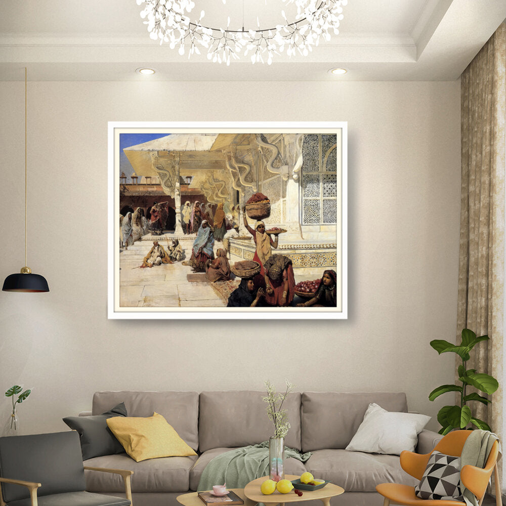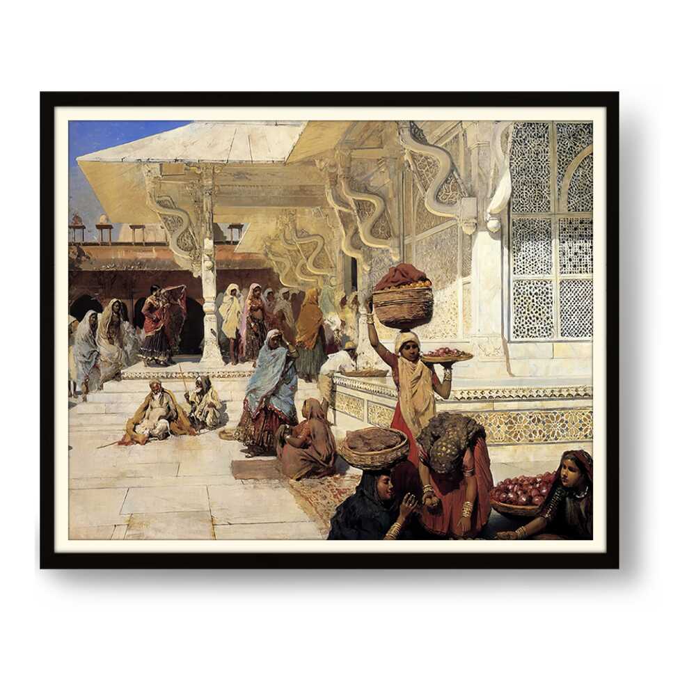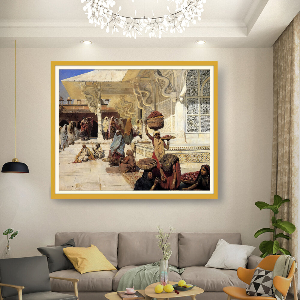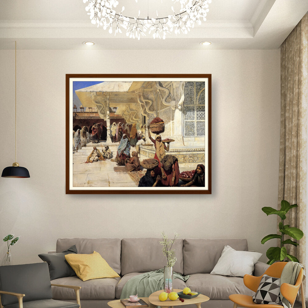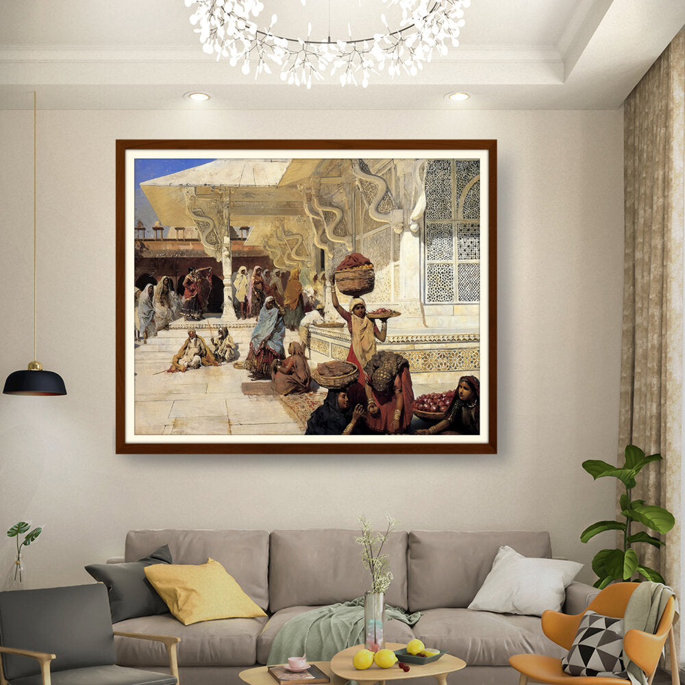 This painting captures the vibrant life of an Indian marketplace, showcasing women of diverse backgrounds engaged in daily activities. The intricate details and vivid colors reflect the rich culture and heritage of the region.