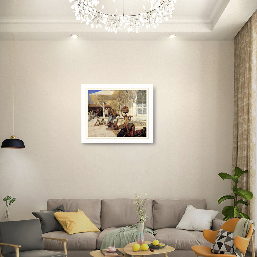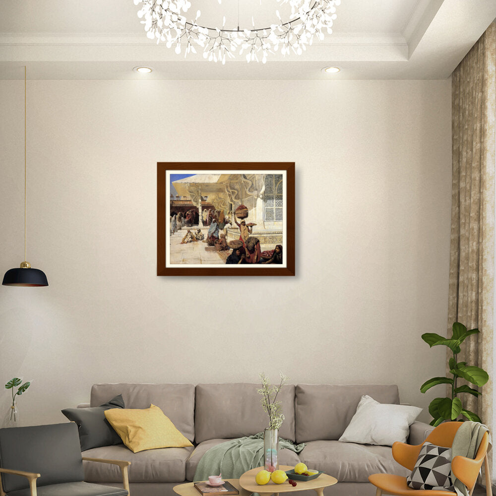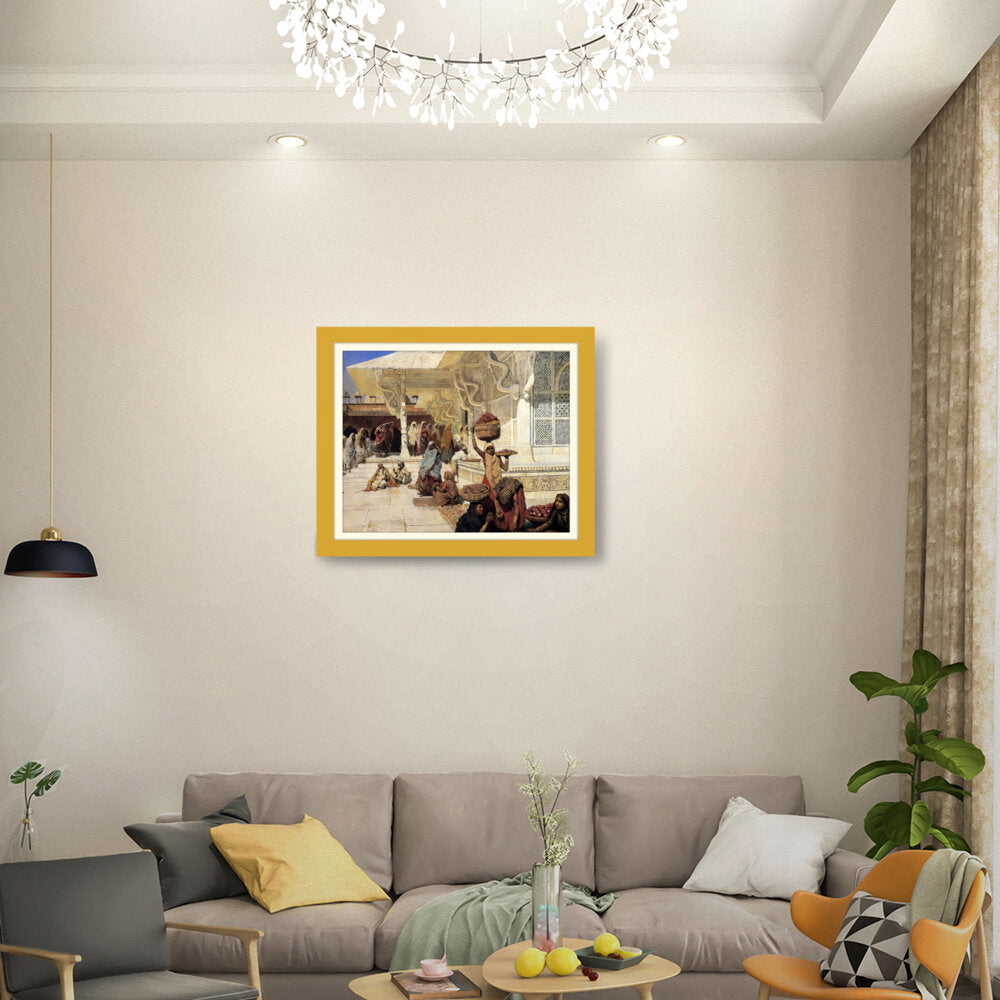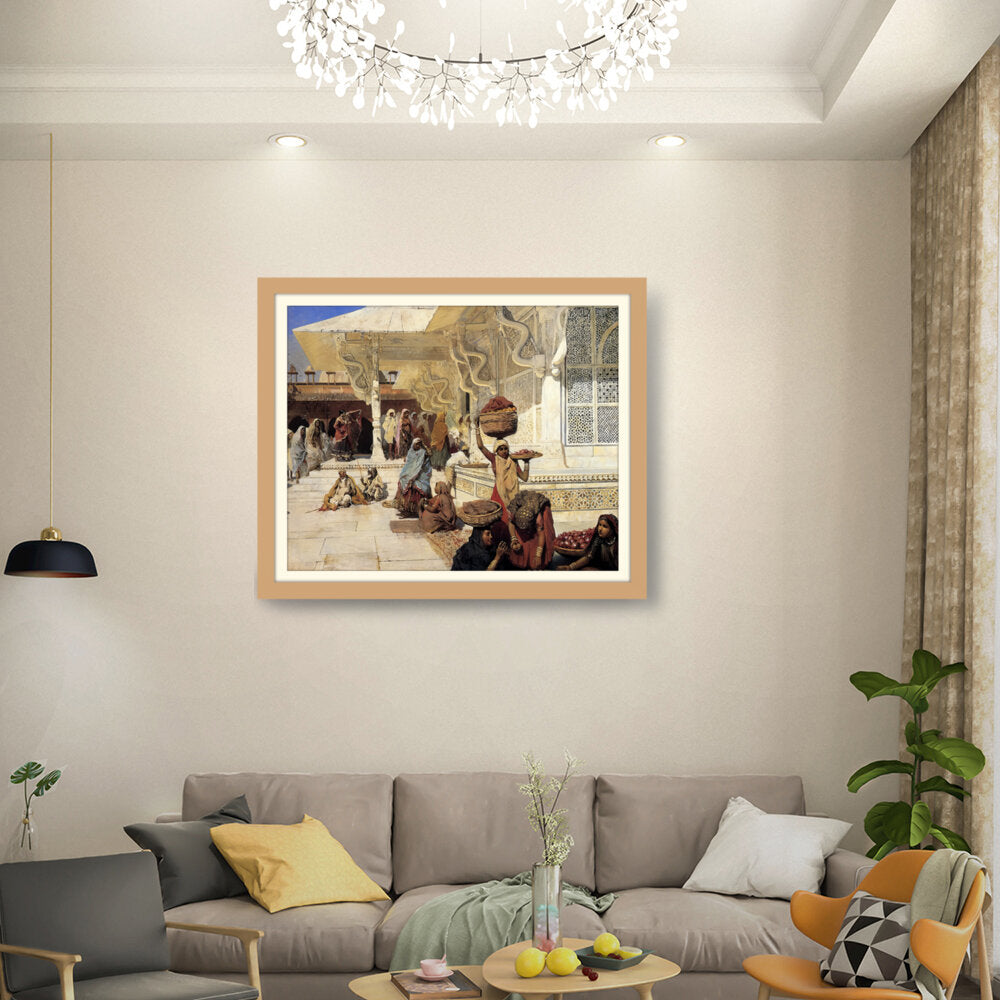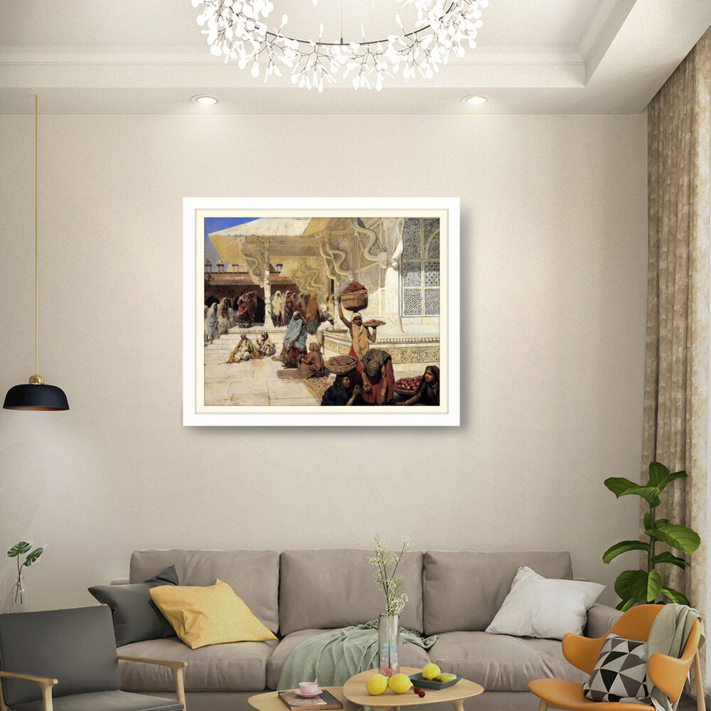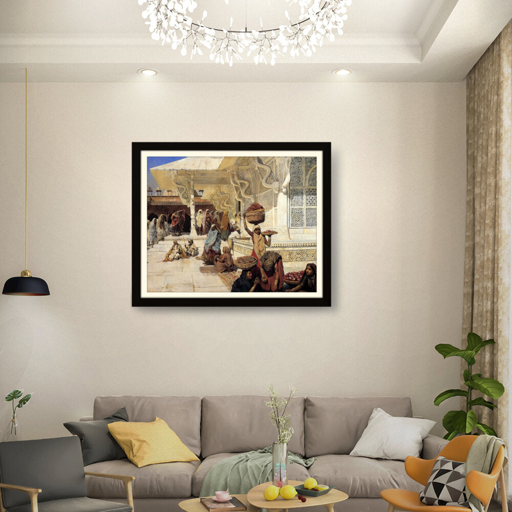 This painting captures the vibrant life of an Indian marketplace, showcasing women of diverse backgrounds engaged in daily activities. The intricate details and vivid colors reflect the rich culture and heritage of the region.