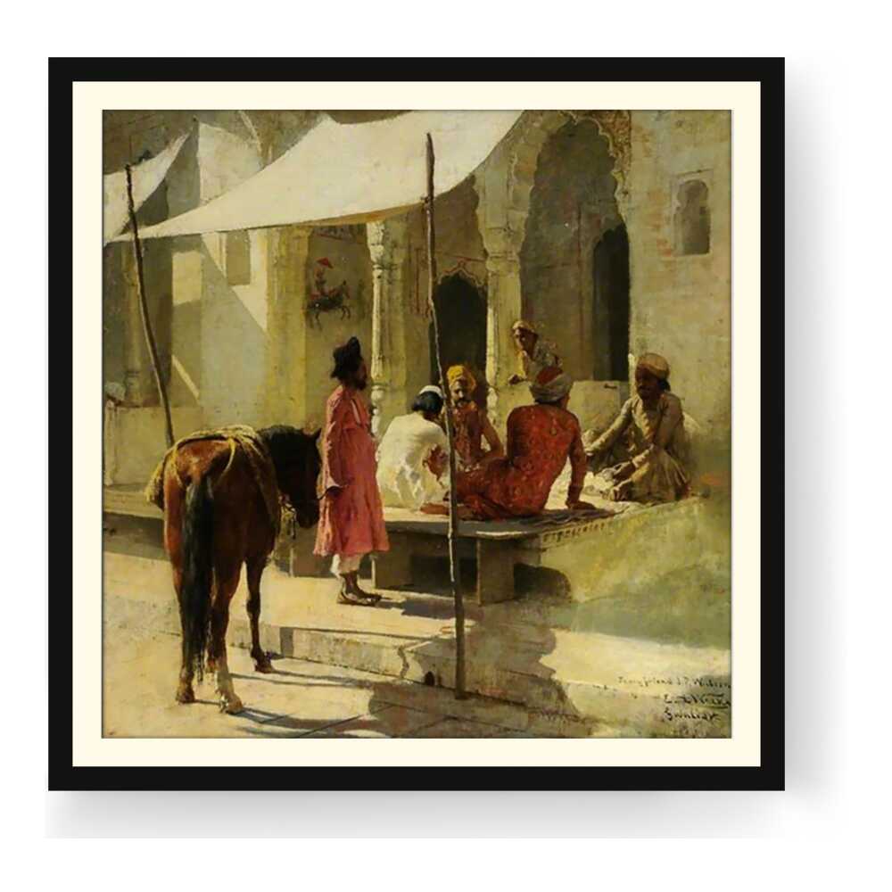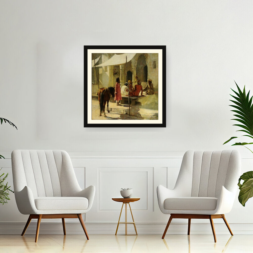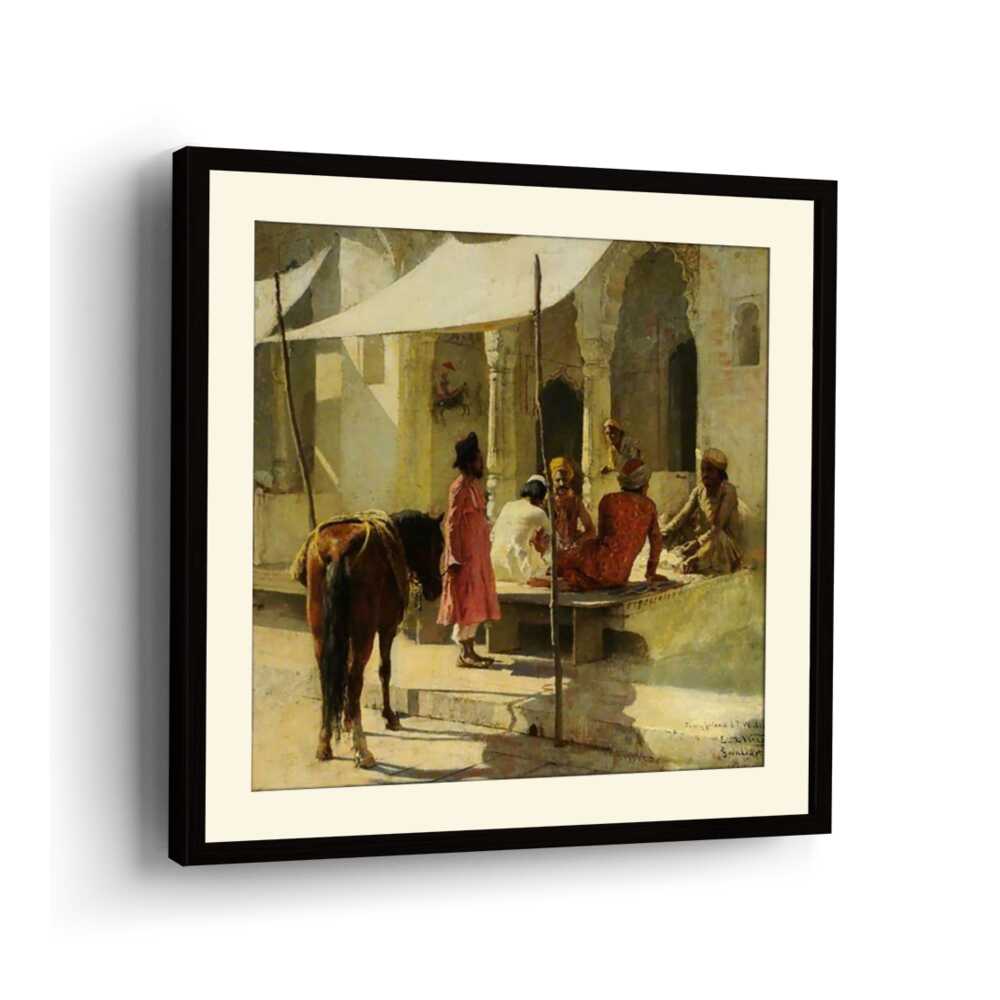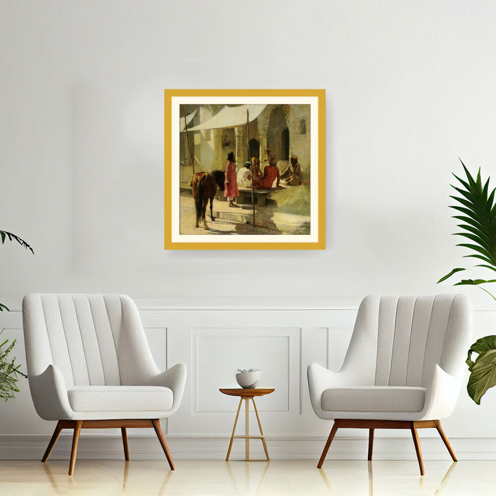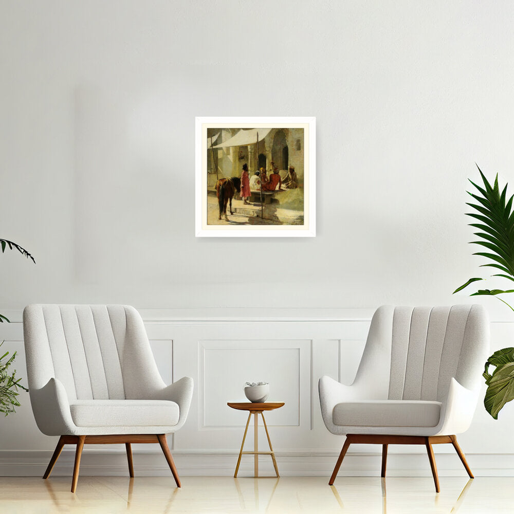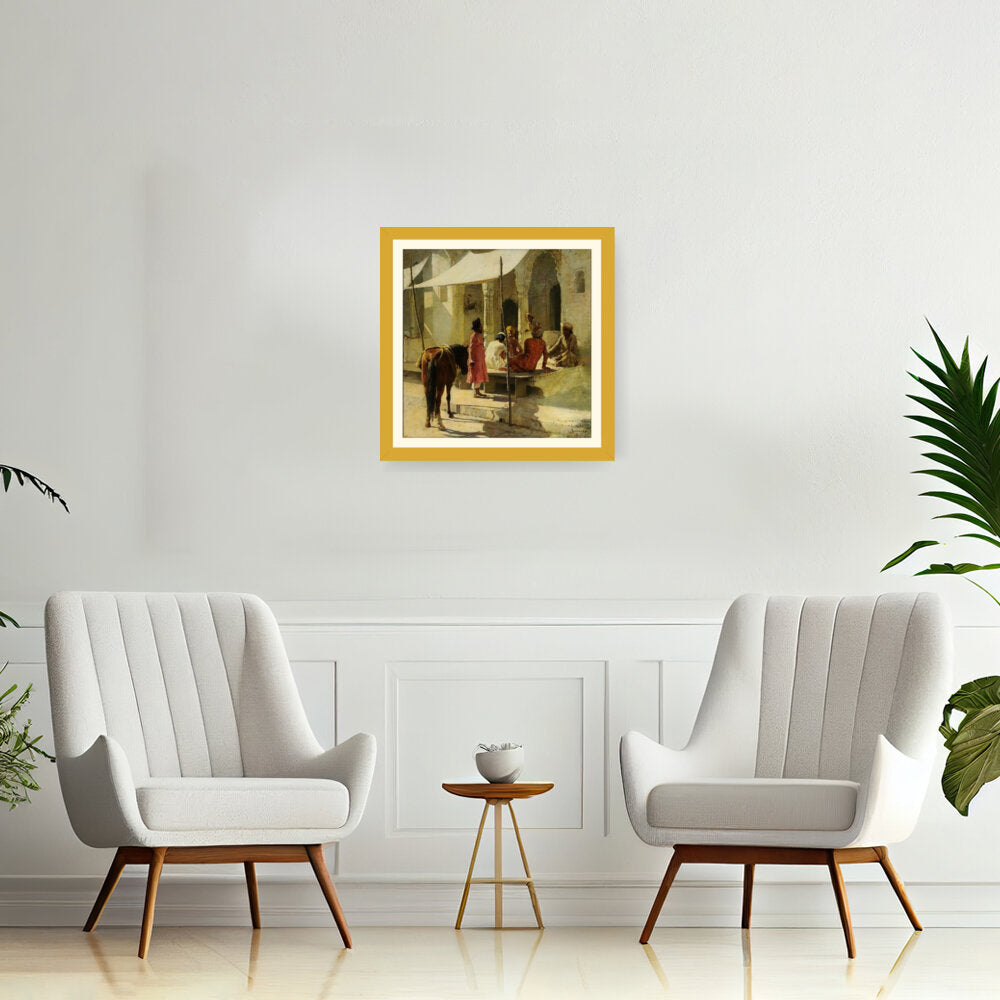 This evocative painting captures a vibrant market scene in India, showcasing a lively interaction among locals. The rich colors and intricate details reflect the cultural essence of Indian tradition, making it a captivating addition to any space.