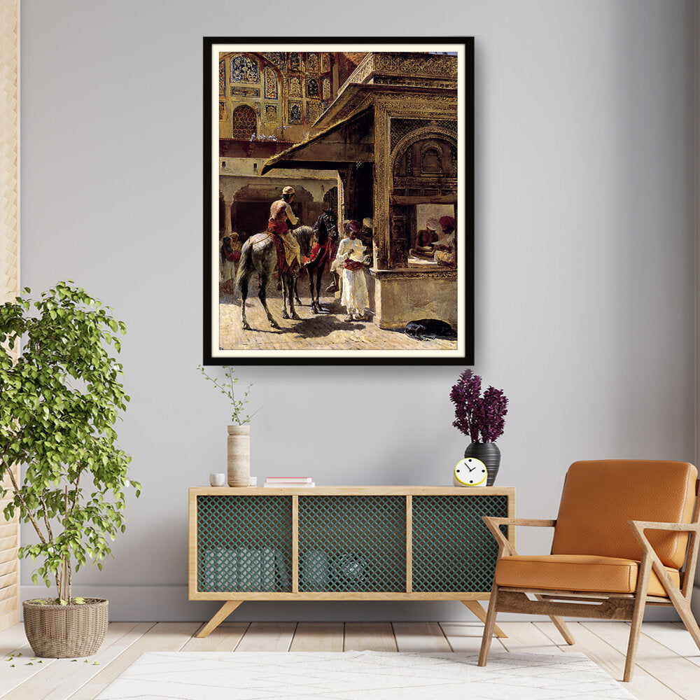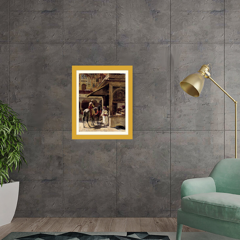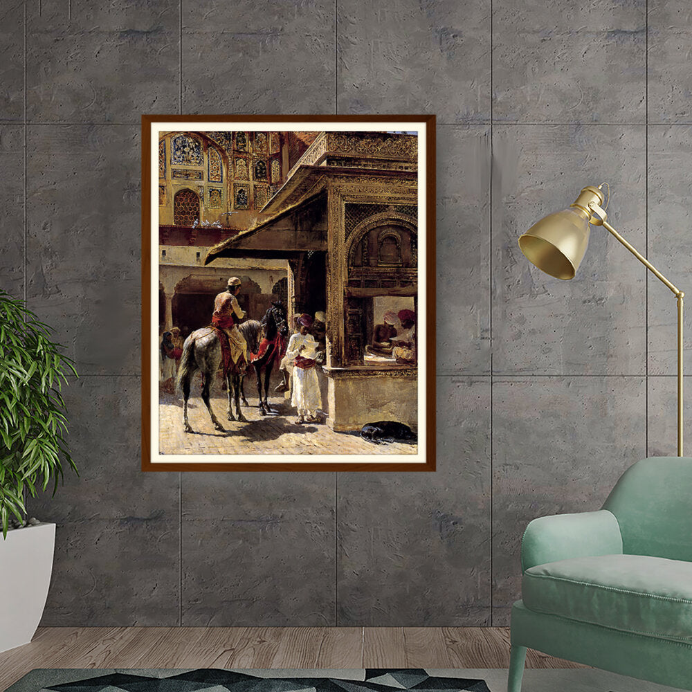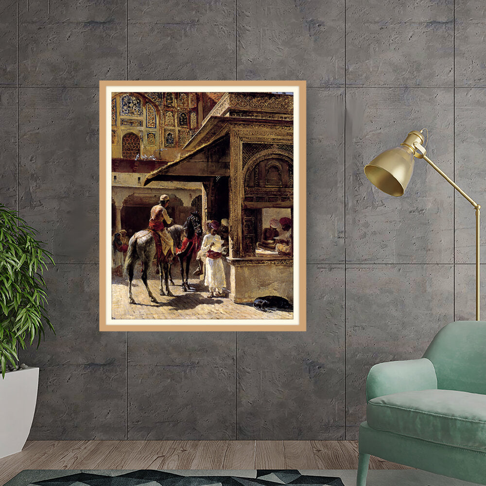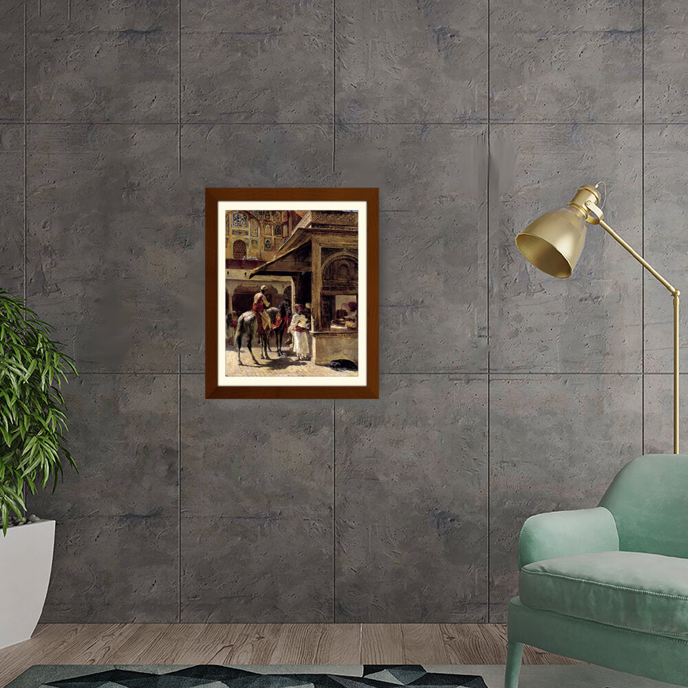 This captivating painting depicts a bustling market scene in India, showcasing traditional attire and daily life. The intricate details and vibrant colors bring the cultural context to life, making it a striking addition to any space.