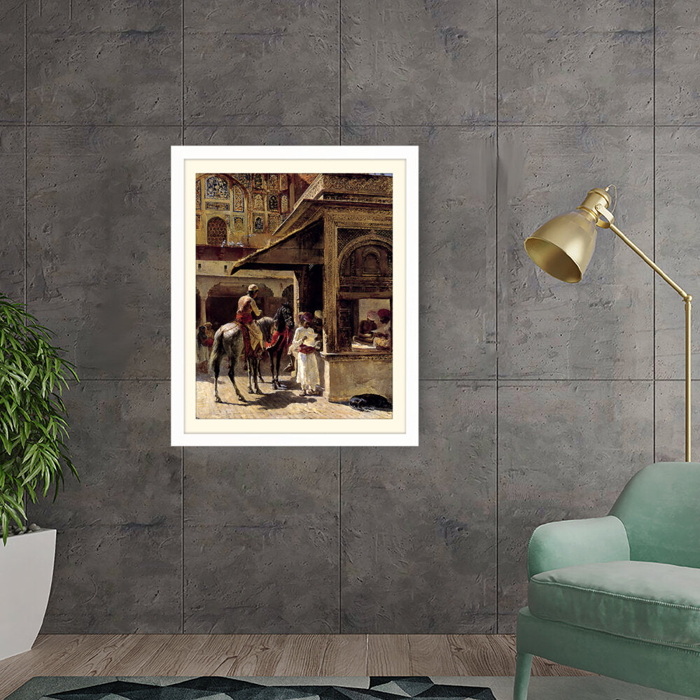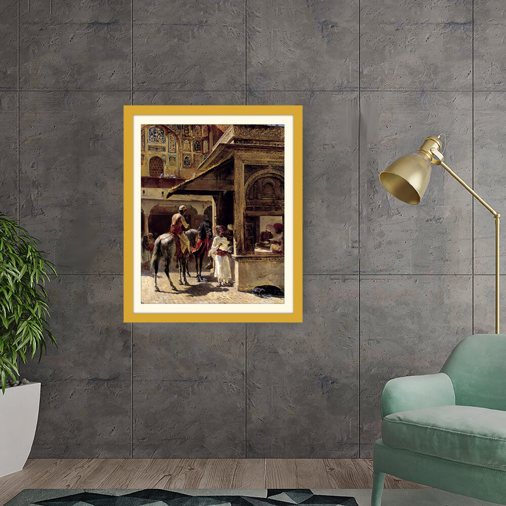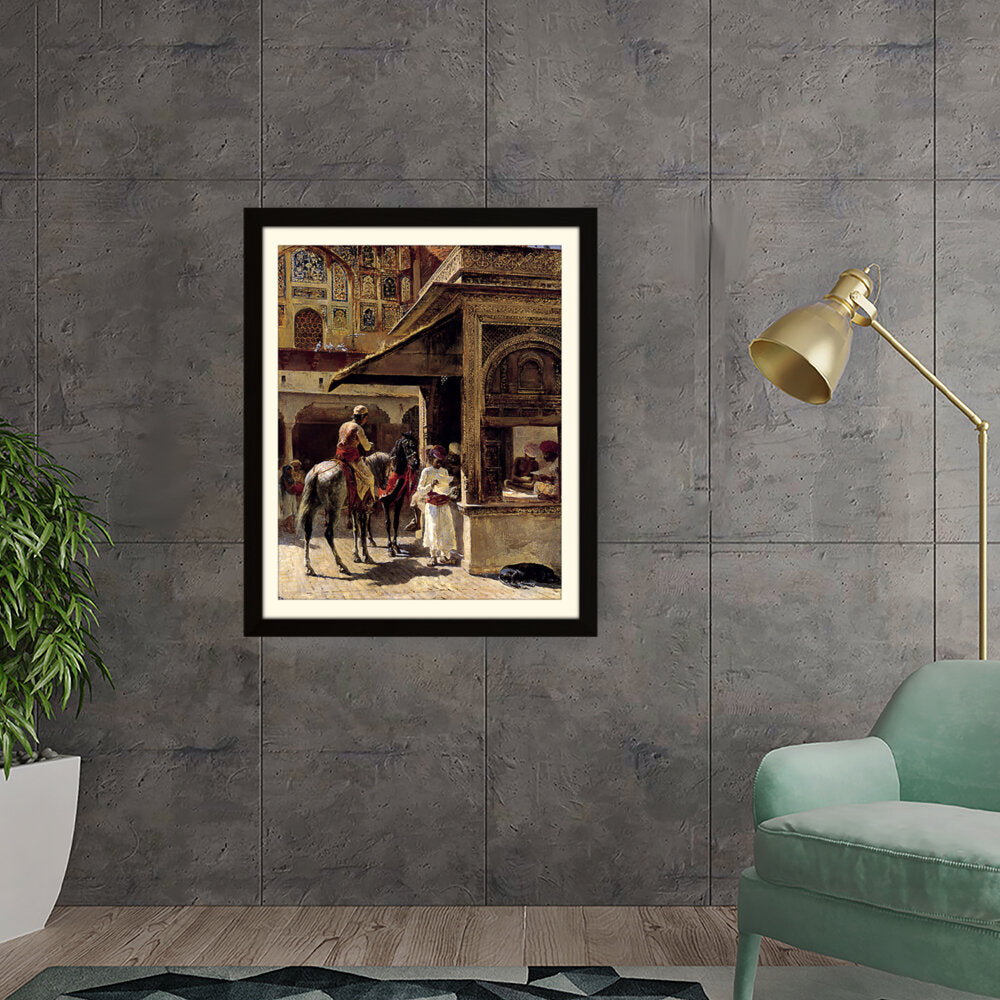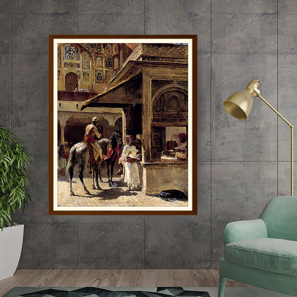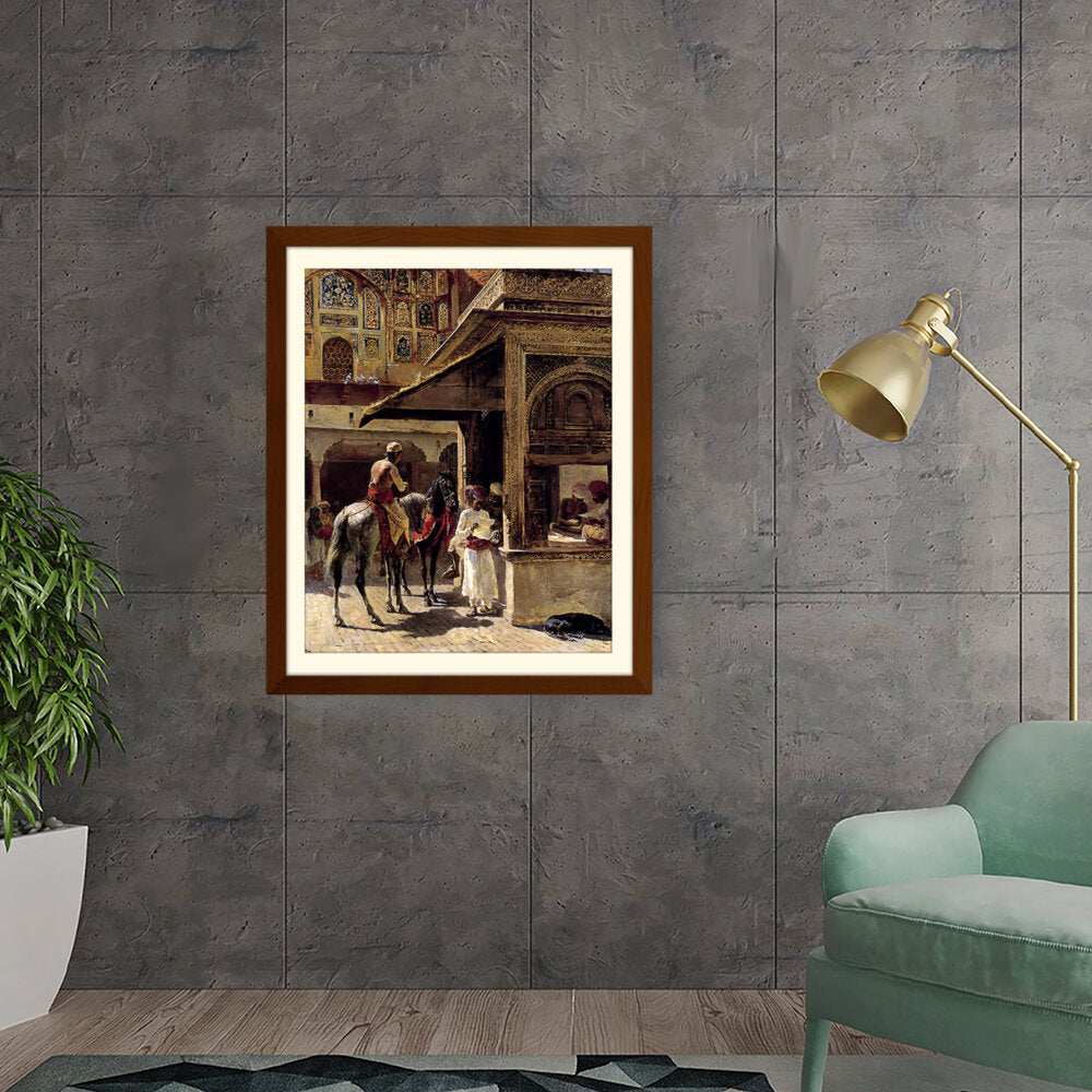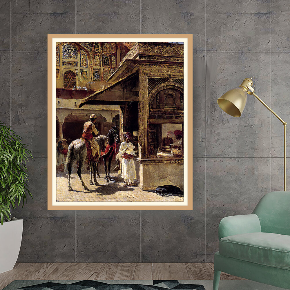 This captivating painting depicts a bustling market scene in India, showcasing traditional attire and daily life. The intricate details and vibrant colors bring the cultural context to life, making it a striking addition to any space.