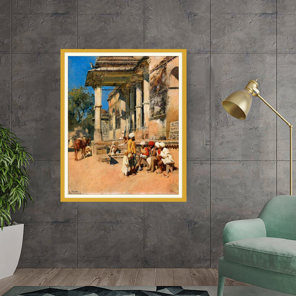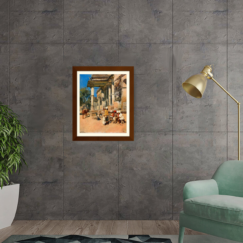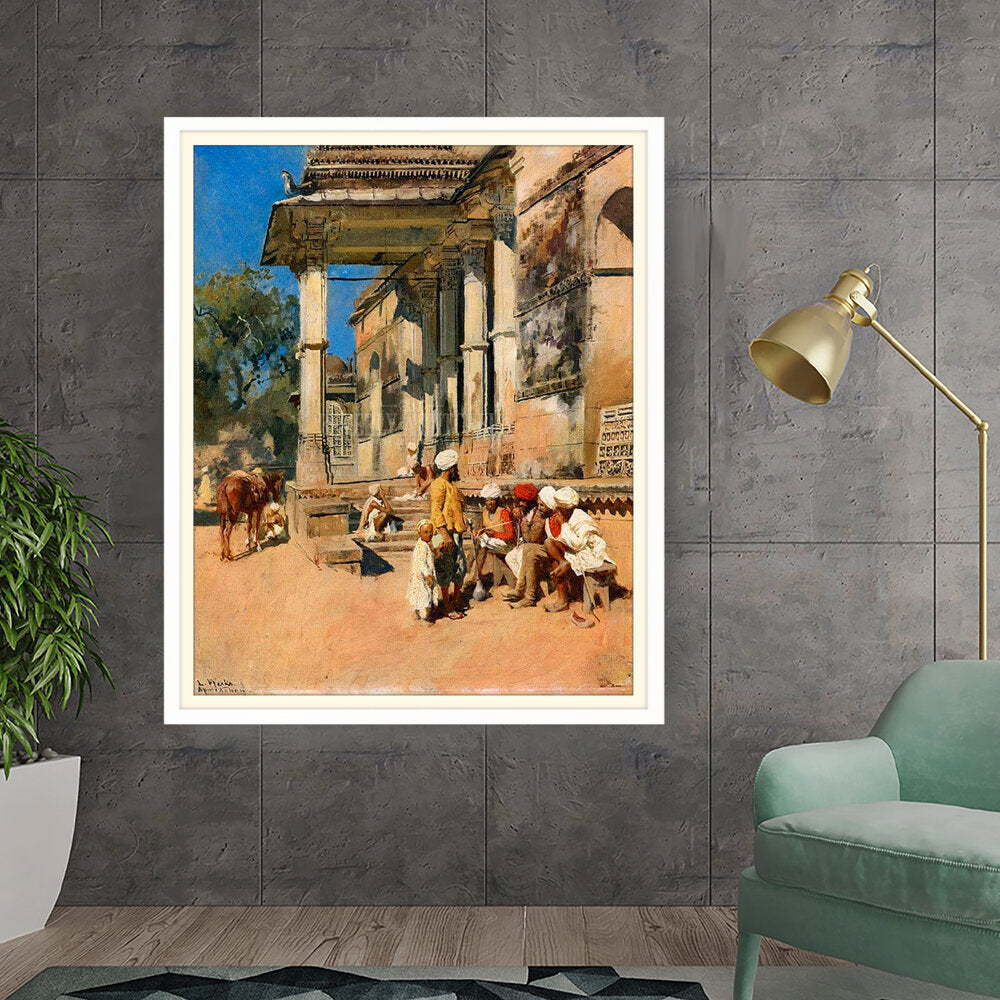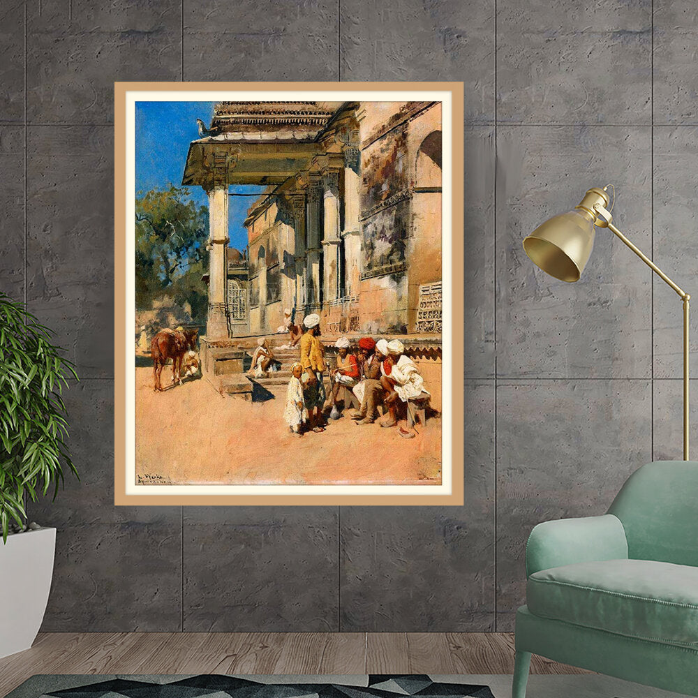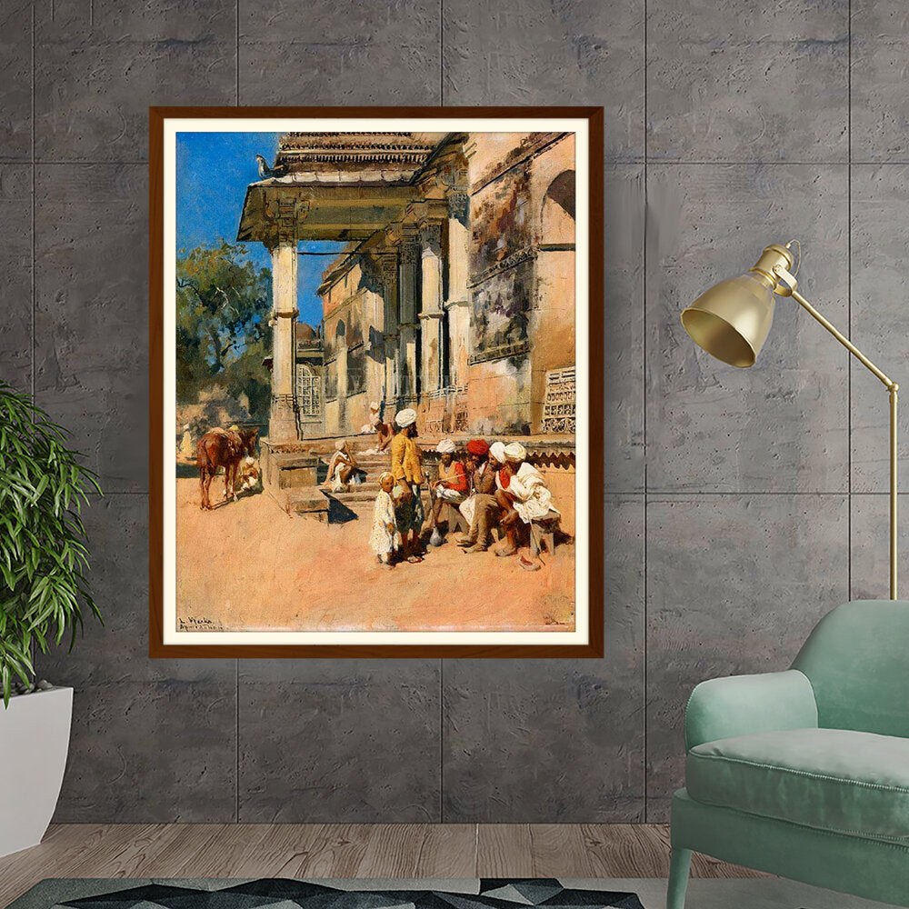 A vibrant depiction of a bustling marketplace scene, capturing daily life with intricate details. The artwork showcases the interactions of people in traditional attire against a backdrop of historical architecture, evoking a sense of cultural richness.