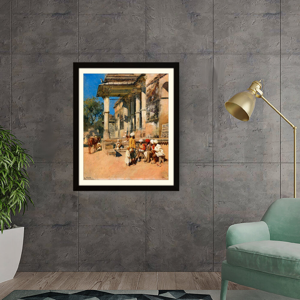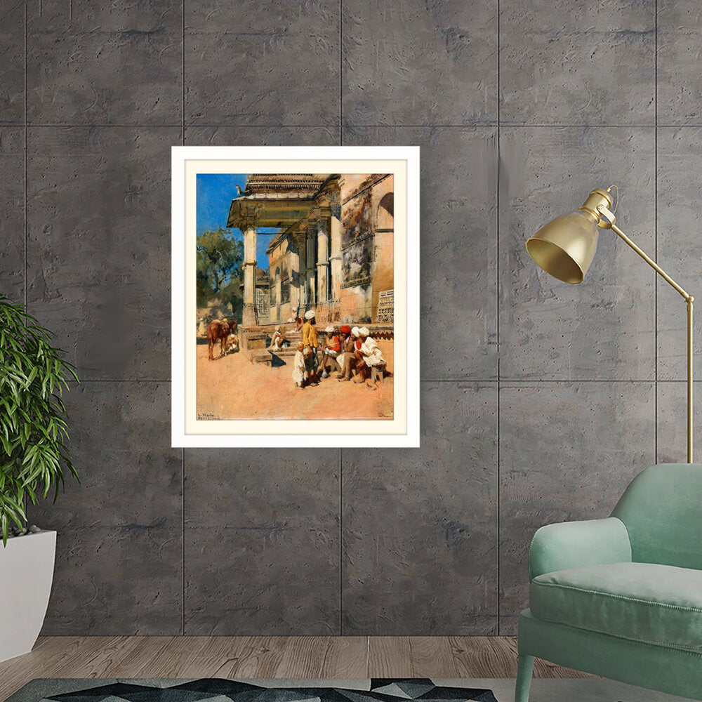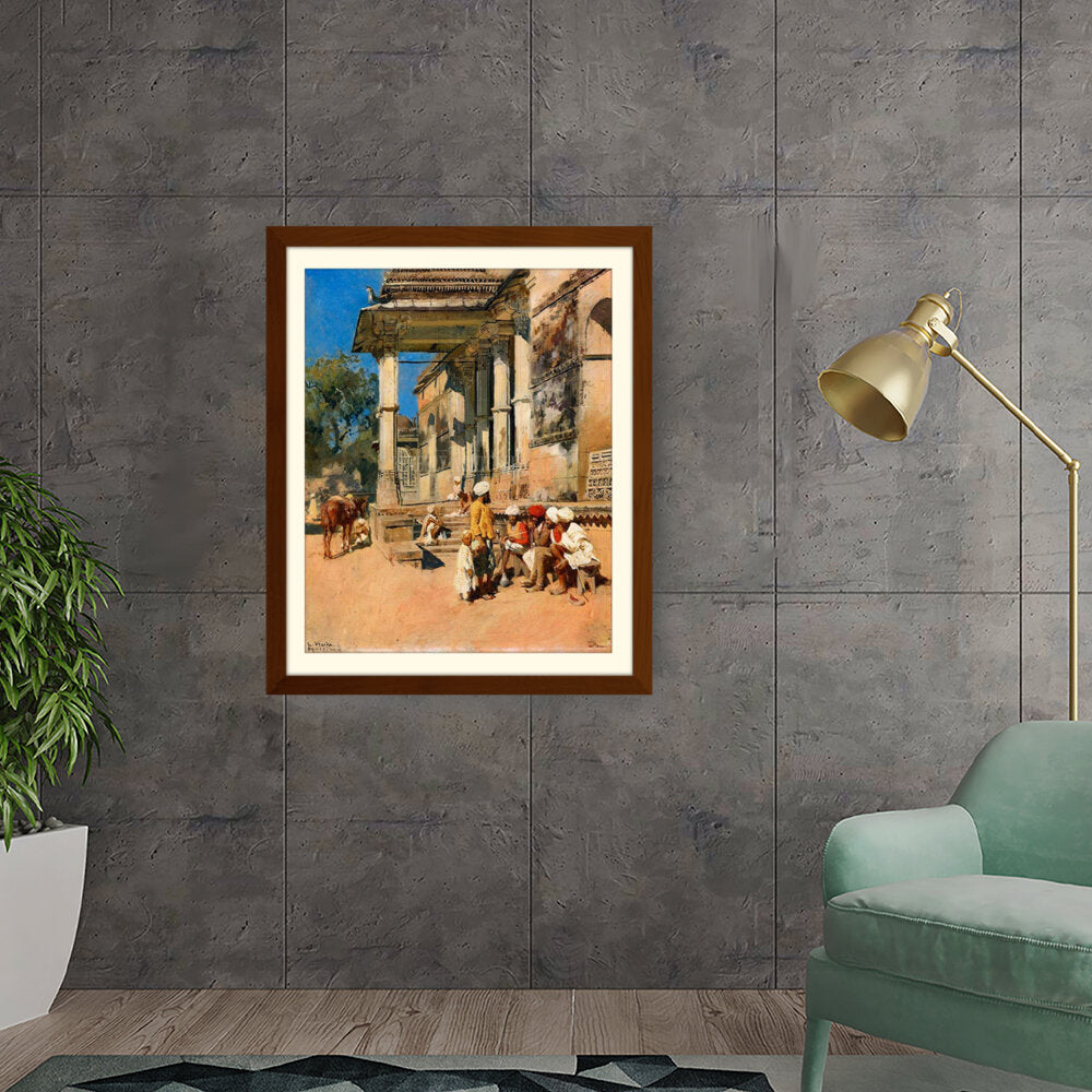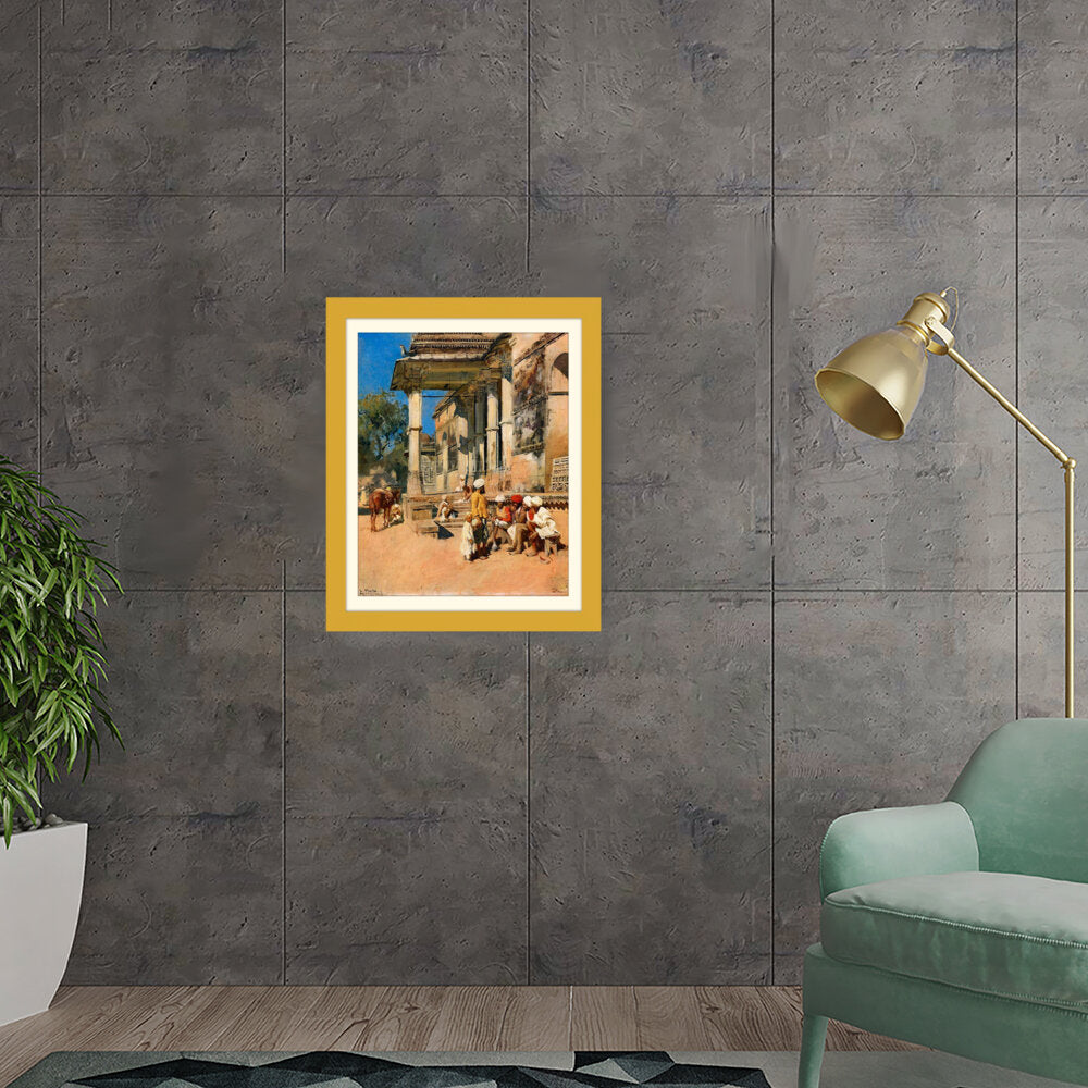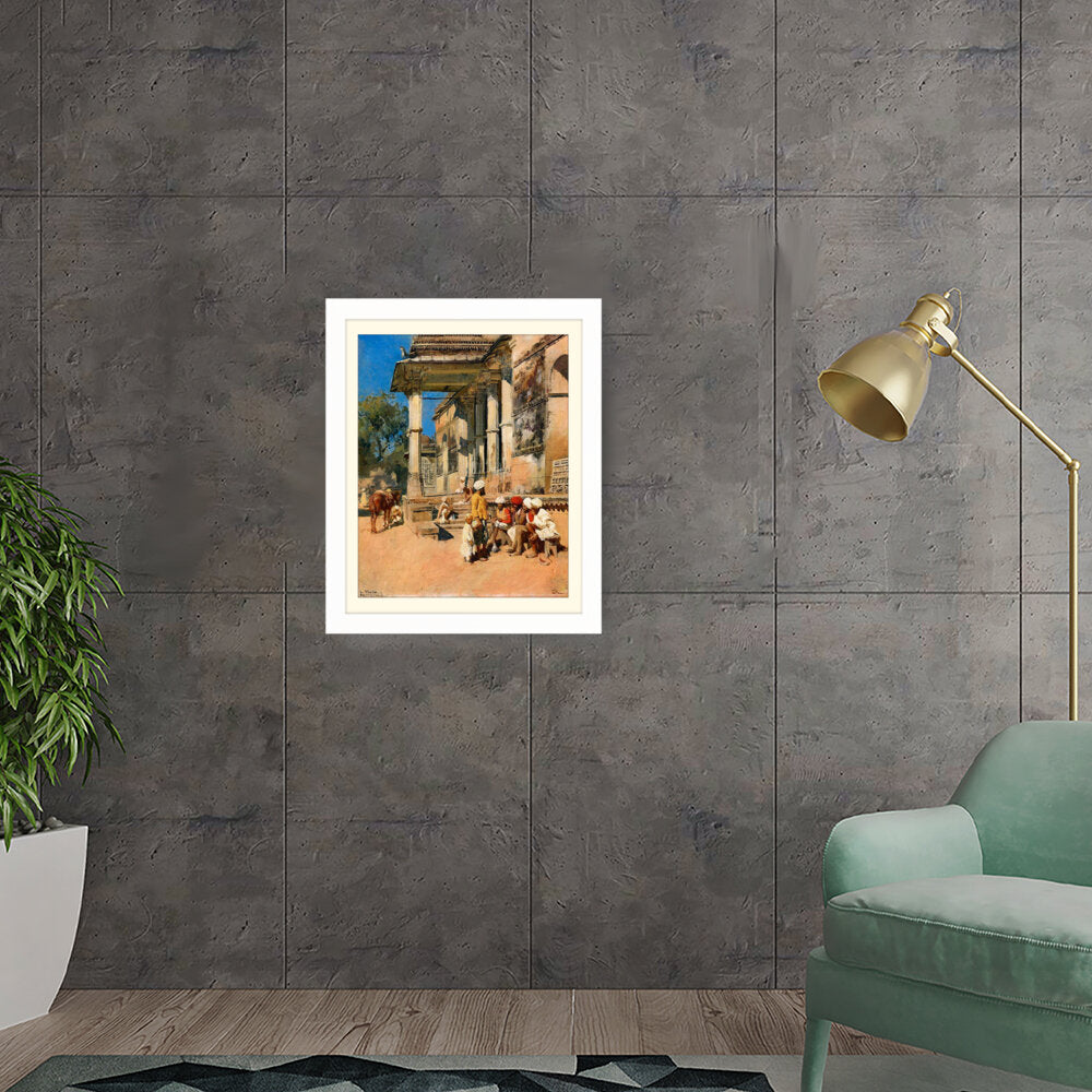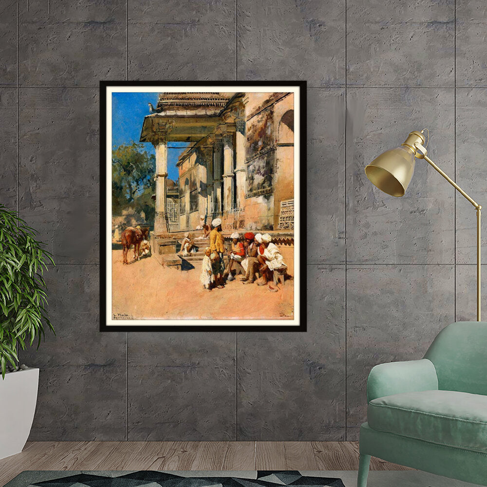 A vibrant depiction of a bustling marketplace scene, capturing daily life with intricate details. The artwork showcases the interactions of people in traditional attire against a backdrop of historical architecture, evoking a sense of cultural richness.