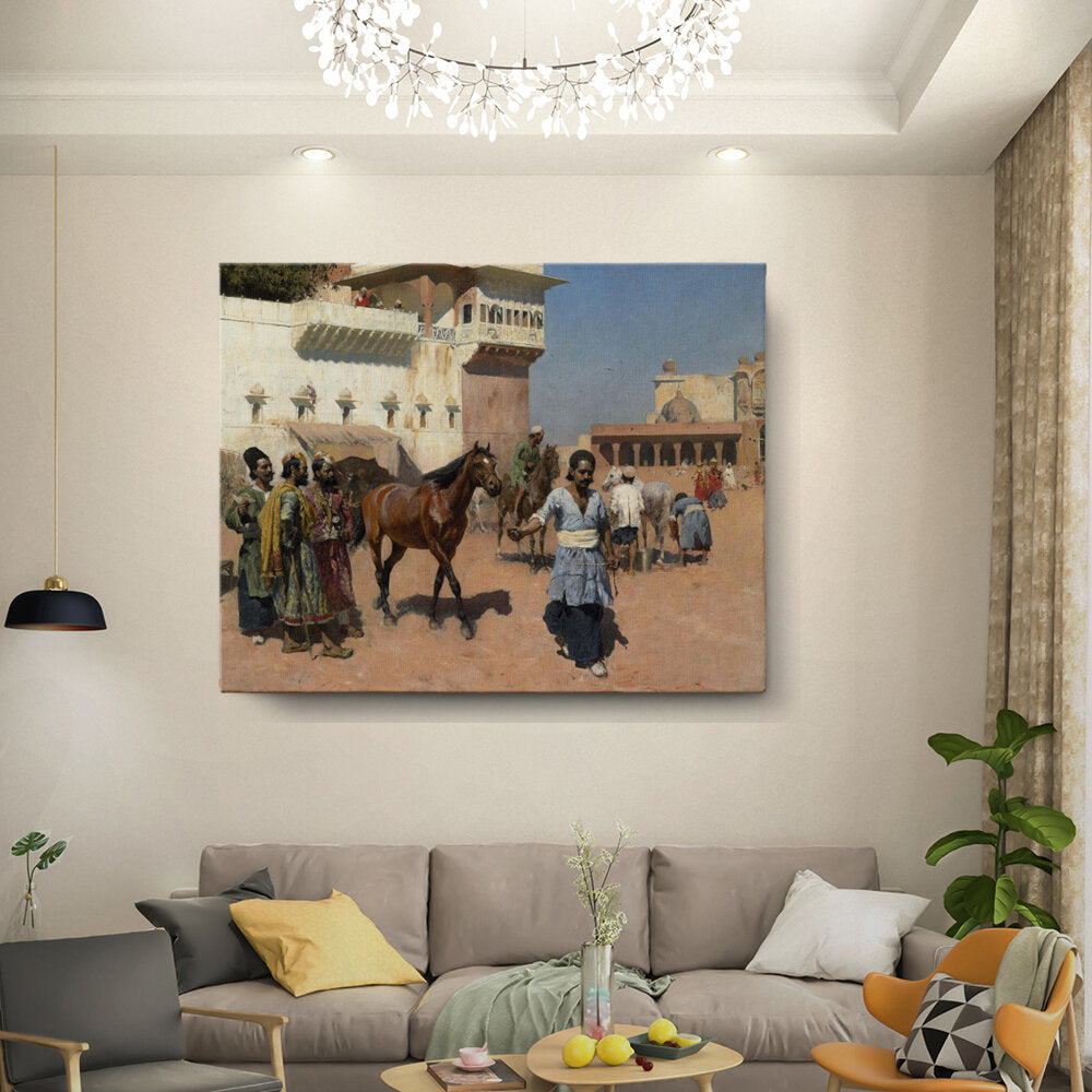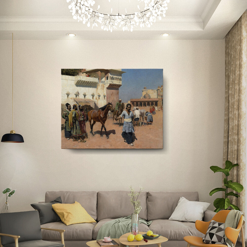 This vibrant painting captures a lively marketplace scene in India, where a horse is led through bustling activity. The detailed depiction of figures and architecture reflects the rich culture and tradition of the region.