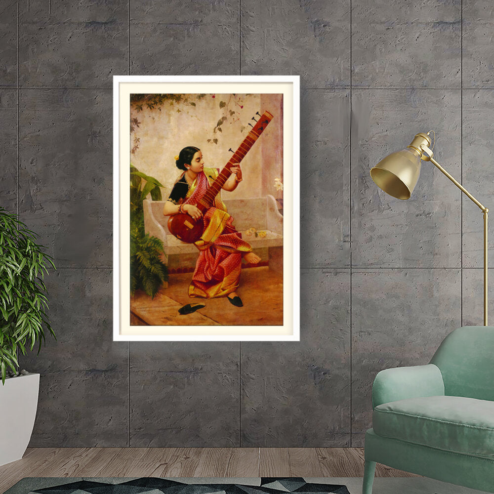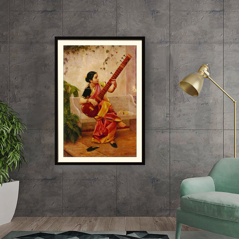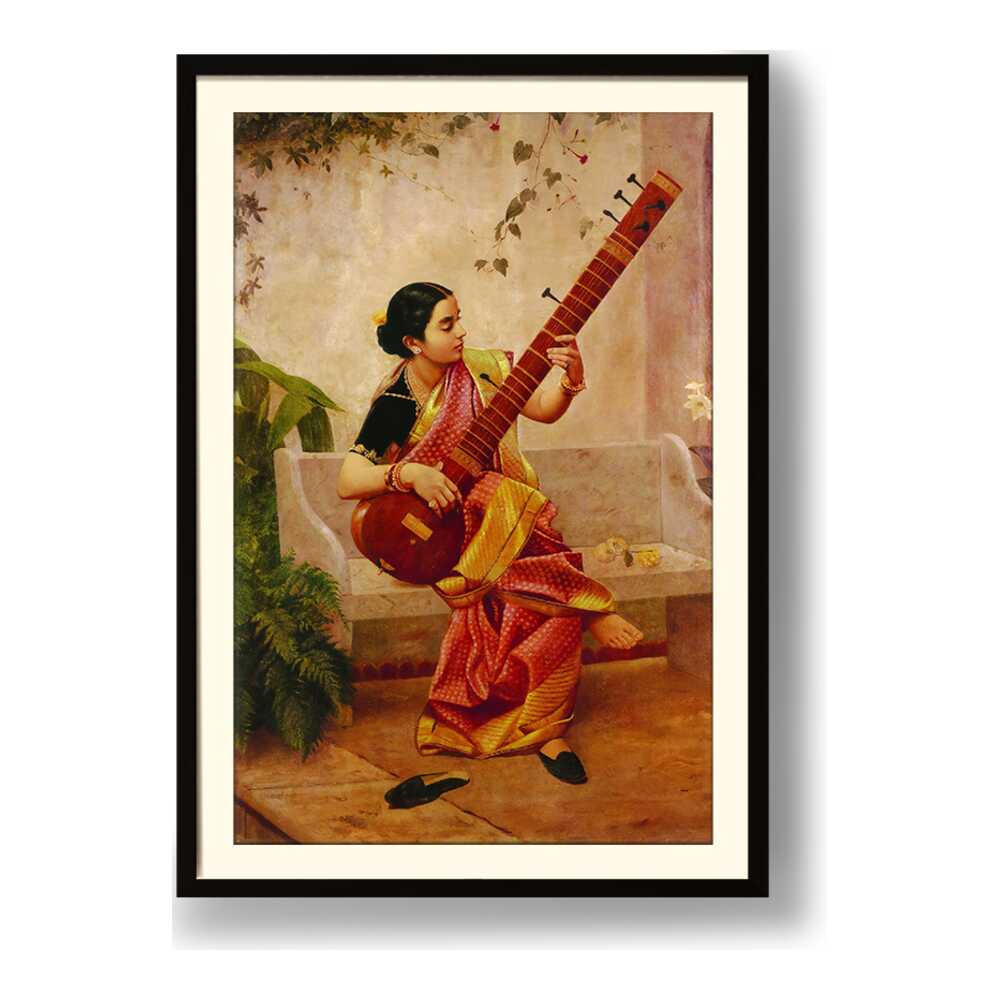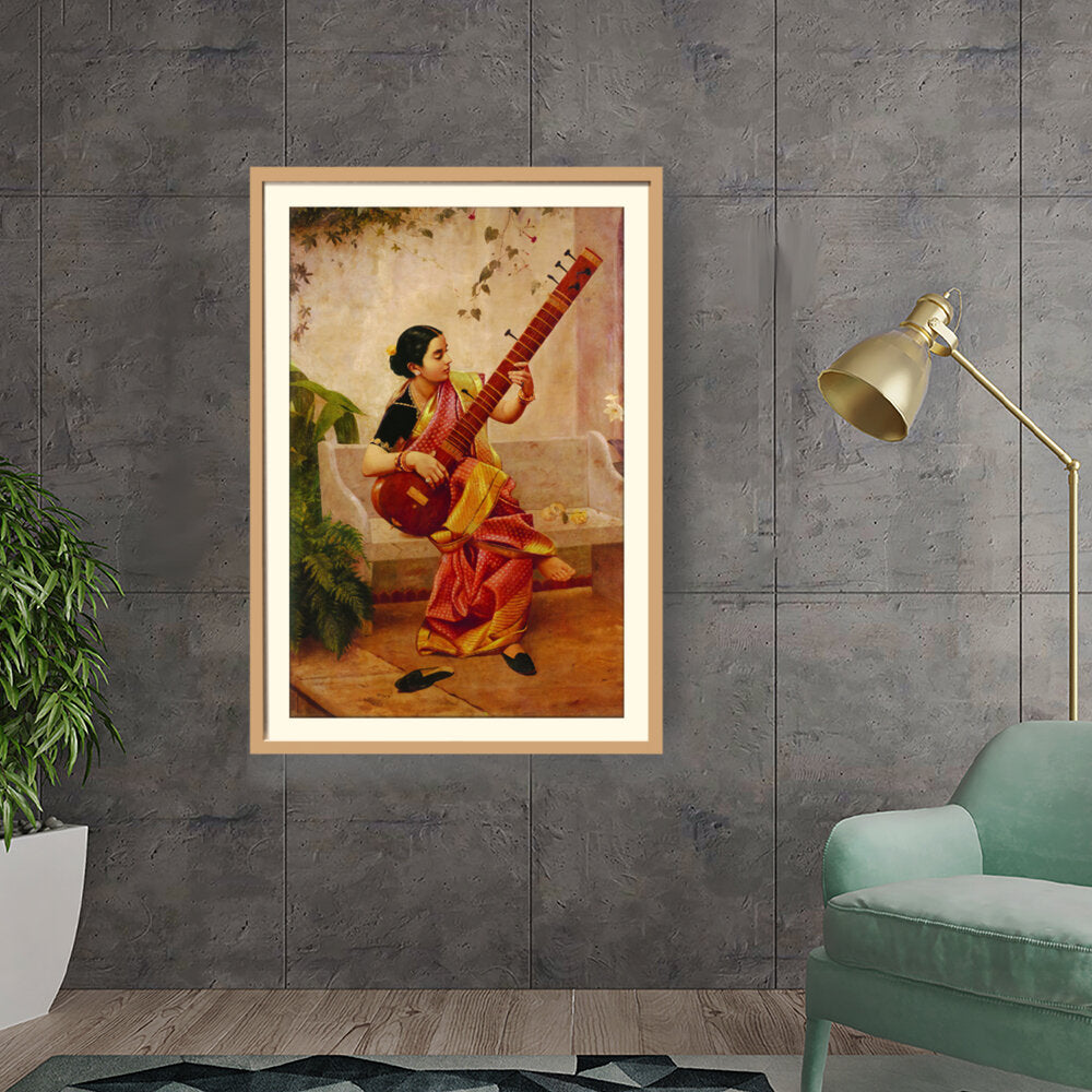 This beautiful oil painting captures a serene moment of a woman playing the veena, symbolizing the rich...