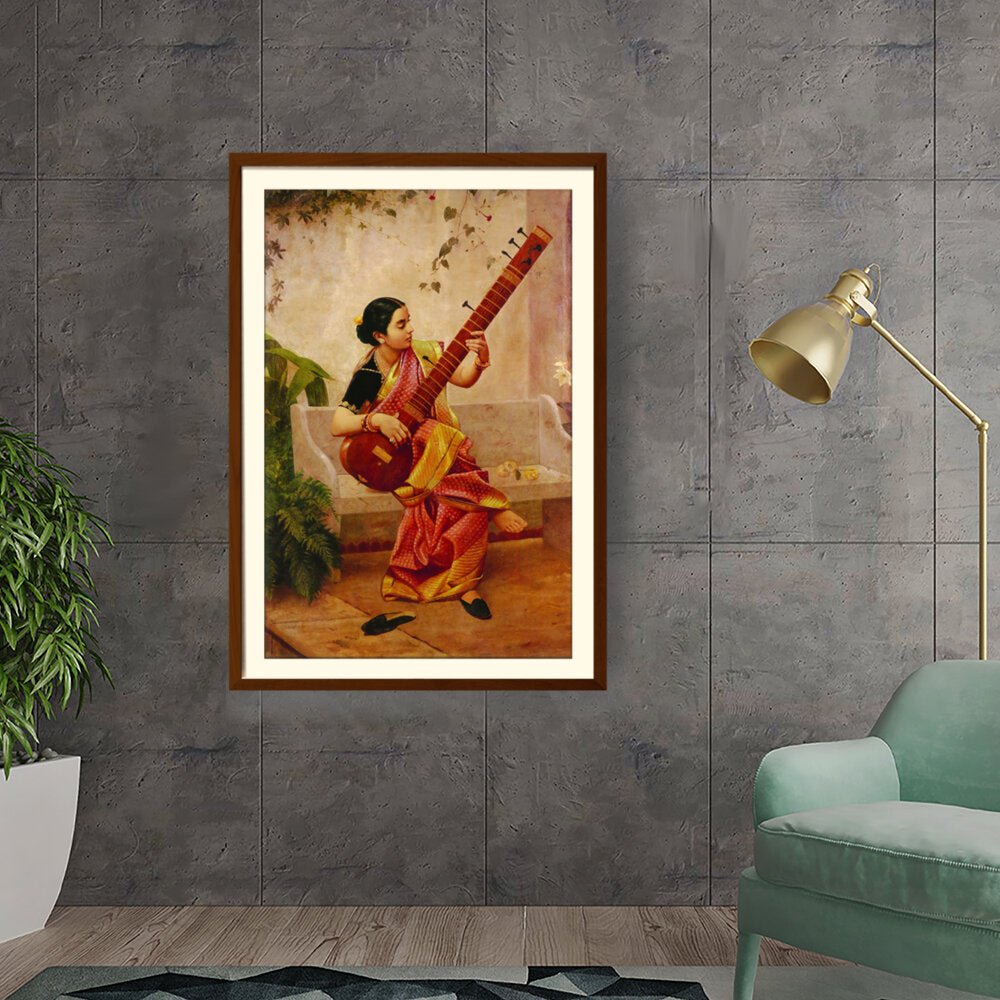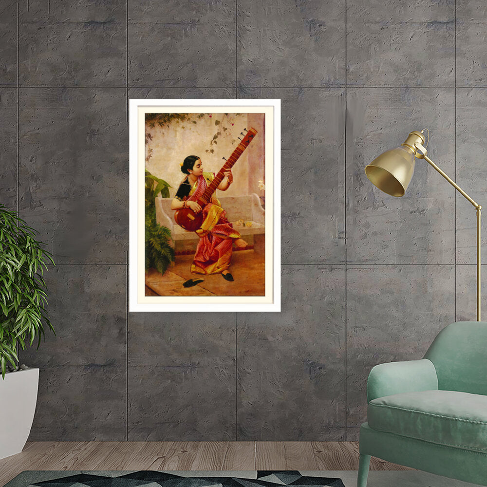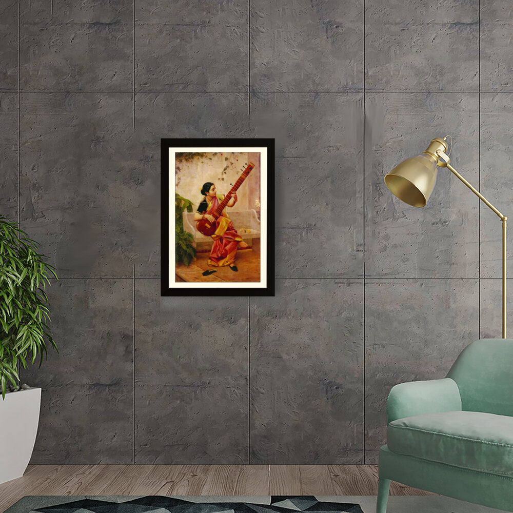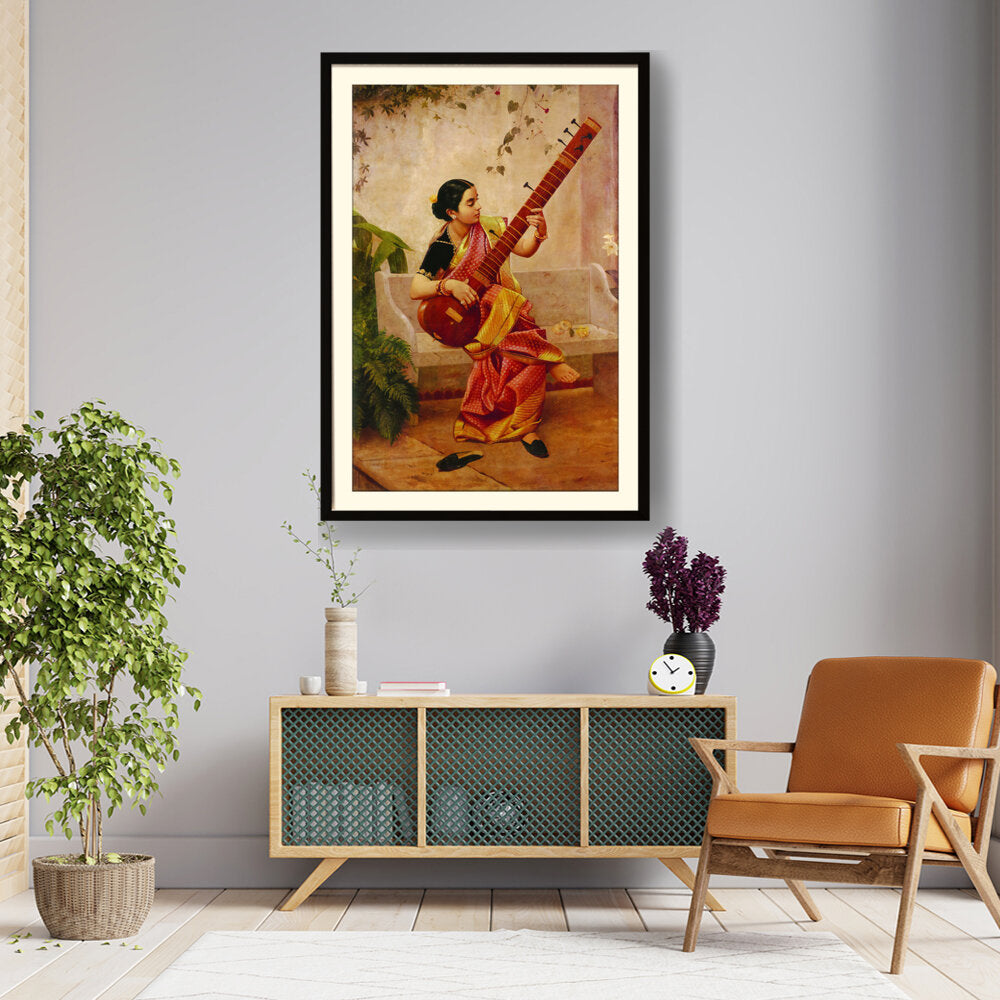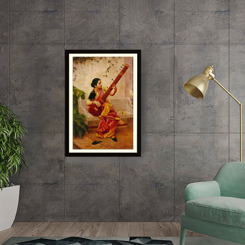 This beautiful oil painting captures a serene moment of a woman playing the veena, symbolizing the rich...