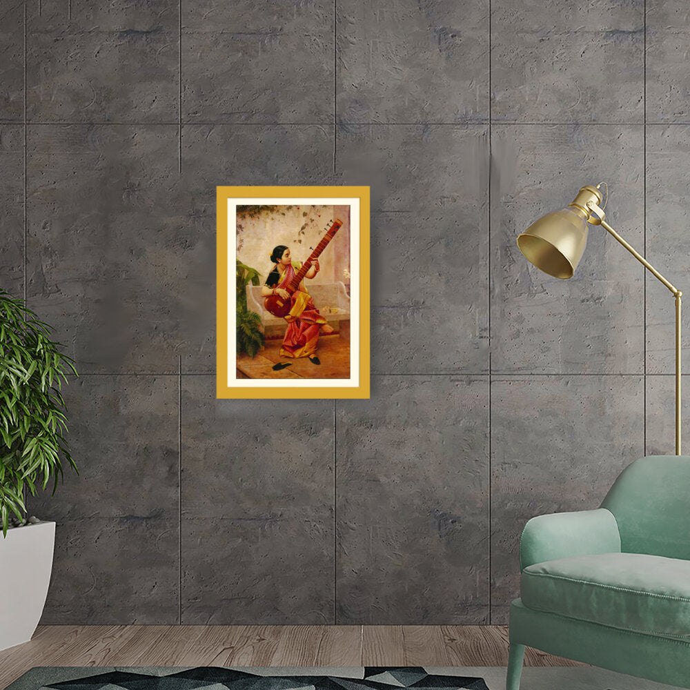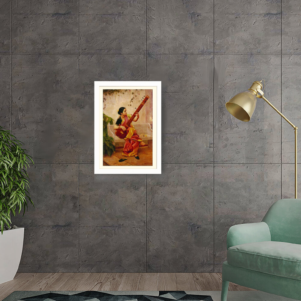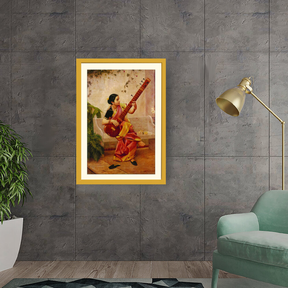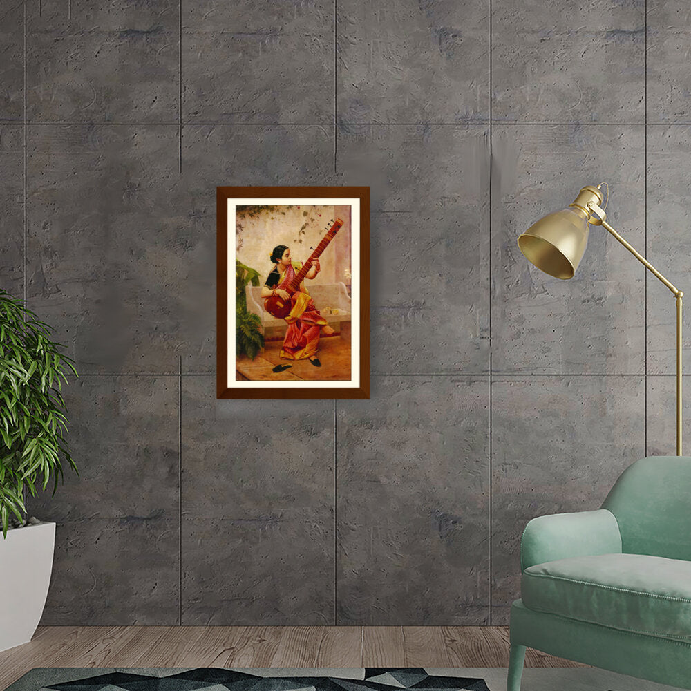 This beautiful oil painting captures a serene moment of a woman playing the veena, symbolizing the rich...