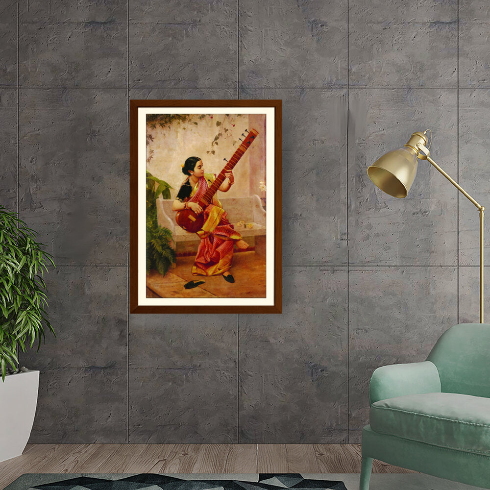 This beautiful oil painting captures a serene moment of a woman playing the veena, symbolizing the rich cultural heritage of Indian classical music. Her attire adds vibrant colors and an aura of tranquility to the artwork, making it an exquisite addition to any space.
