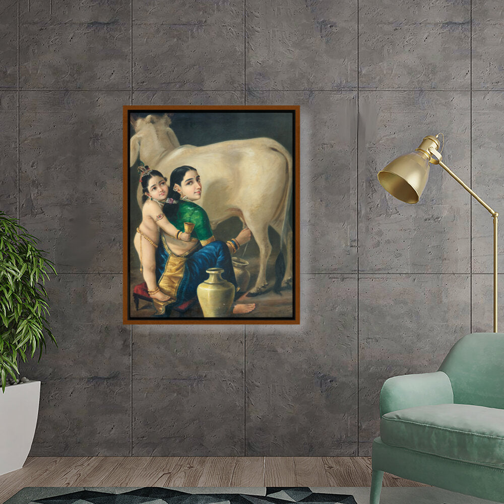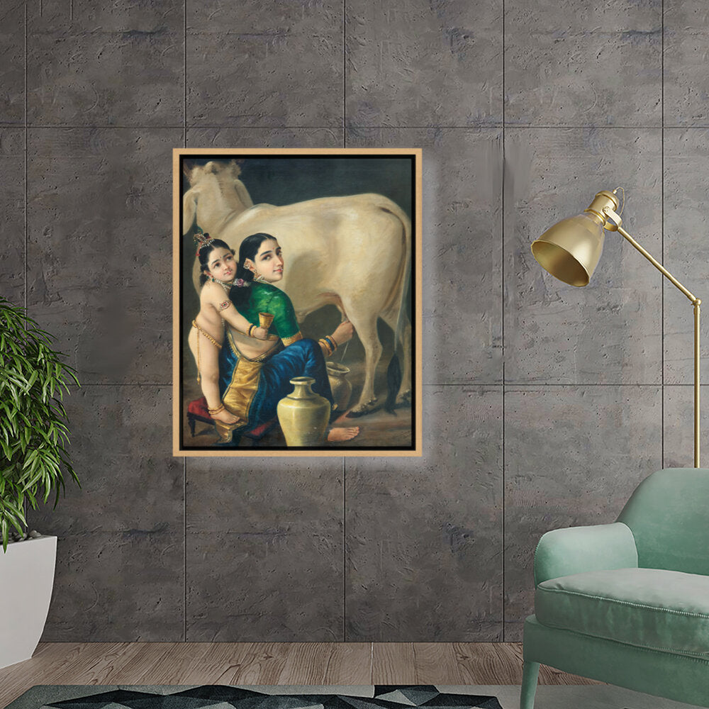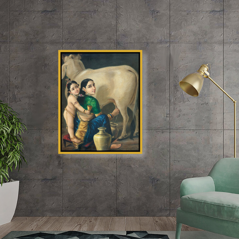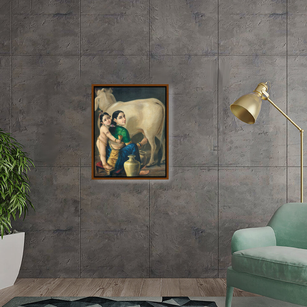 This beautiful oil painting depicts a mother and her child in a serene moment, capturing traditional Indian rural life. The warm colors and intricate details bring forth a sense of intimacy and connection with nature, perfect for enhancing any living space.