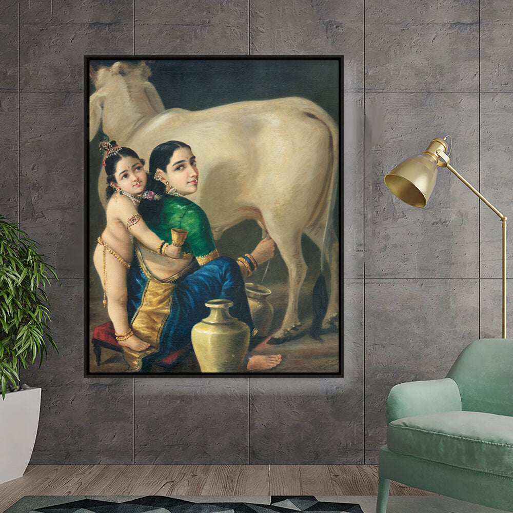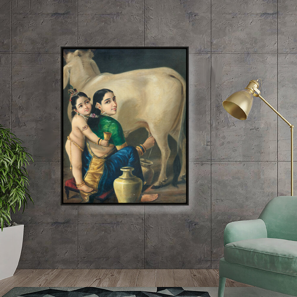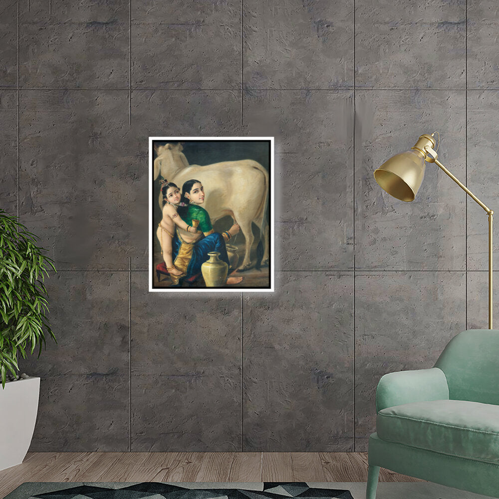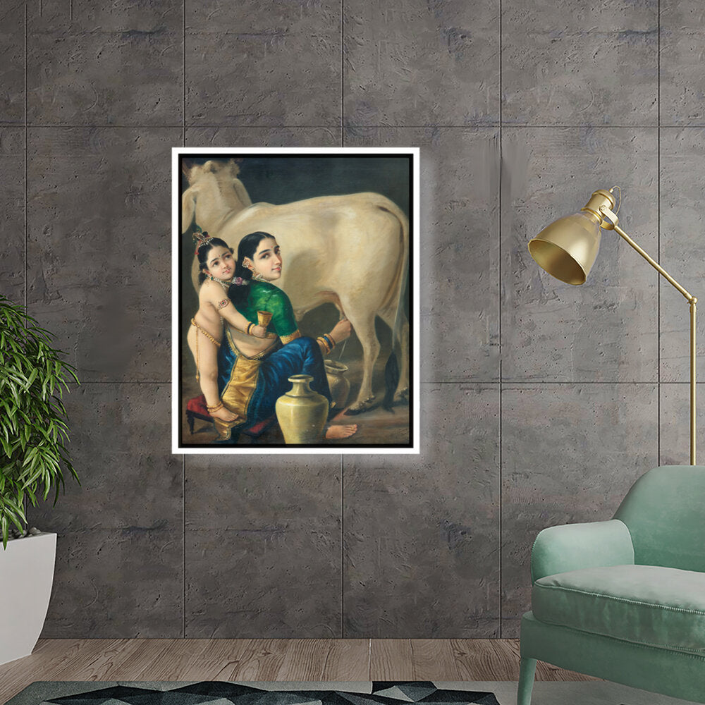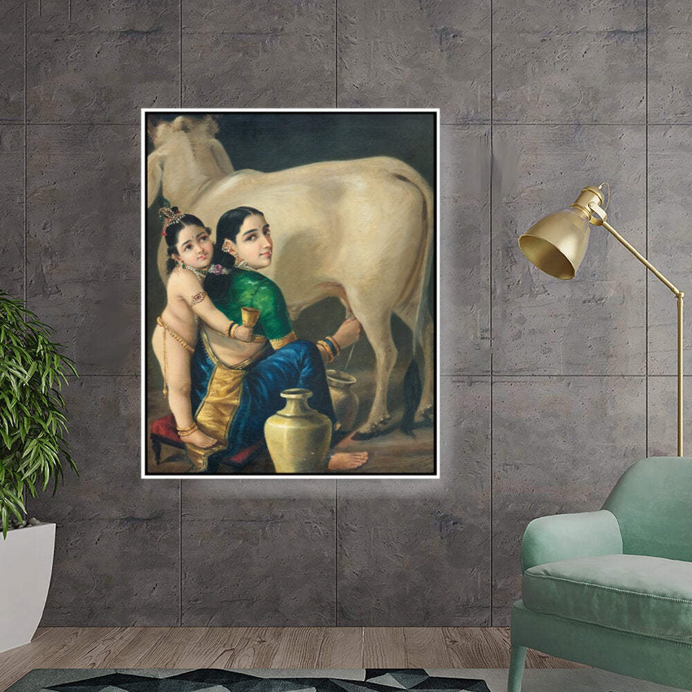This beautiful oil painting depicts a mother and her child in a serene moment, capturing traditional Indian rural life. The warm colors and intricate details bring forth a sense of intimacy and connection with nature, perfect for enhancing any living space.