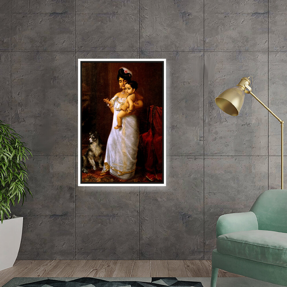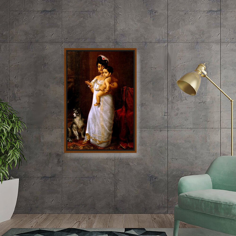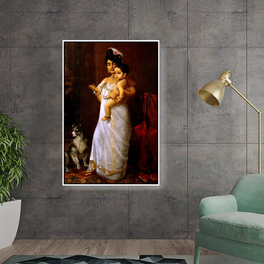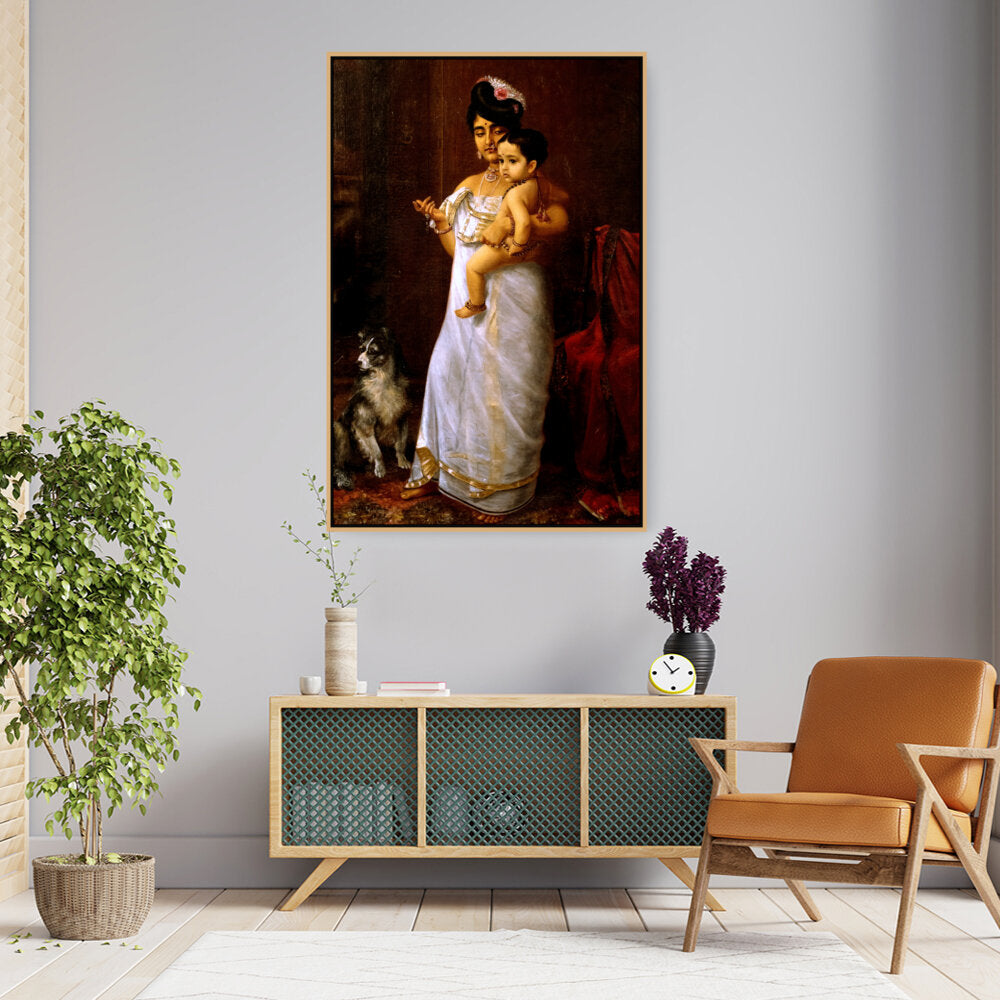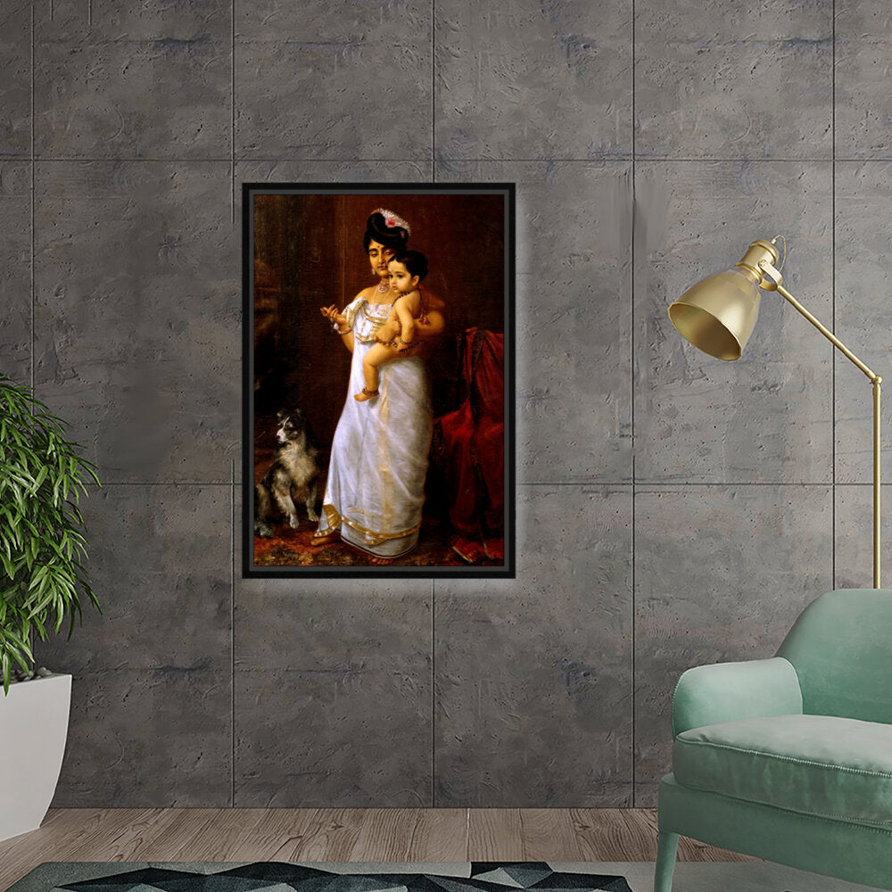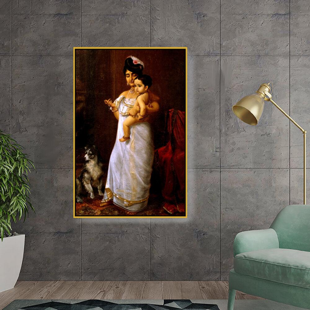 This beautiful oil painting depicts a mother lovingly holding her child, showcasing intricate cultural attire and a serene ambiance. The addition of a loyal dog enhances the intimate family scene, making it a captivating focal point for any space.
