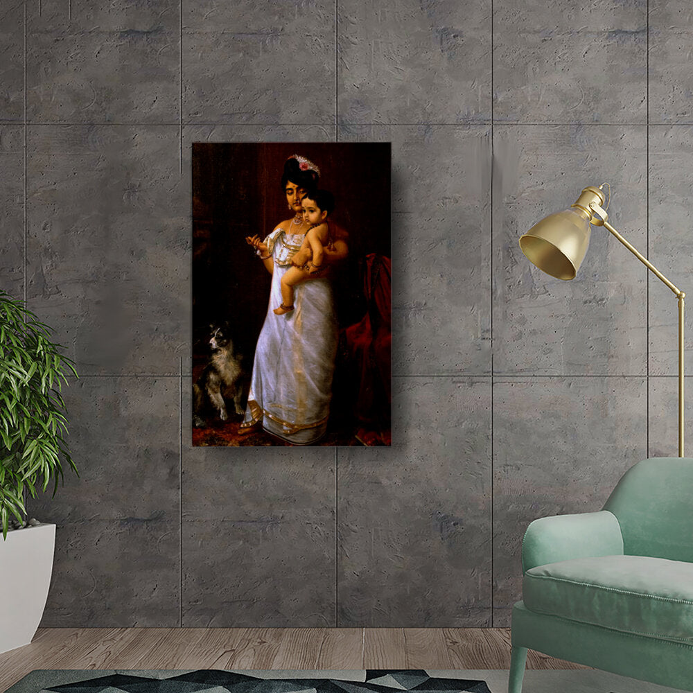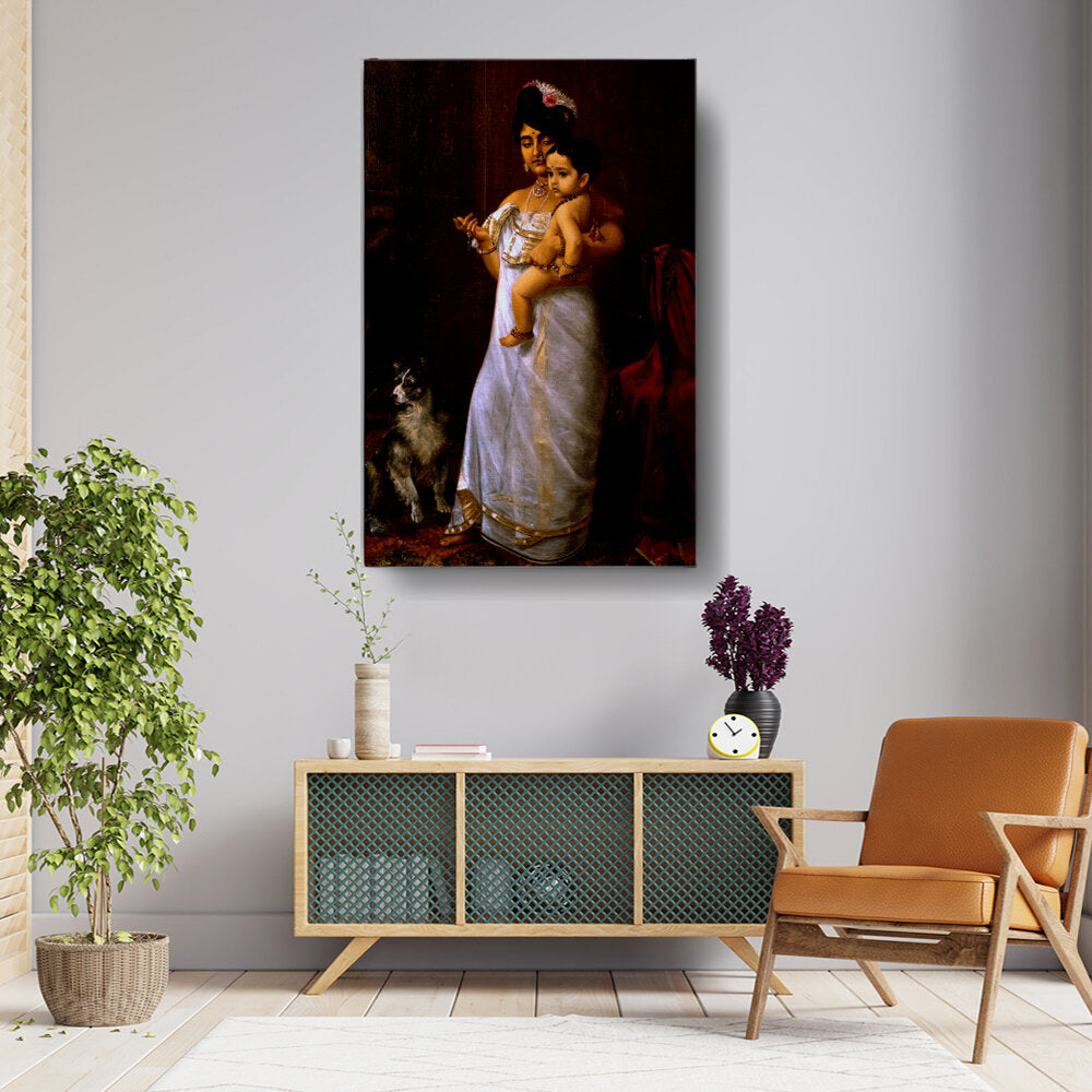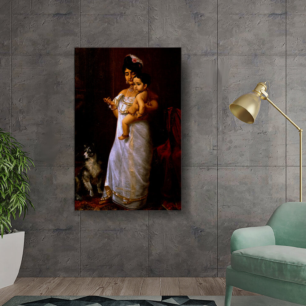This beautiful oil painting depicts a mother lovingly holding her child, showcasing intricate cultural attire and a serene ambiance. The addition of a loyal dog enhances the intimate family scene, making it a captivating focal point for any space.