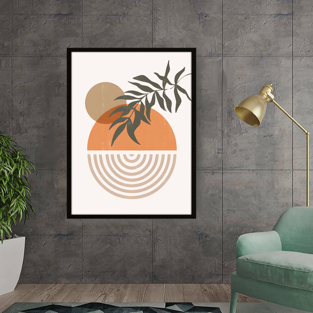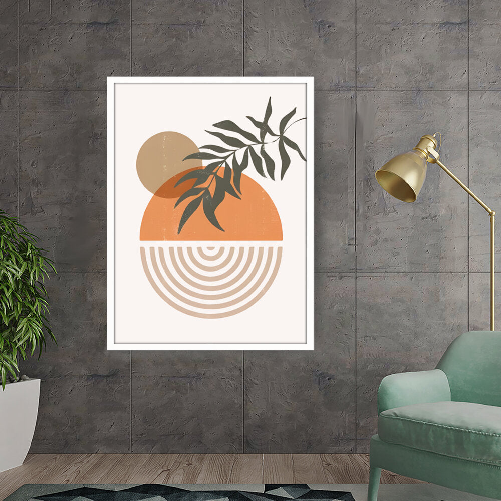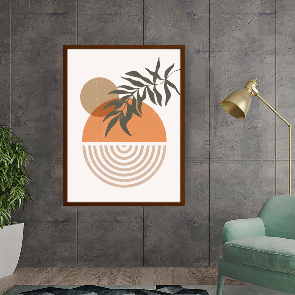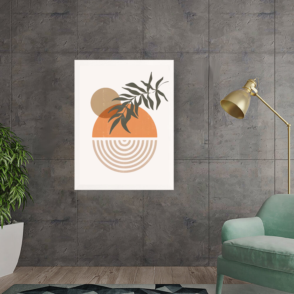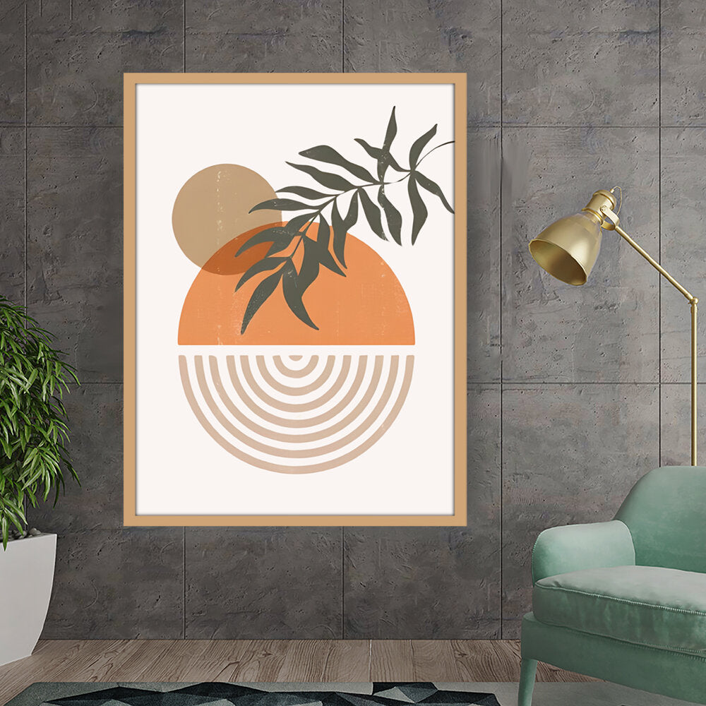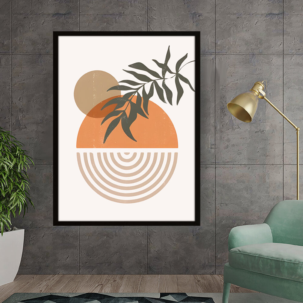 This modern digital illustration beautifully balances organic shapes and geometric patterns. The earthy tones and foliage add a calming touch, making it an ideal statement piece for contemporary interiors.
