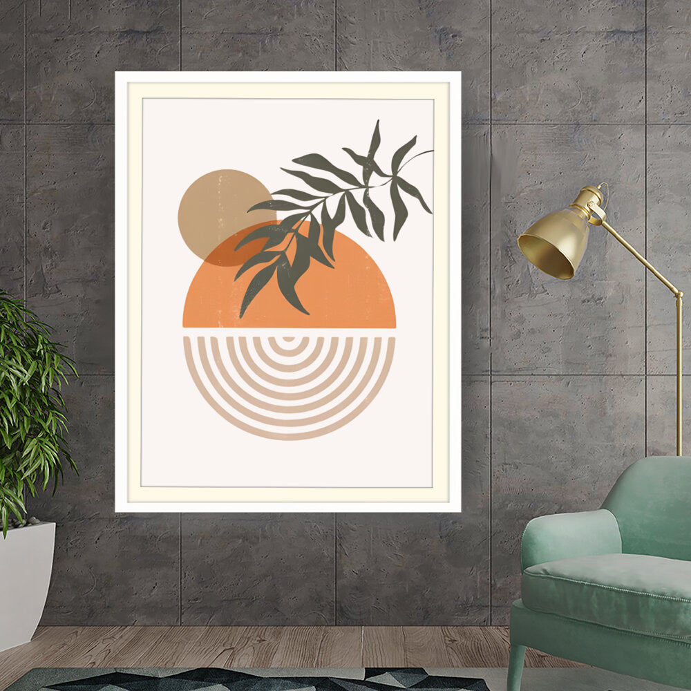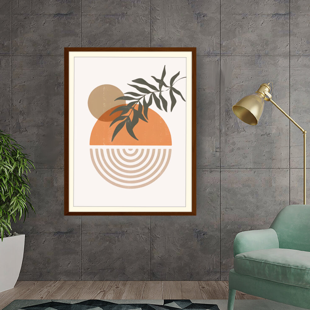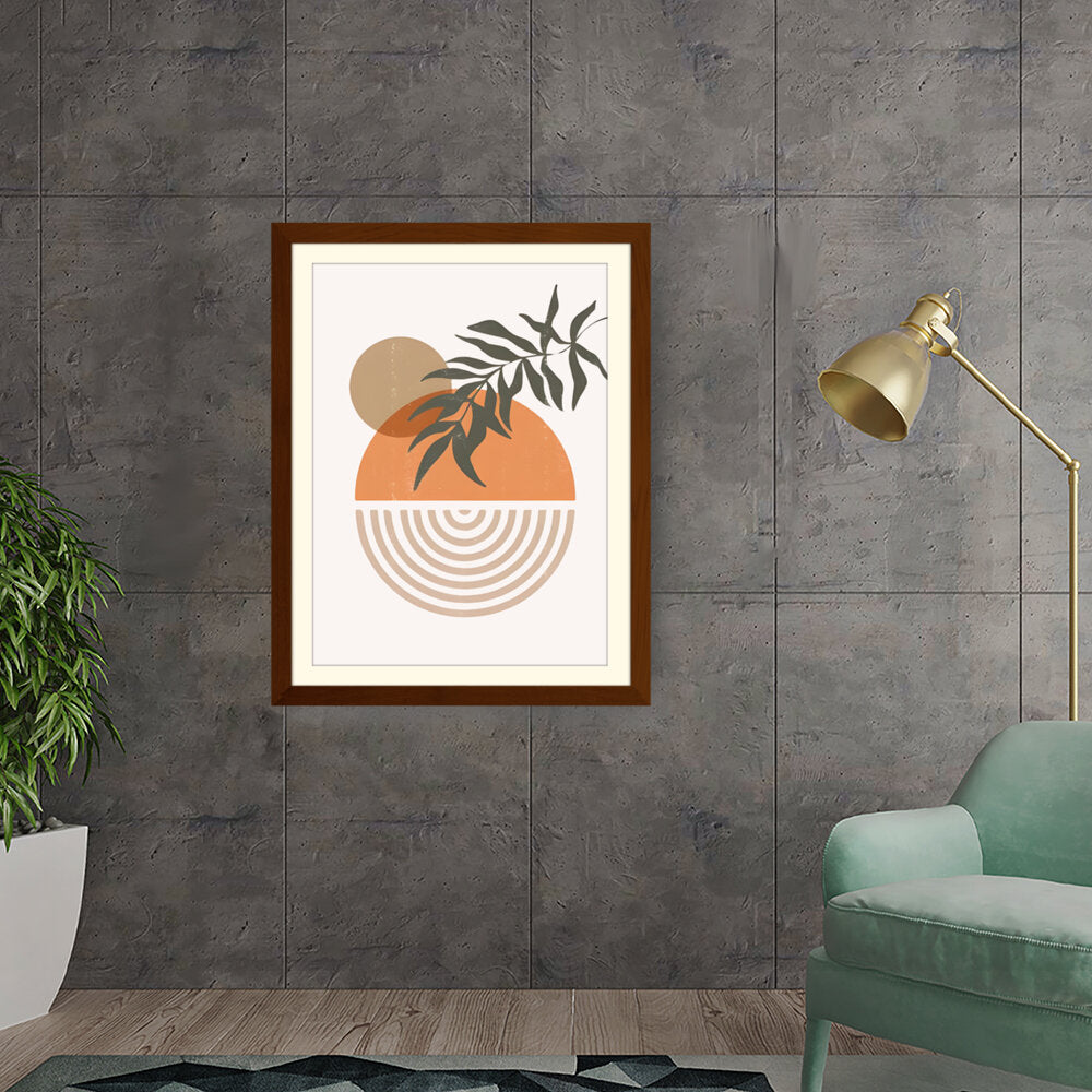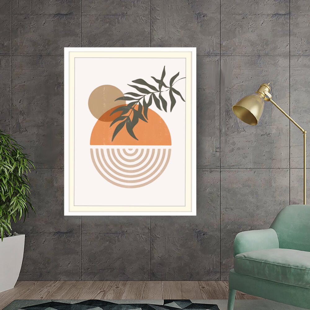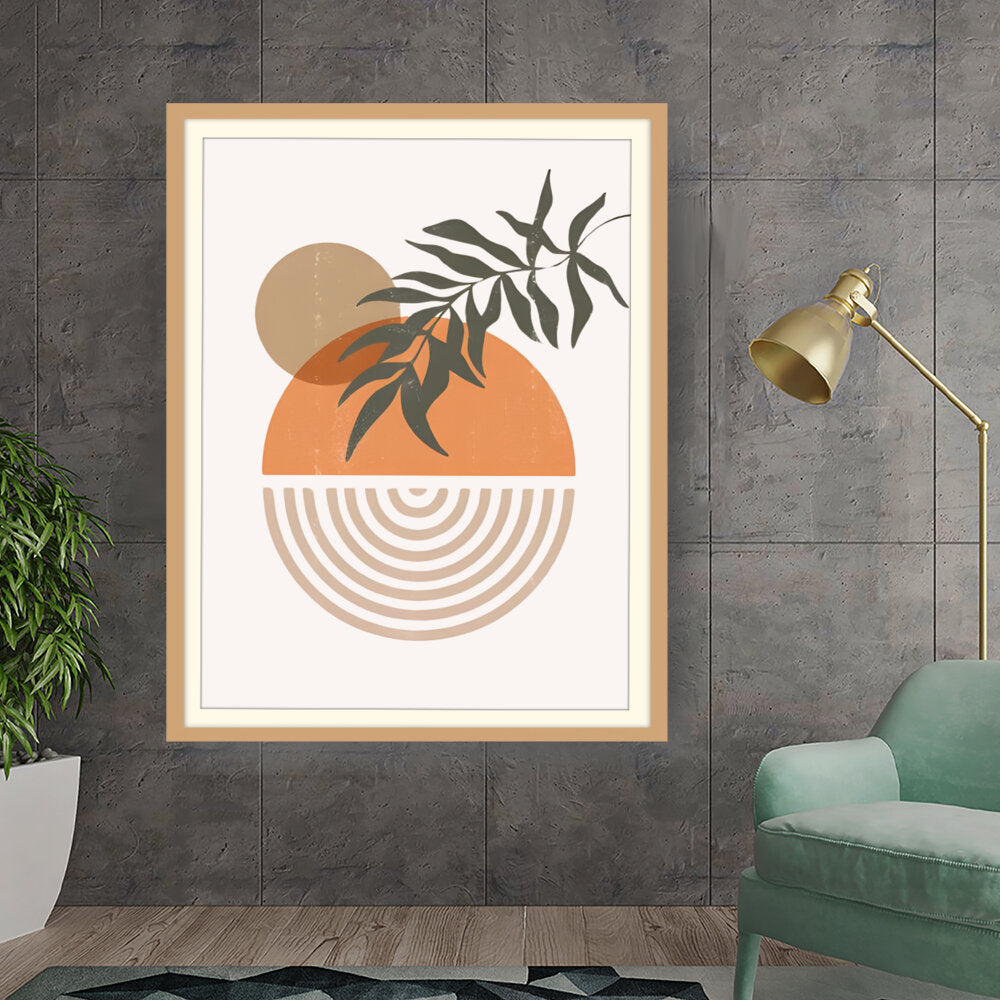 This modern digital illustration beautifully balances organic shapes and geometric patterns. The earthy tones and foliage add a calming touch, making it an ideal statement piece for contemporary interiors.