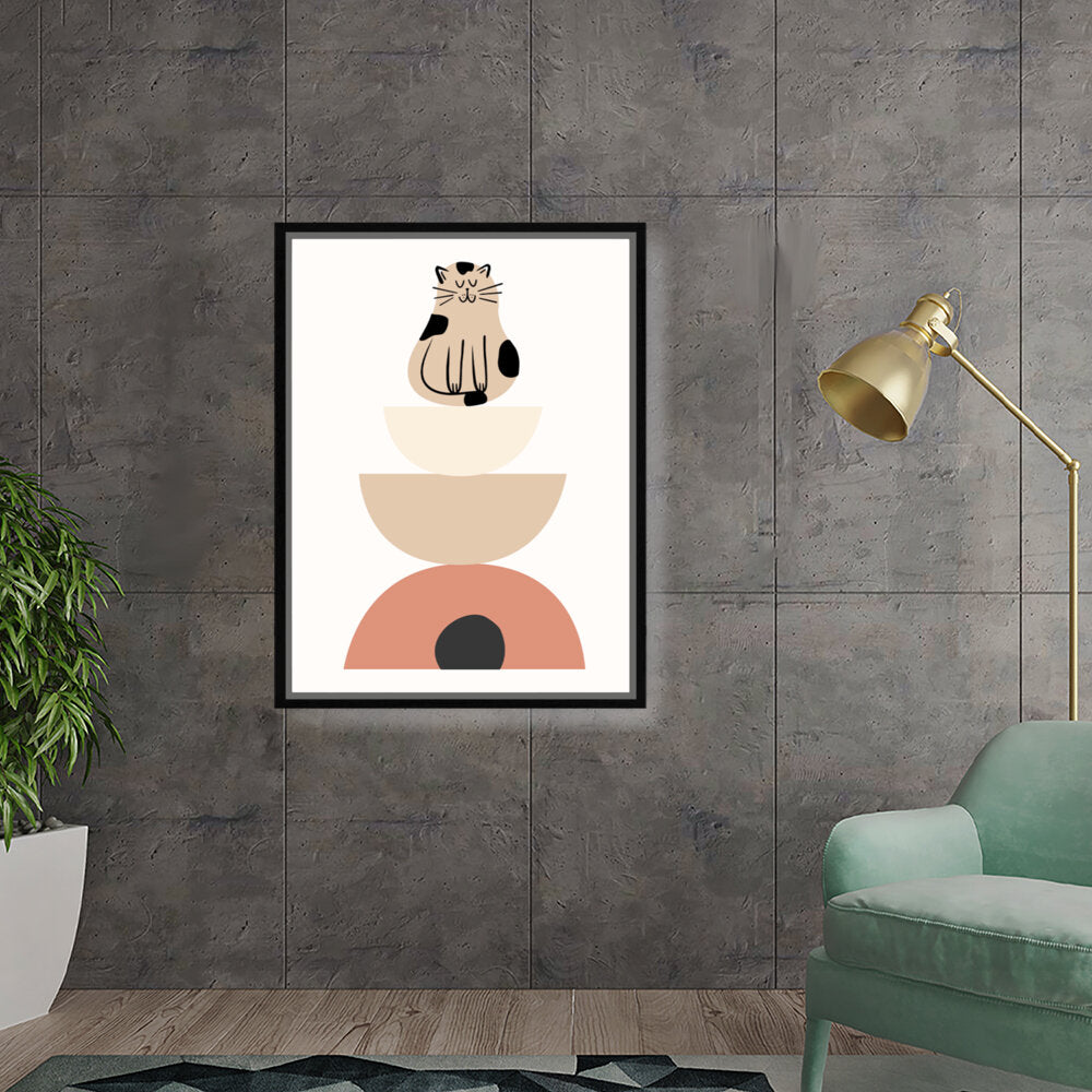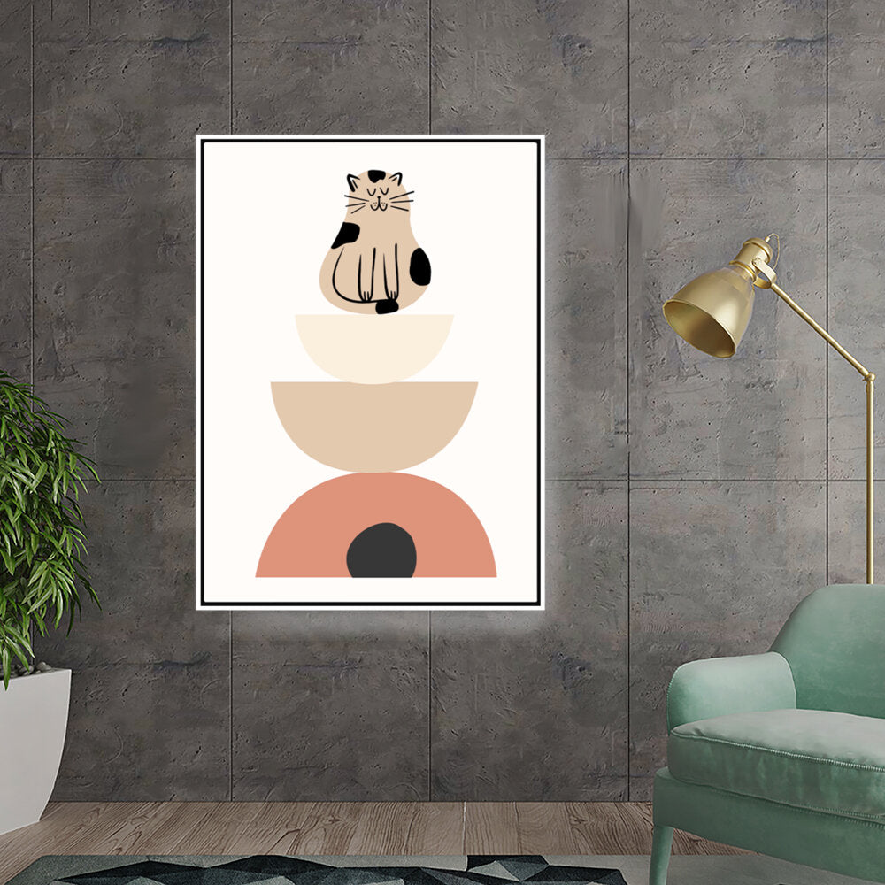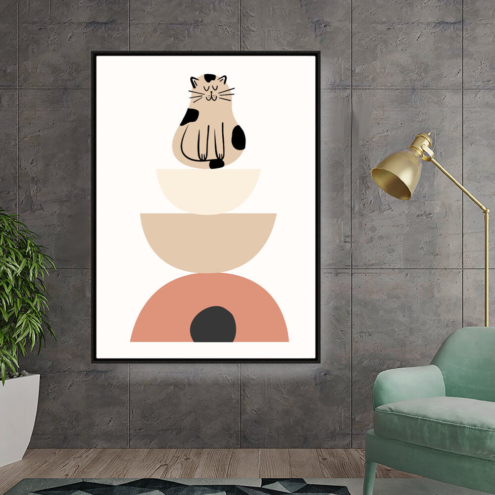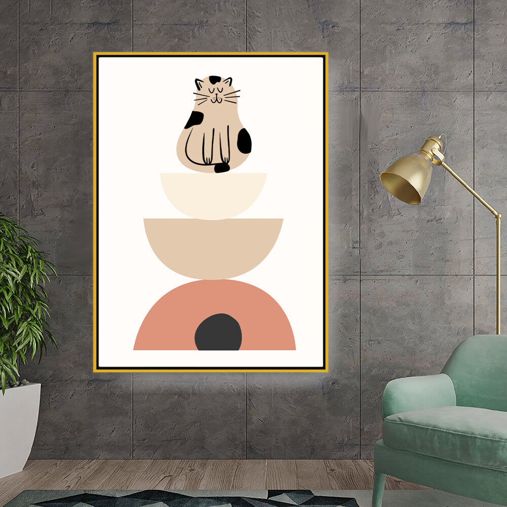 This charming digital illustration features a playful cat sitting atop a stack of geometric shapes, creating a whimsical and contemporary aesthetic perfect for any modern space. The soft color palette adds a cozy touch, making it ideal for living rooms or creative studios.