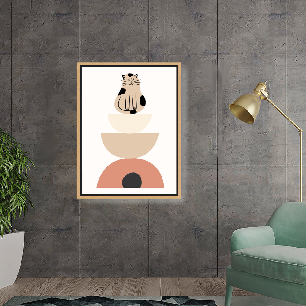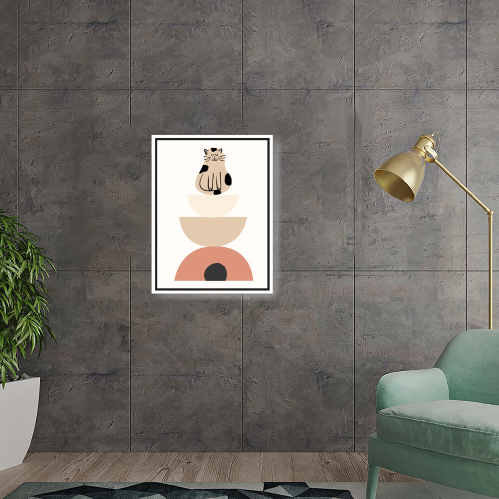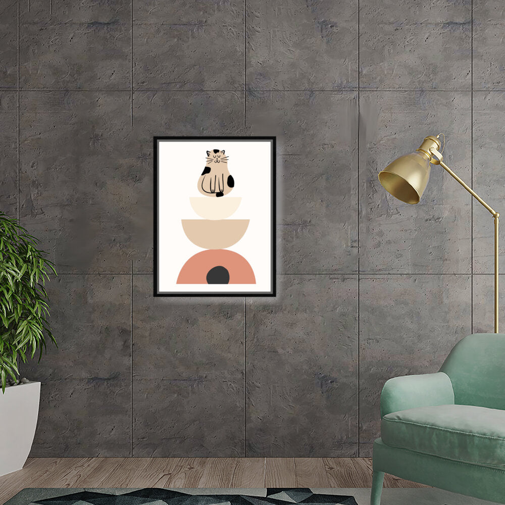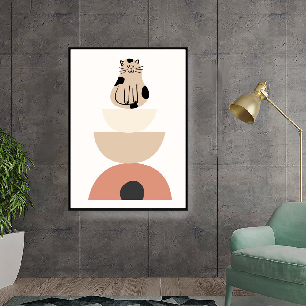 This charming digital illustration features a playful cat sitting atop a stack of geometric shapes, creating a whimsical and contemporary aesthetic perfect for any modern space. The soft color palette adds a cozy touch, making it ideal for living rooms or creative studios.