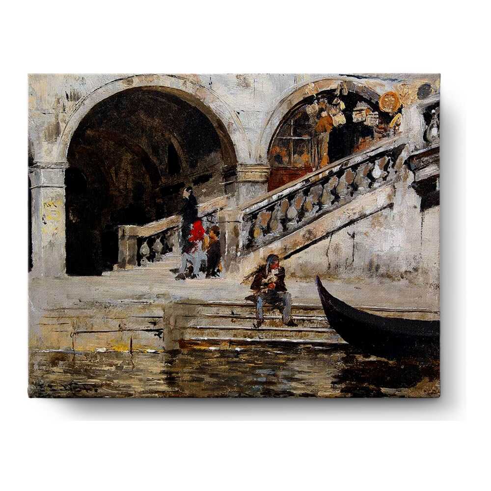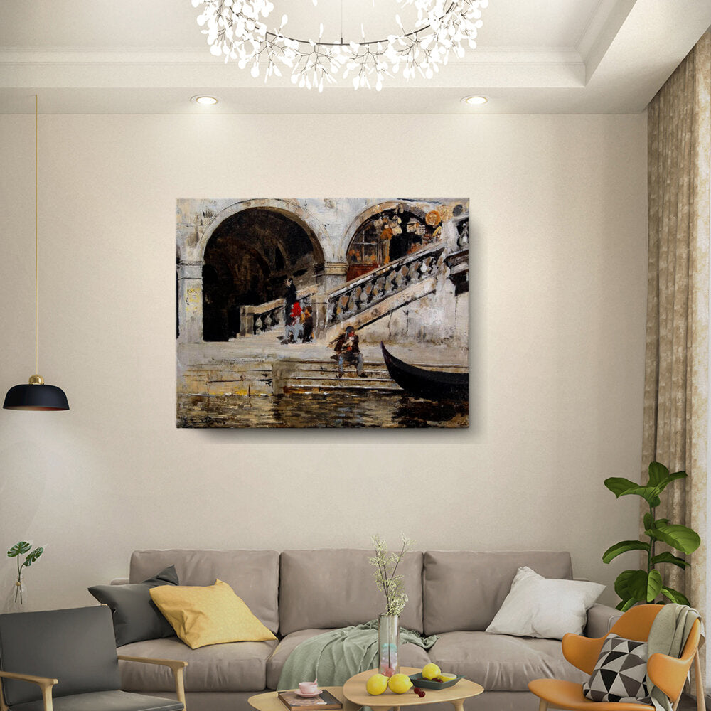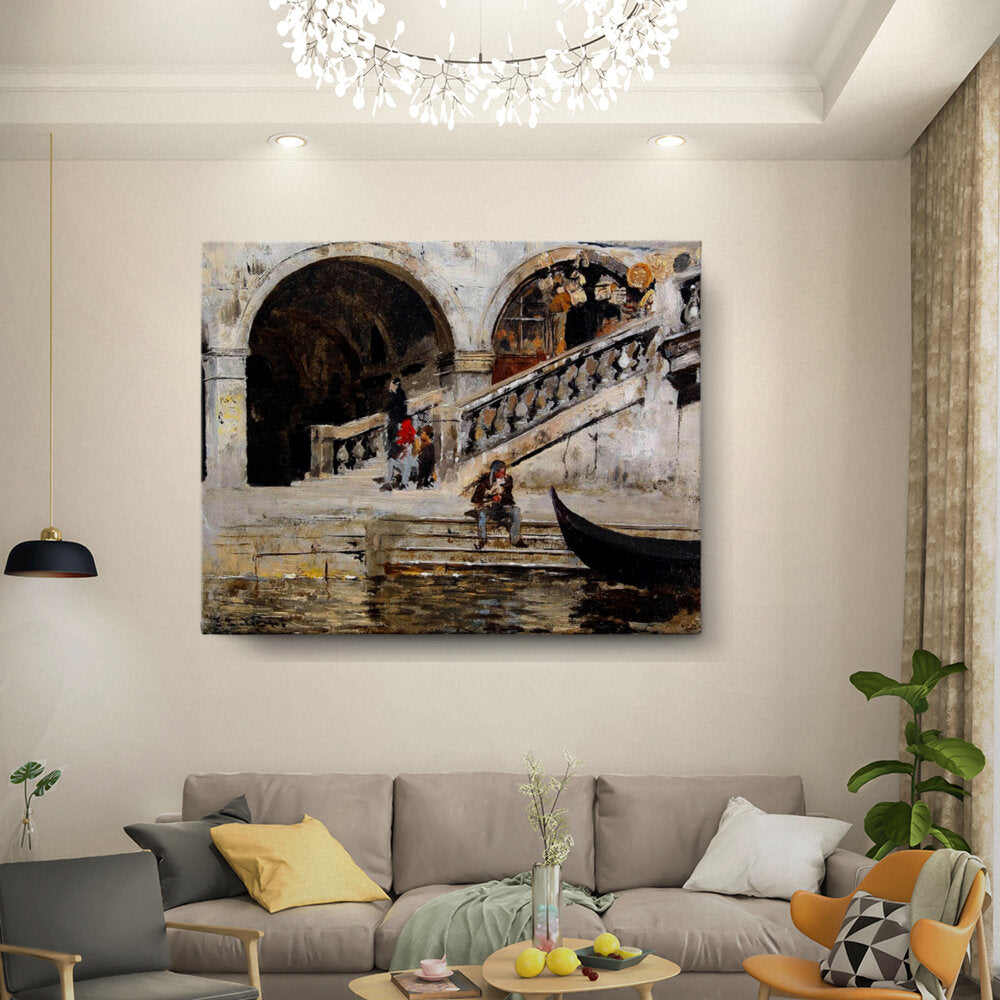 This expressive painting captures a serene moment by the waterfront, highlighting daily life in a historical European setting. The subtle use of light and shadow enhances the tranquil atmosphere, making it an ideal focal point for any living space.