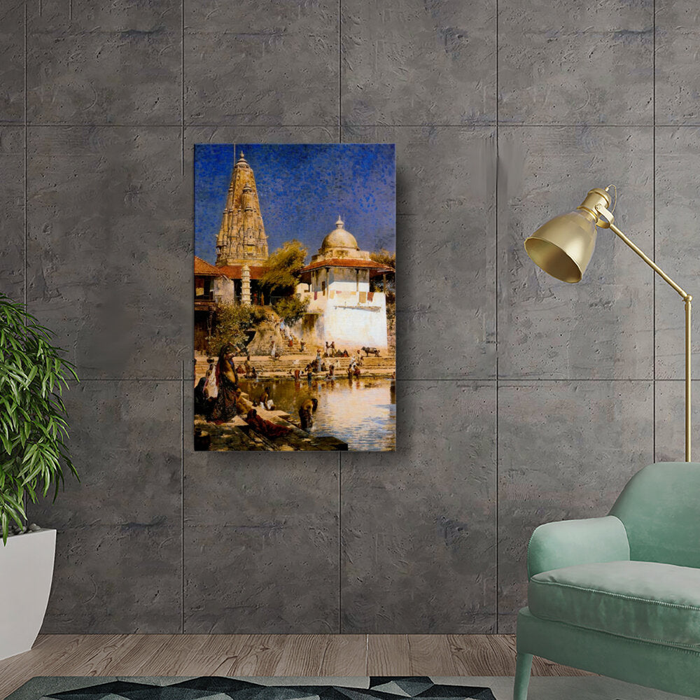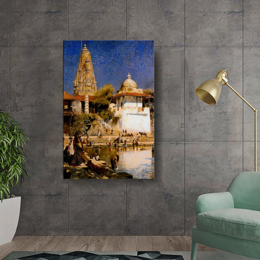 This breathtaking oil painting captures a serene riverside scene filled with vibrant activity. With intricate details of cultural rituals and architectural elegance, it transports the viewer to a traditional Indian setting, highlighting the harmony of nature and community.