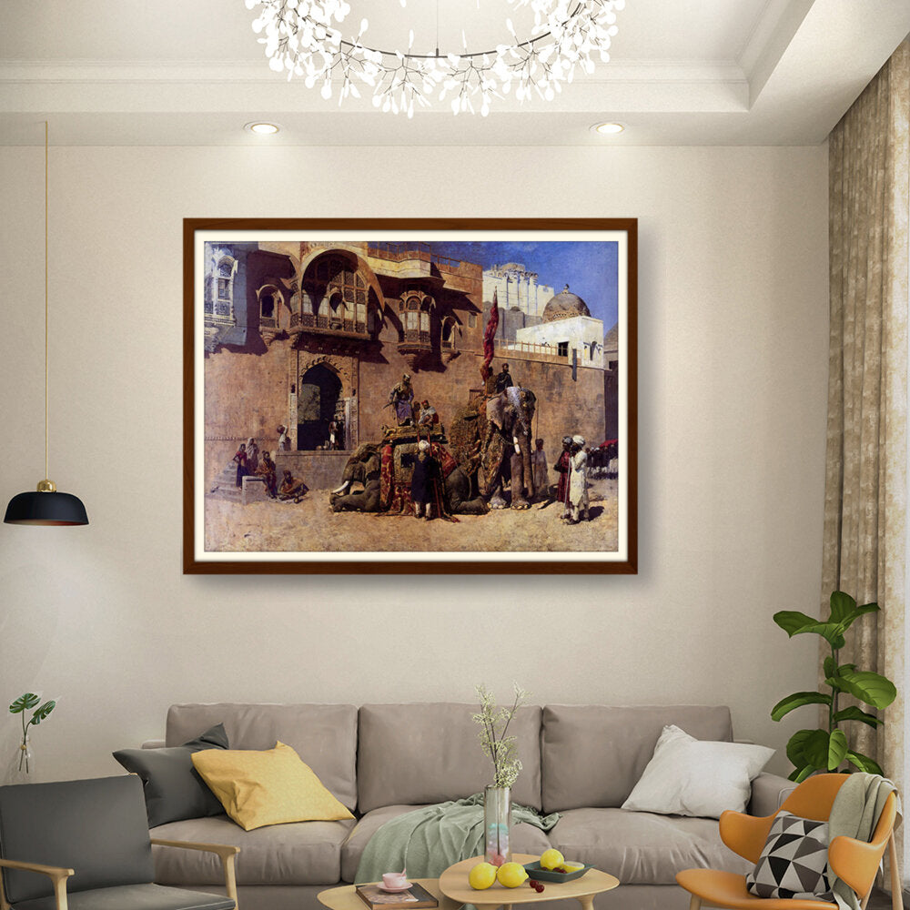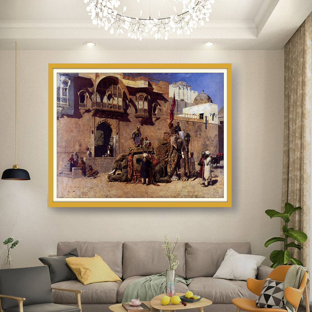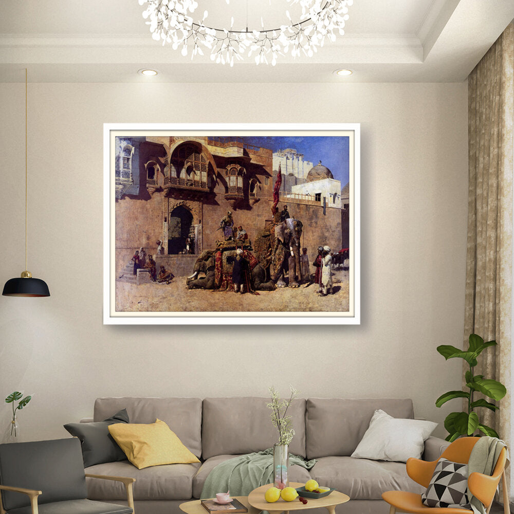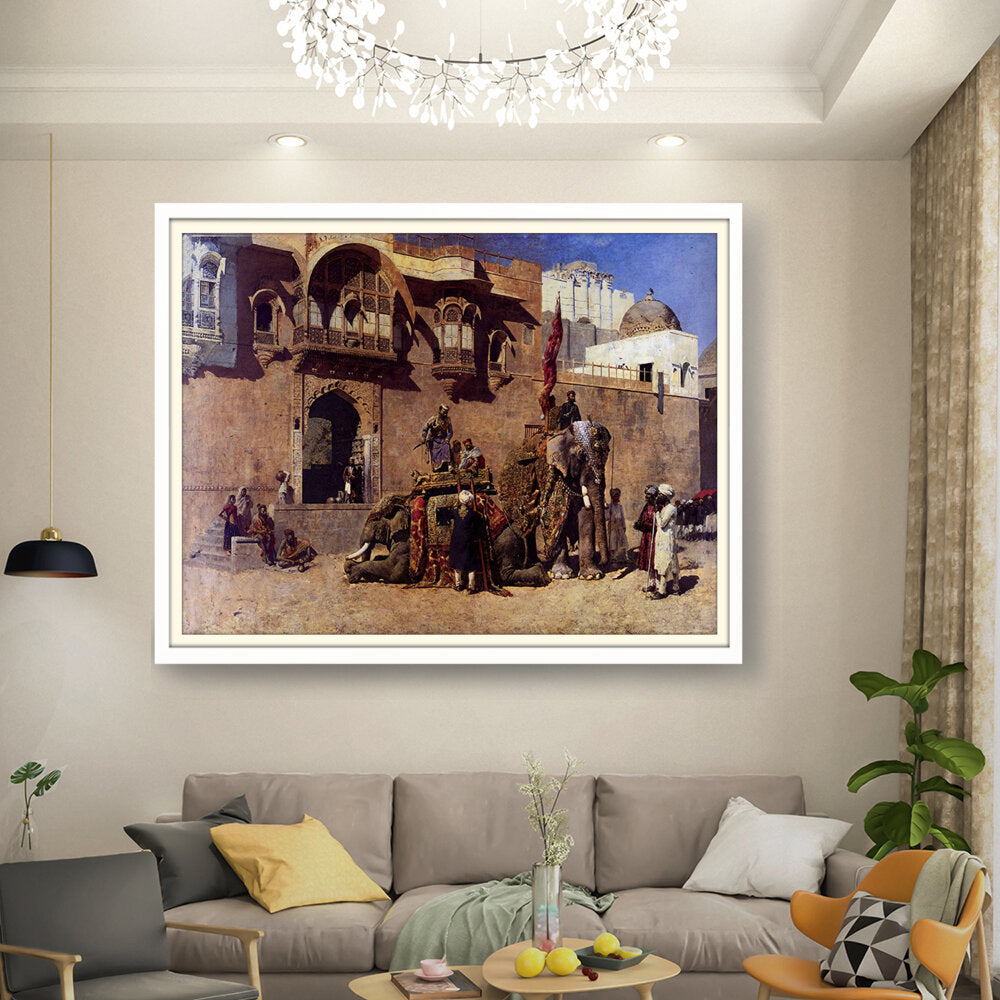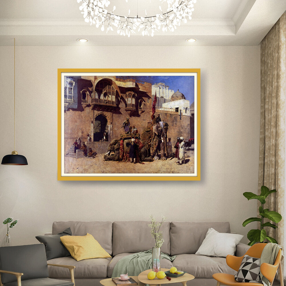 This vibrant oil painting captures a majestic elephant procession in an Indian royal setting, showcasing intricate details of clothing and architecture. The warm palette and rich textures invite viewers into a historical narrative, celebrating India's cultural heritage.