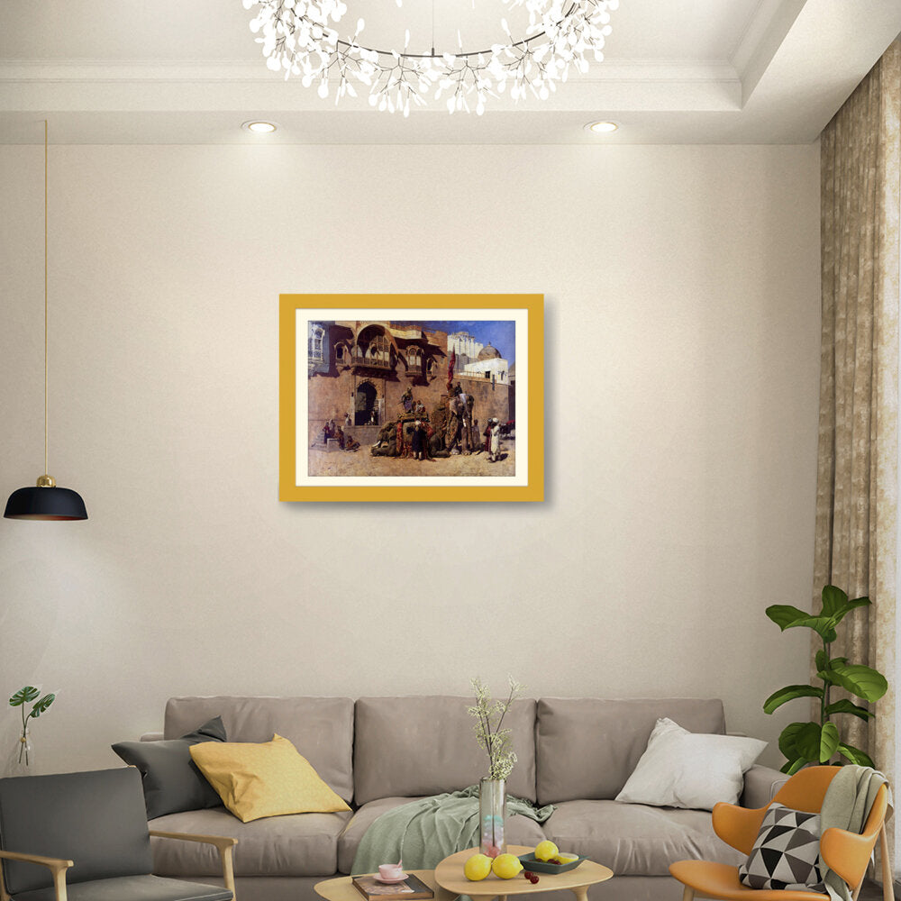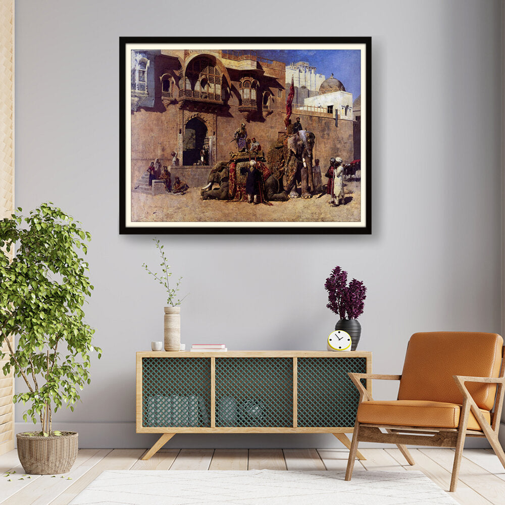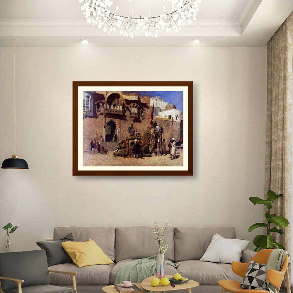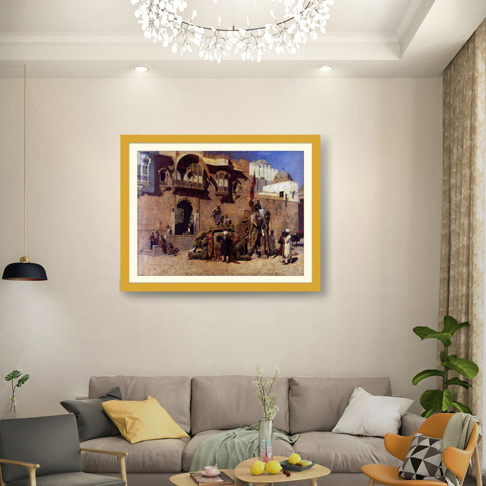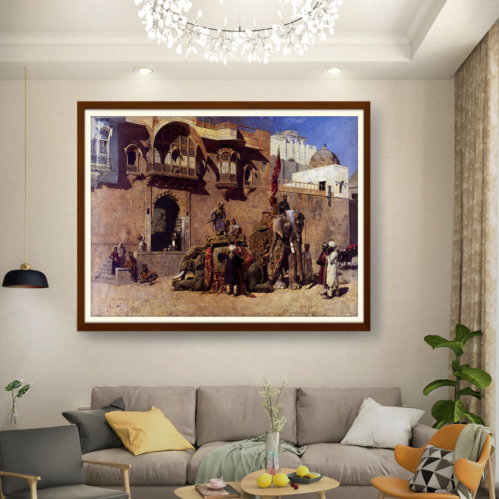 This vibrant oil painting captures a majestic elephant procession in an Indian royal setting, showcasing intricate details of clothing and architecture. The warm palette and rich textures invite viewers into a historical narrative, celebrating India's cultural heritage.