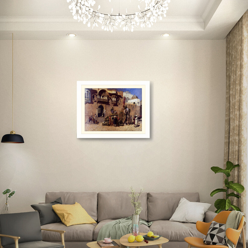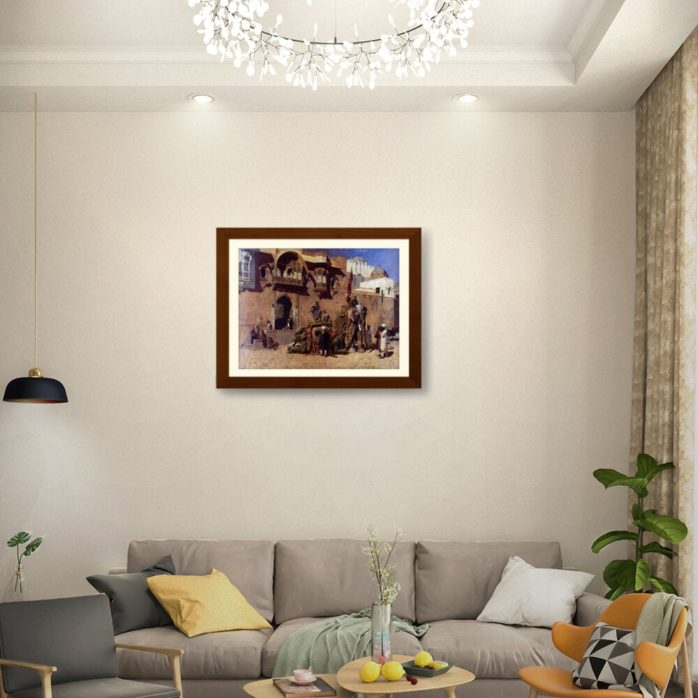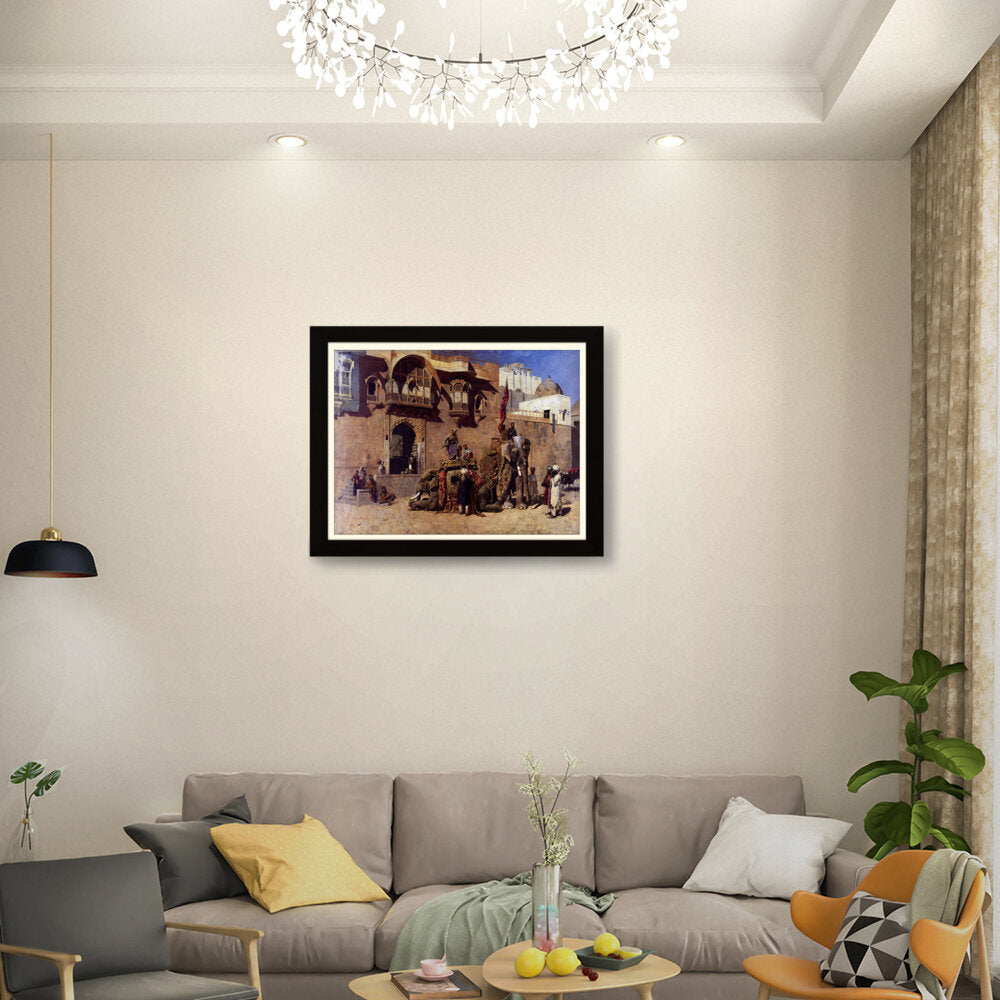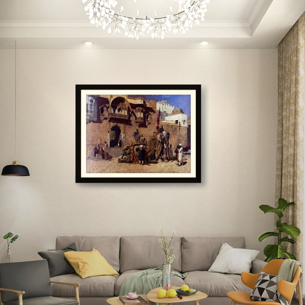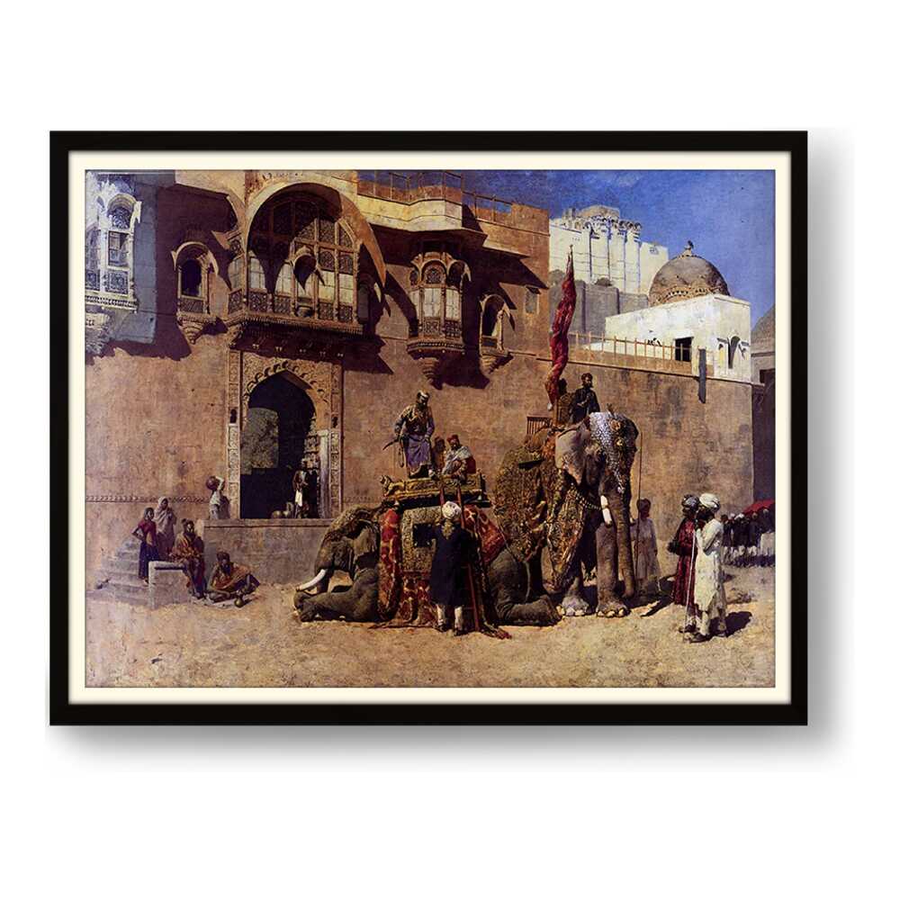 This vibrant oil painting captures a majestic elephant procession in an Indian royal setting, showcasing intricate details of clothing and architecture. The warm palette and rich textures invite viewers into a historical narrative, celebrating India's cultural heritage.