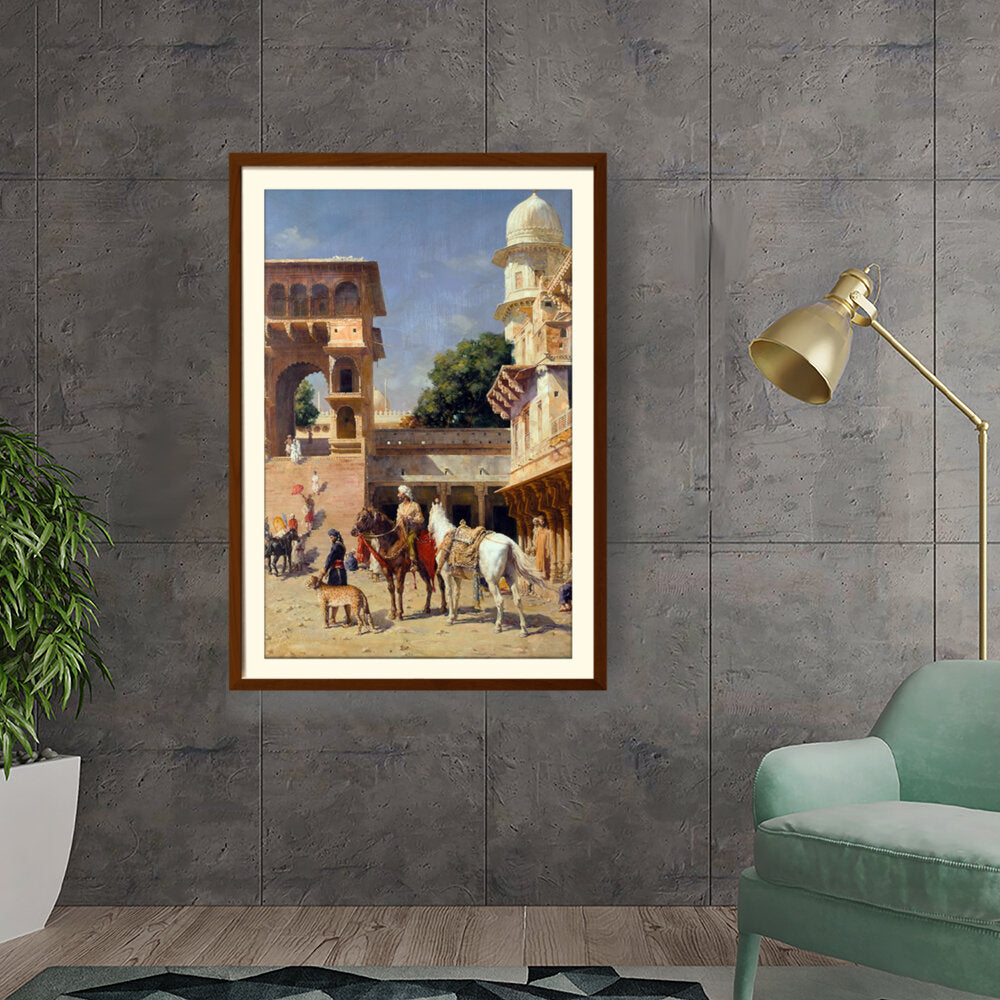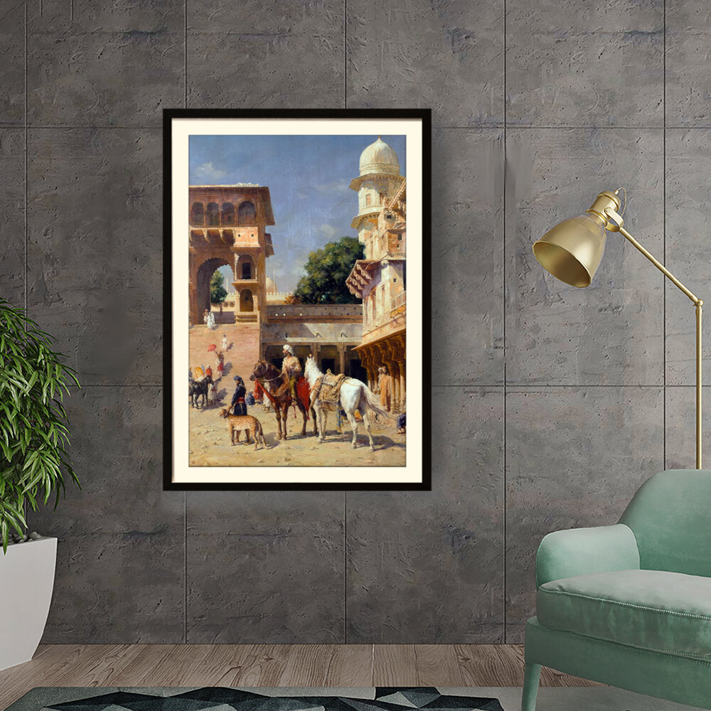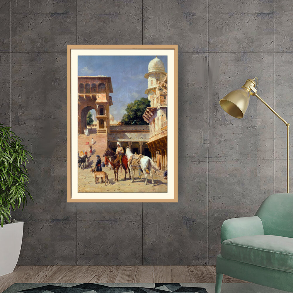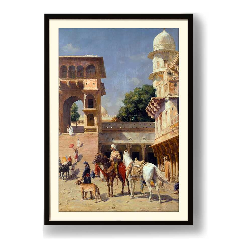 This captivating oil painting depicts a royal procession in India, showcasing intricate architecture and historical attire. The vibrant colors and detailed figures bring the scene to life, inviting viewers to explore the rich cultural heritage. Ideal for any space that values history and artistry.
