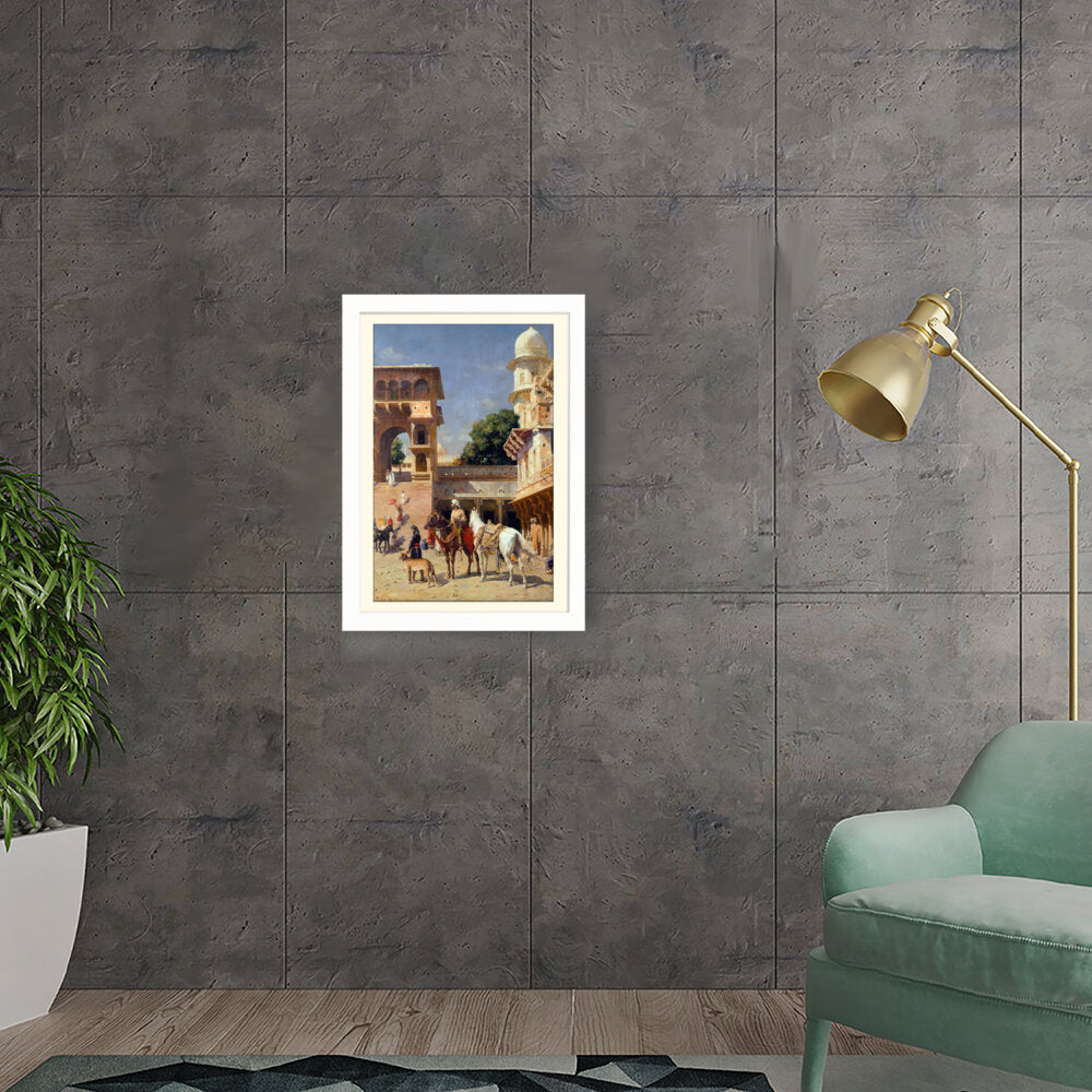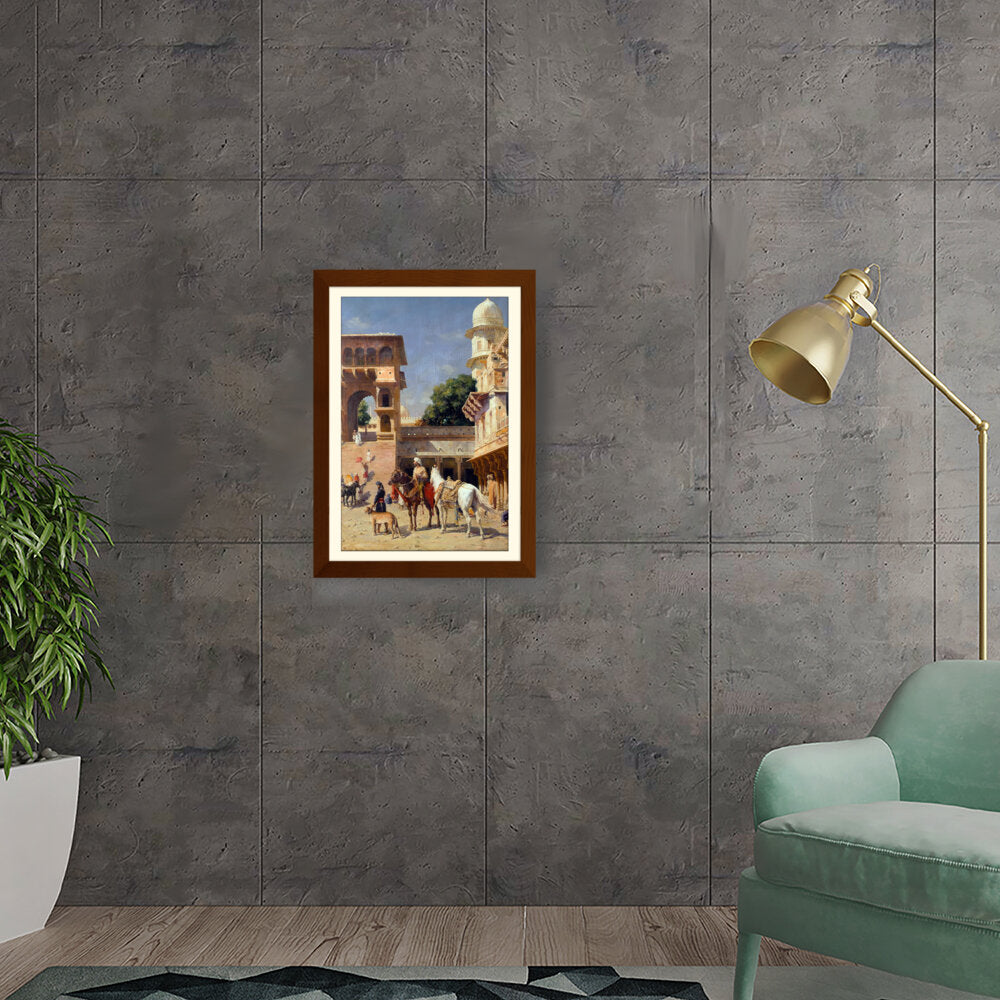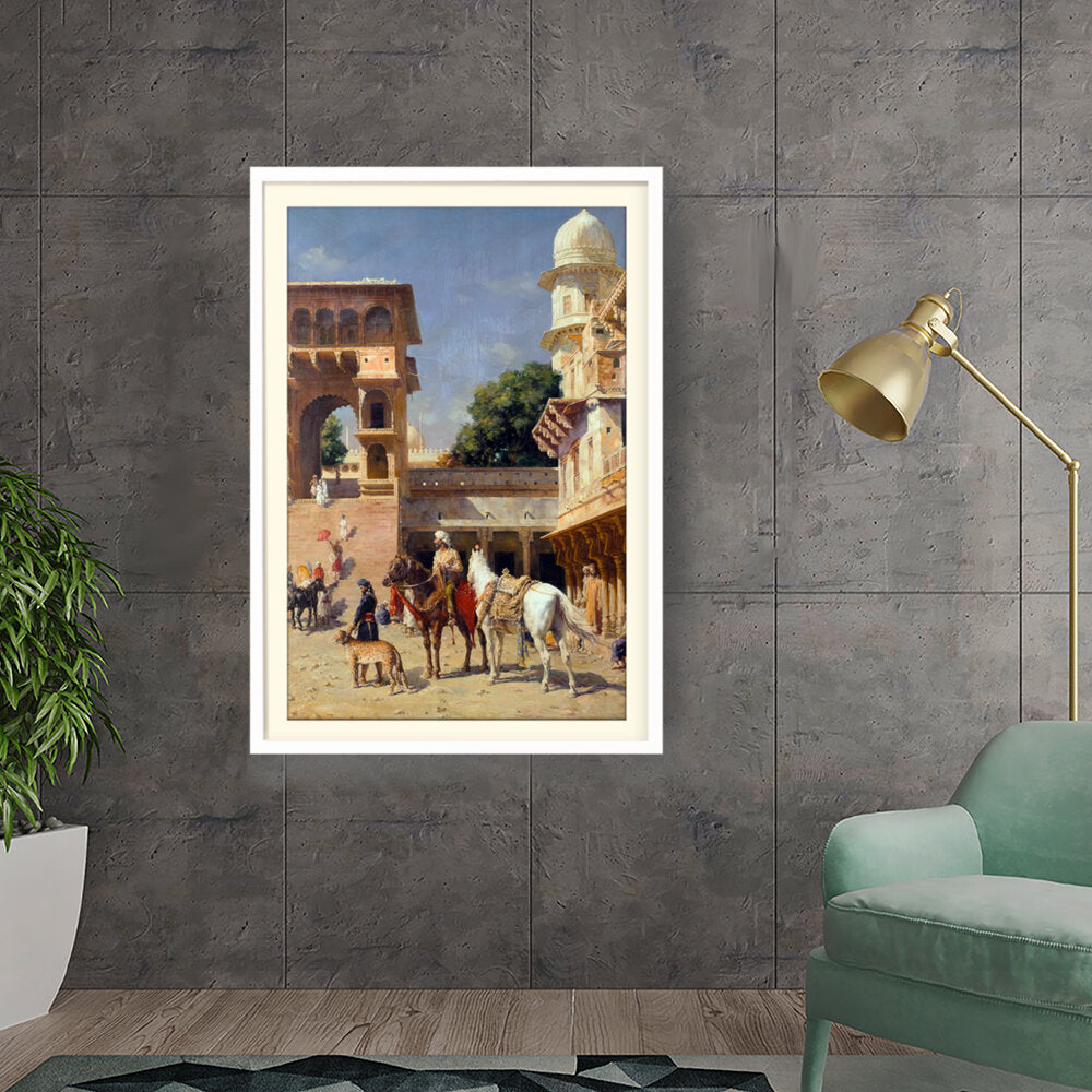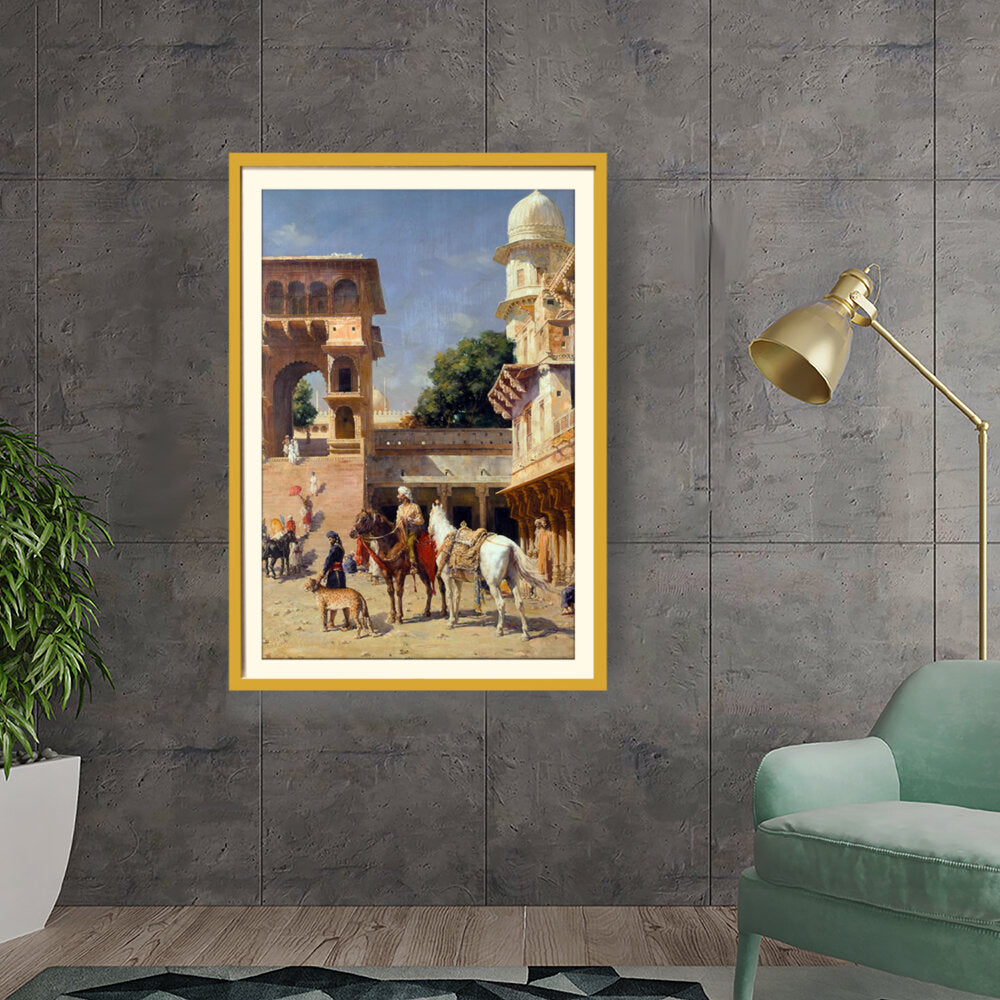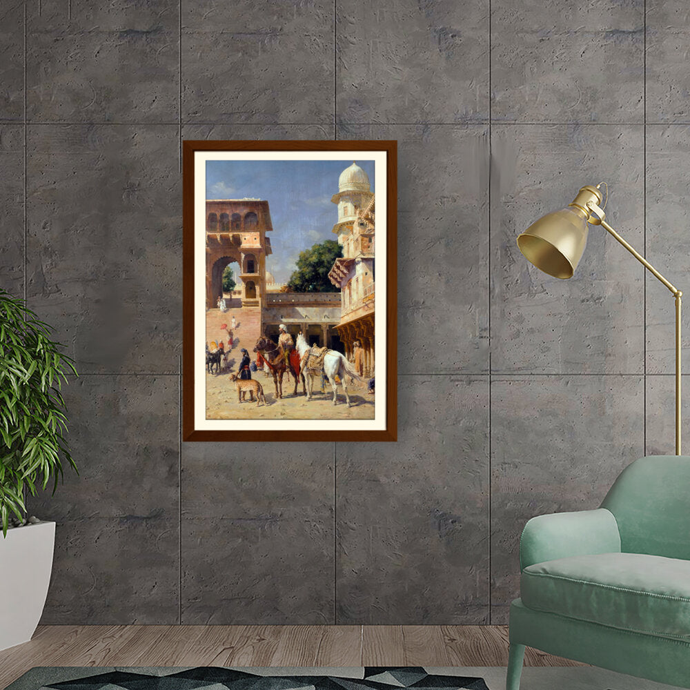 This captivating oil painting depicts a royal procession in India, showcasing intricate architecture and historical attire. The vibrant colors and detailed figures bring the scene to life, inviting viewers to explore the rich cultural heritage. Ideal for any space that values history and artistry.