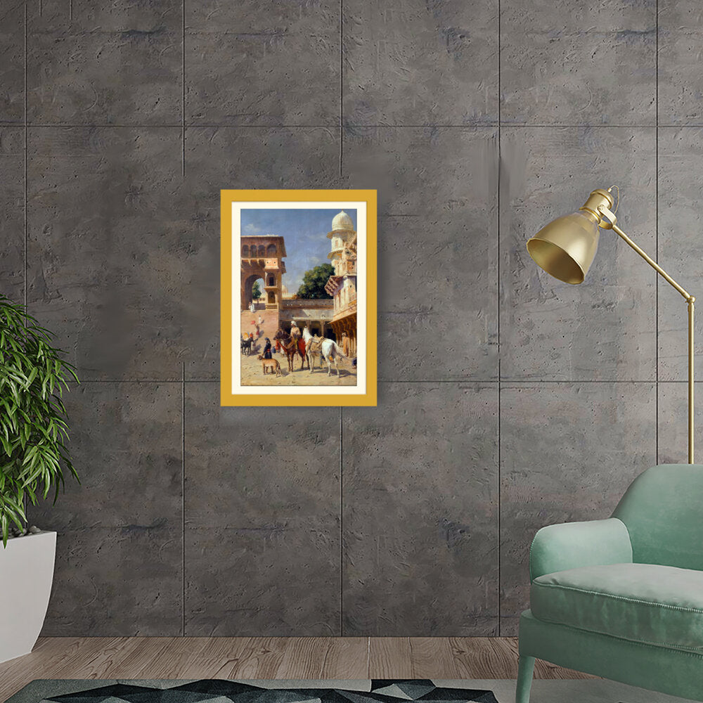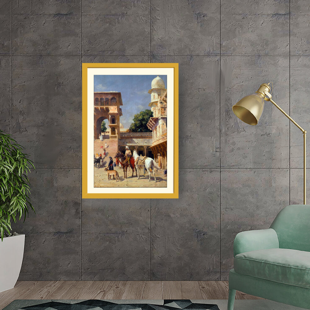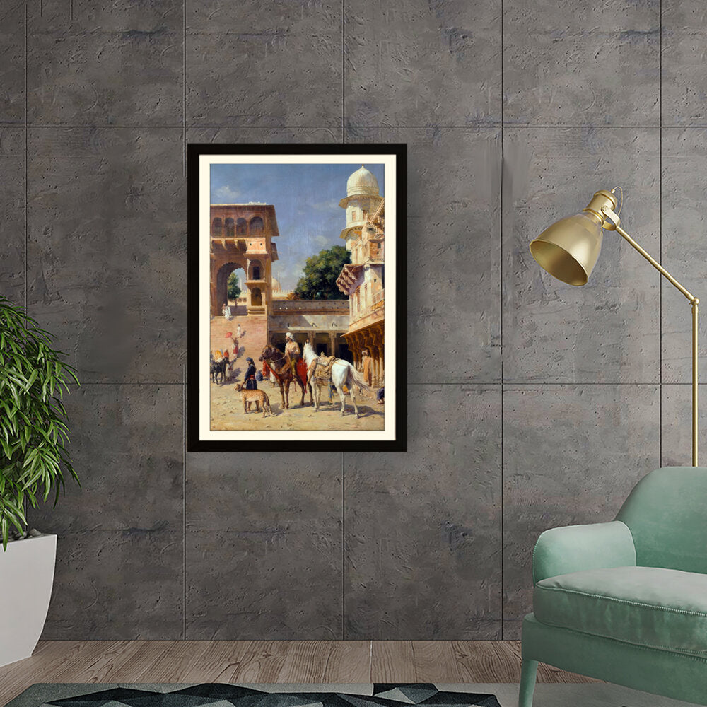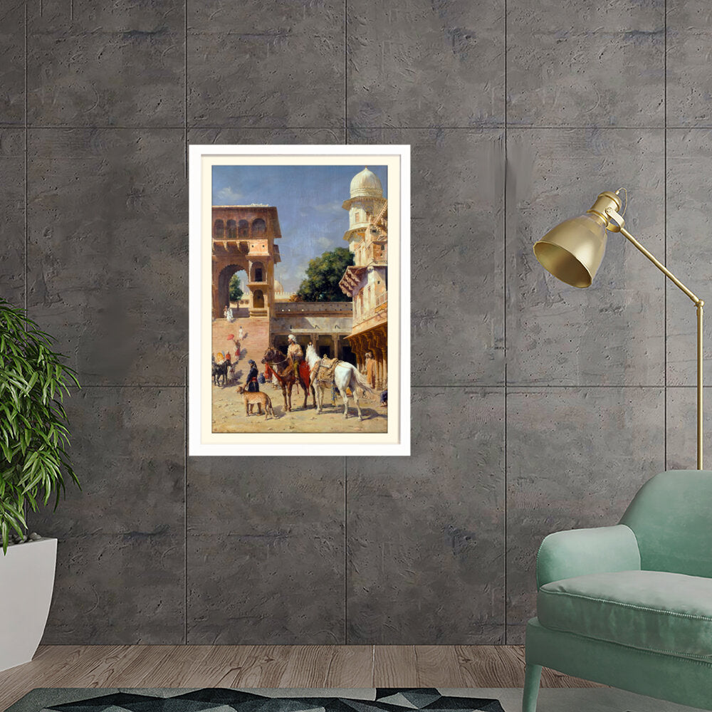 This captivating oil painting depicts a royal procession in India, showcasing intricate architecture and historical attire. The vibrant colors and detailed figures bring the scene to life, inviting viewers to explore the rich cultural heritage. Ideal for any space that values history and artistry.